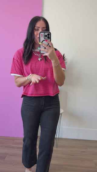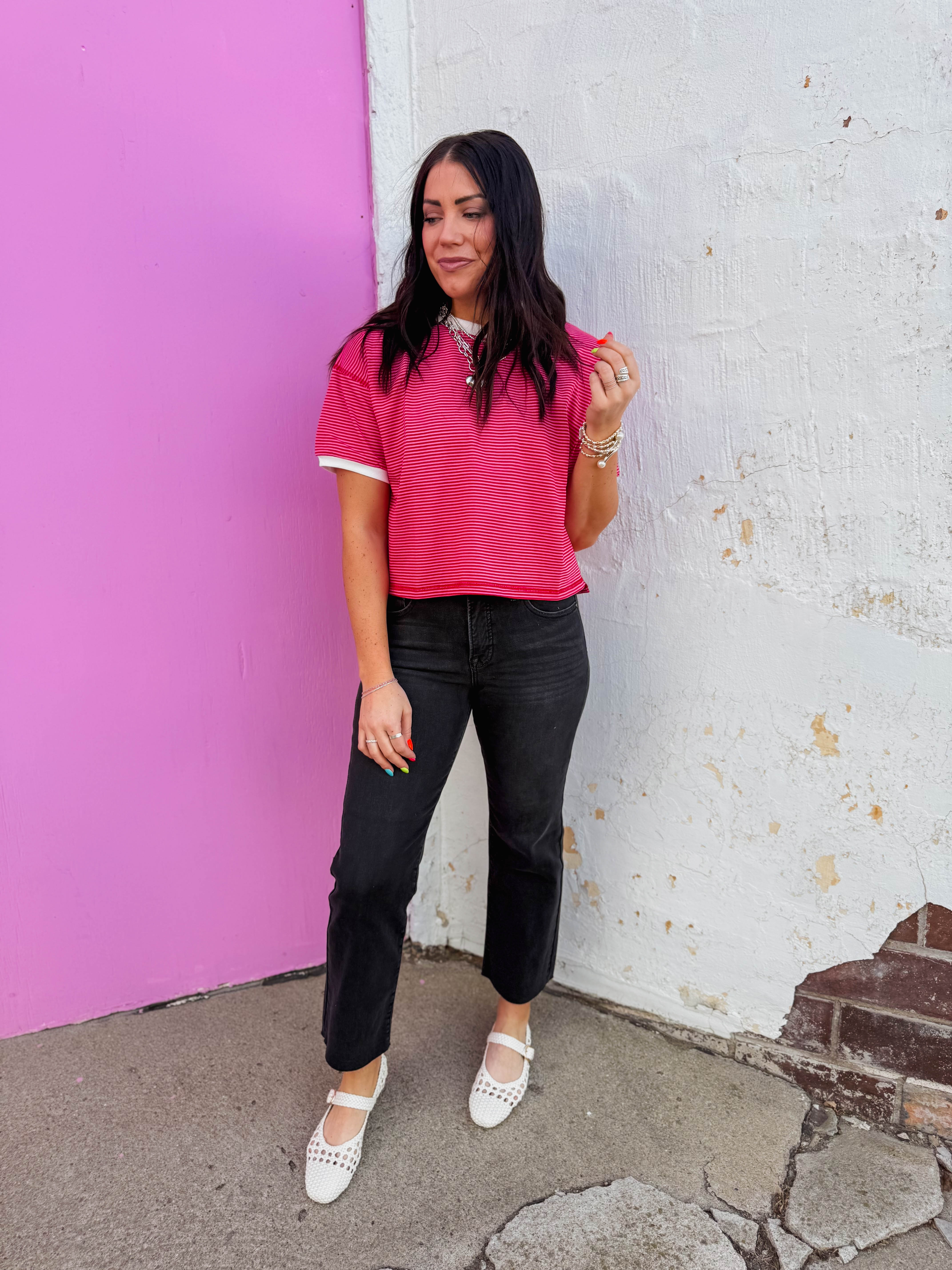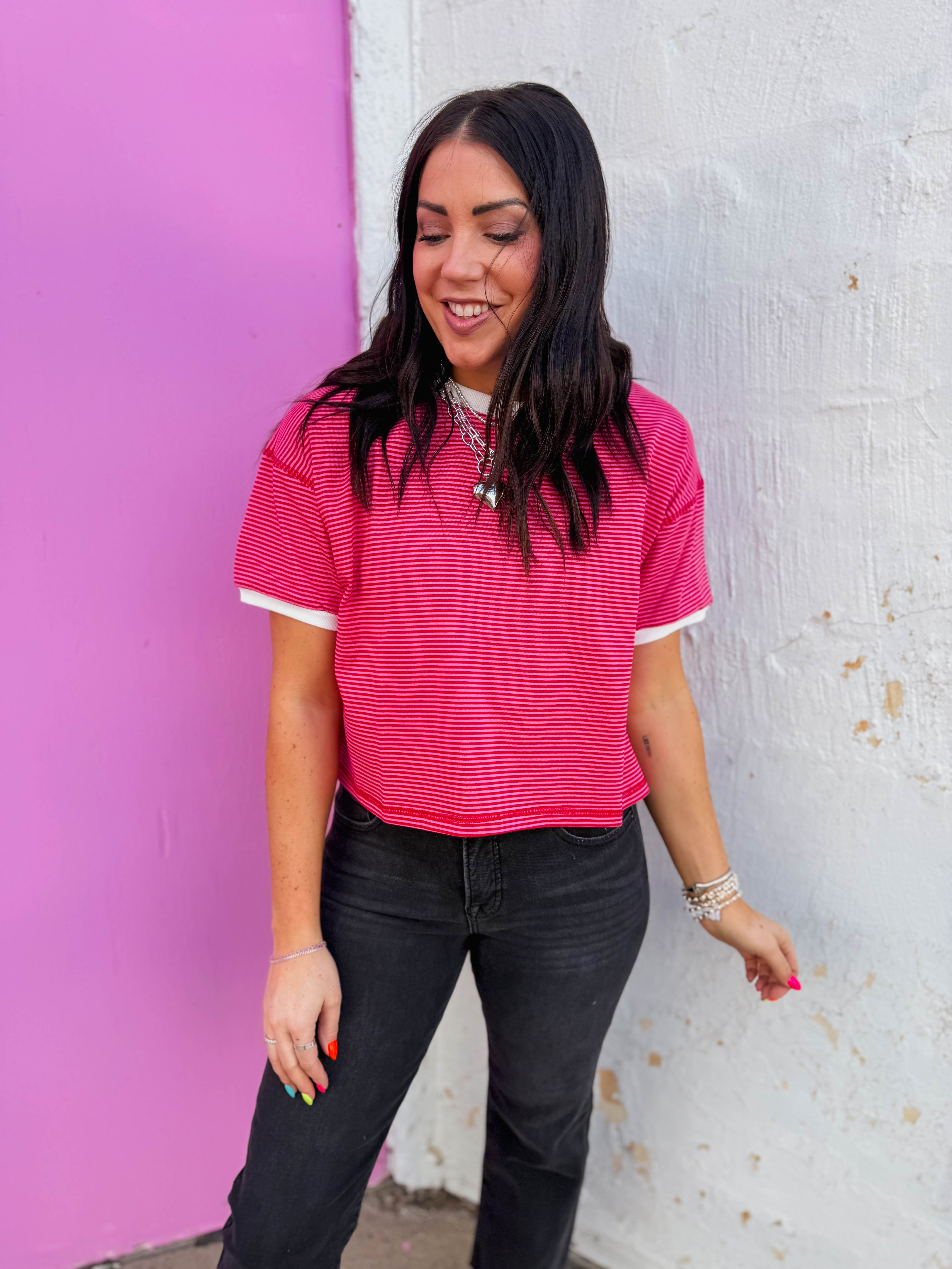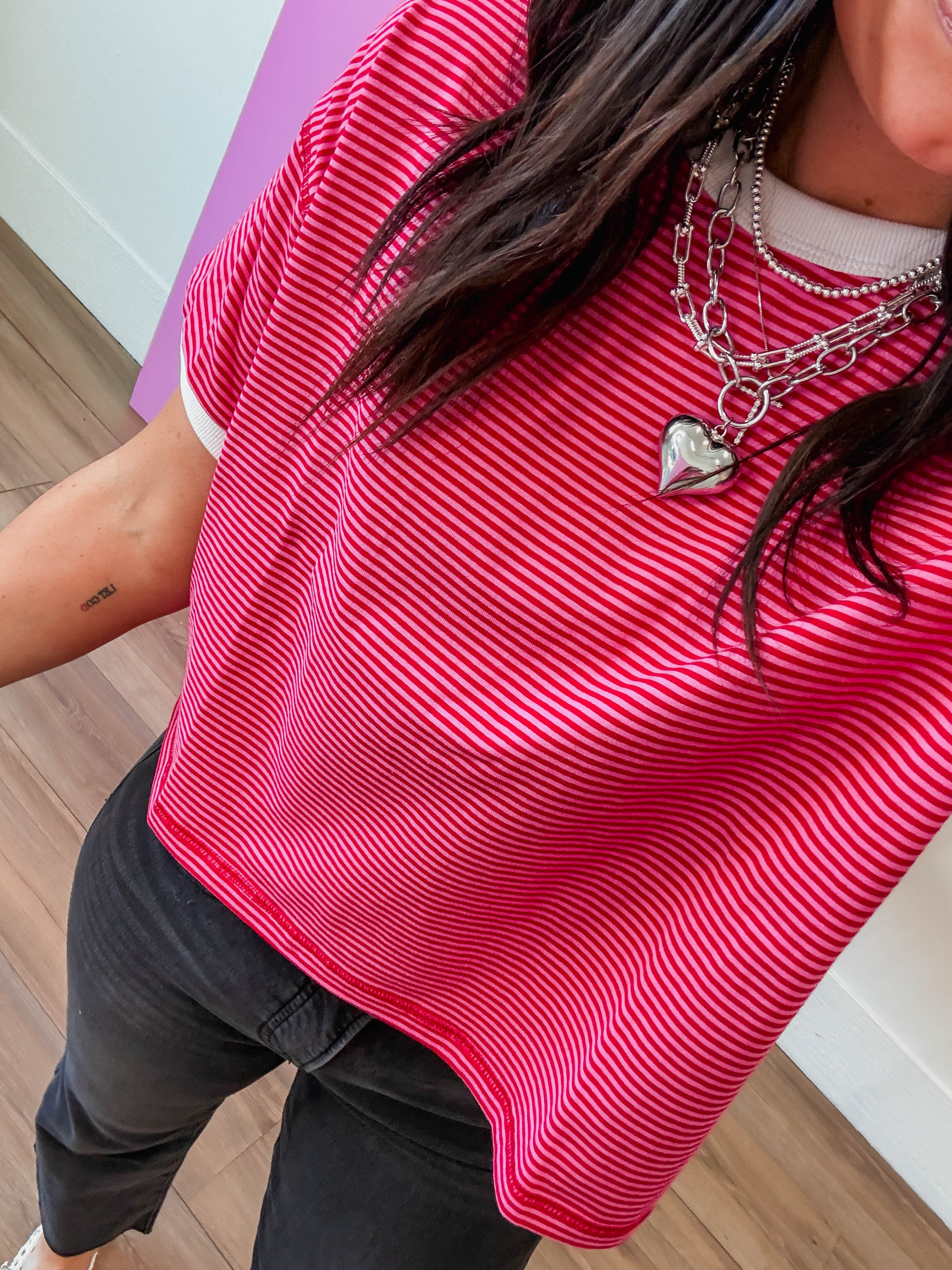Rock a striped tee that brings instant personality to your warm-weather rotation. With bold lines and a vibrant pop of color, this casual essential pairs effortlessly with everything from shorts to linen pants. Perfect for spring and summer styling, it's the kind of laid-back piece that feels cool without trying.