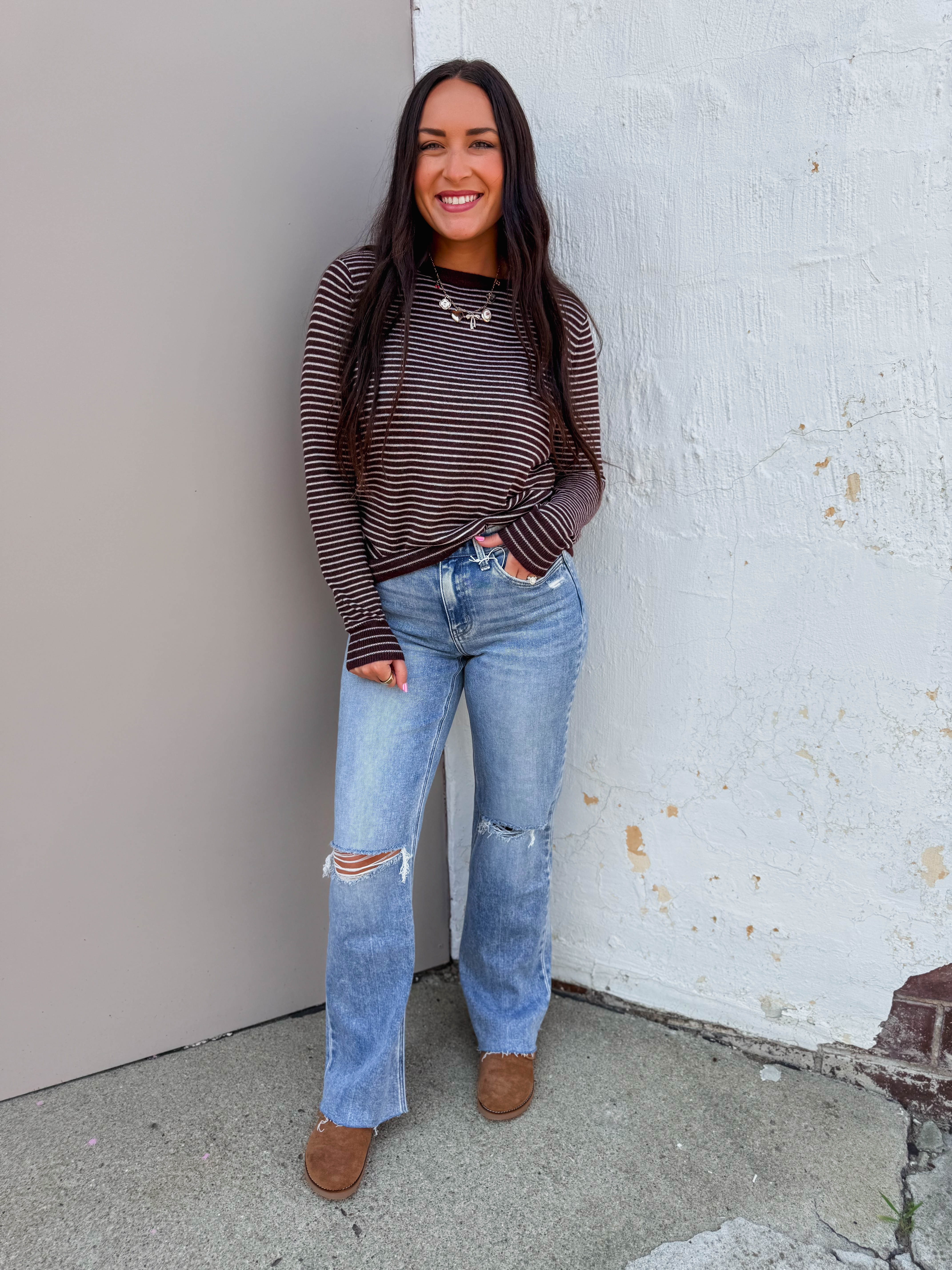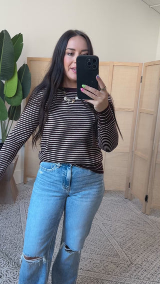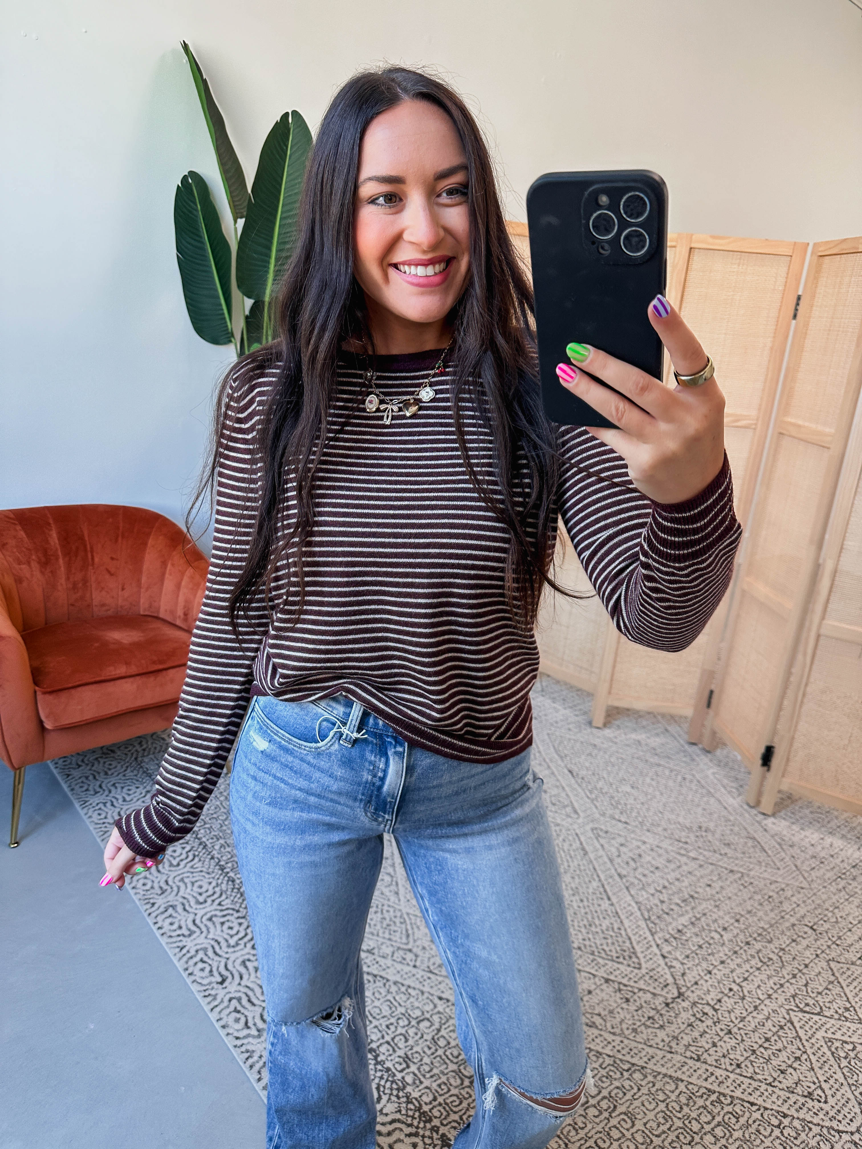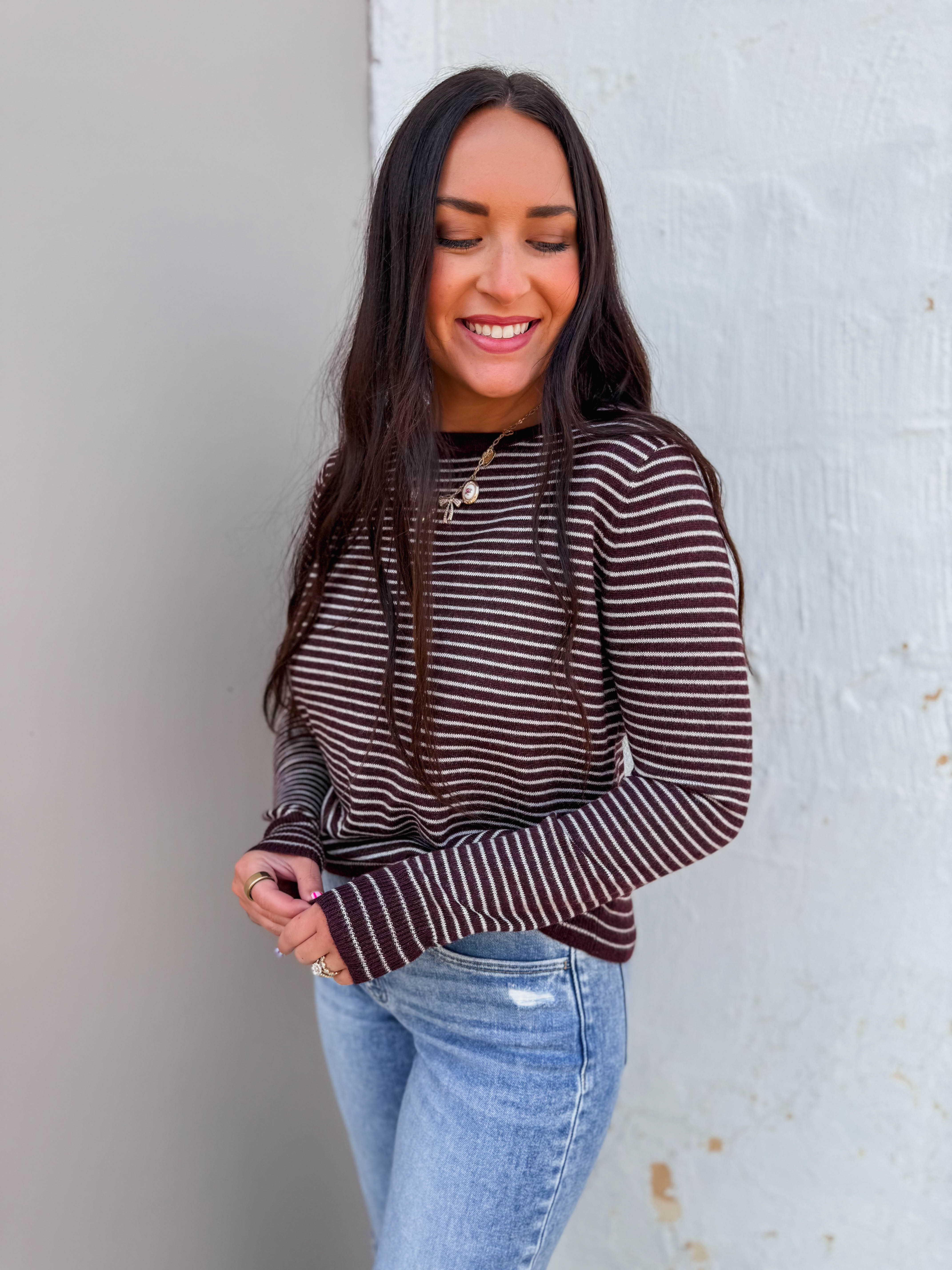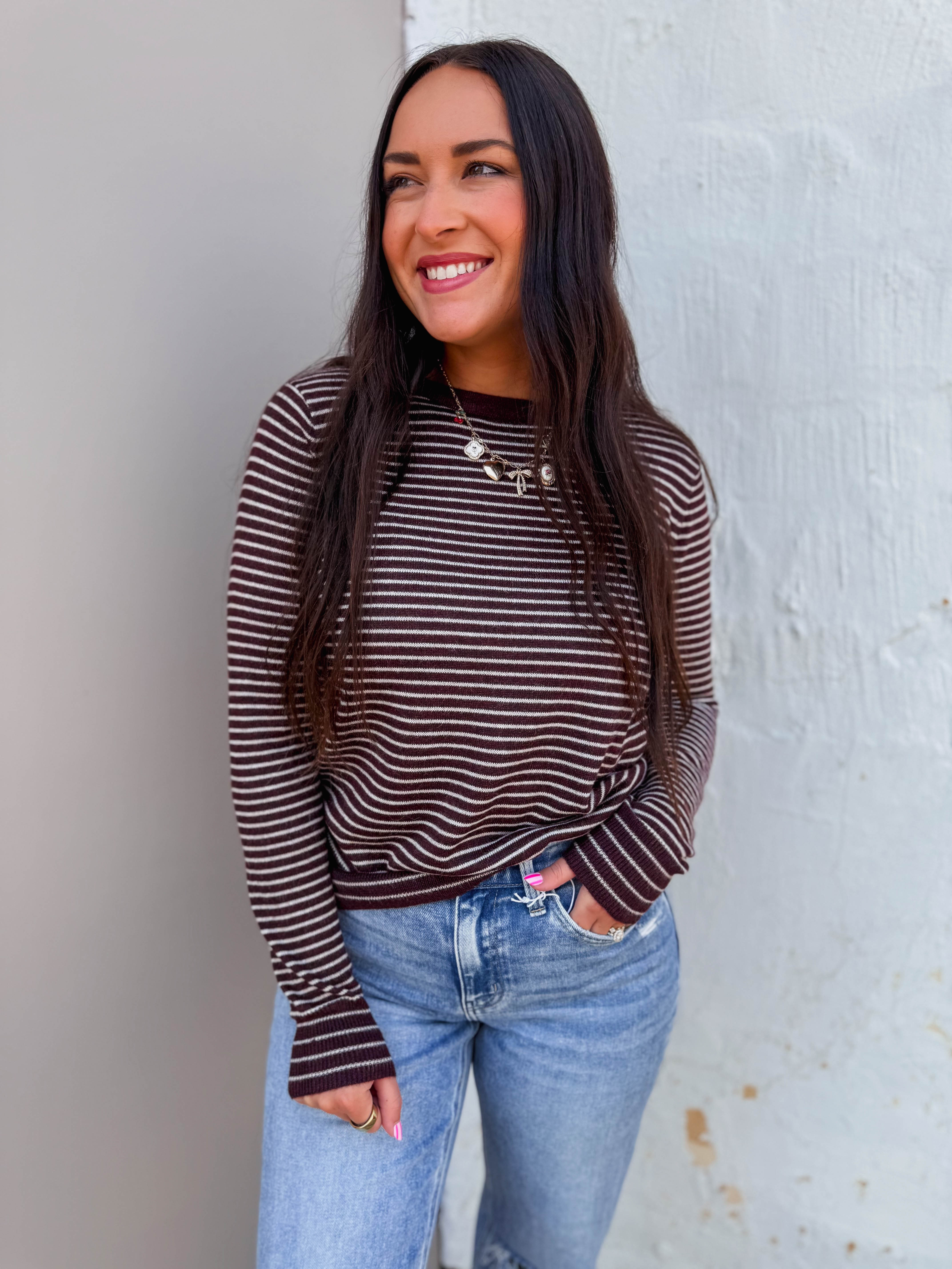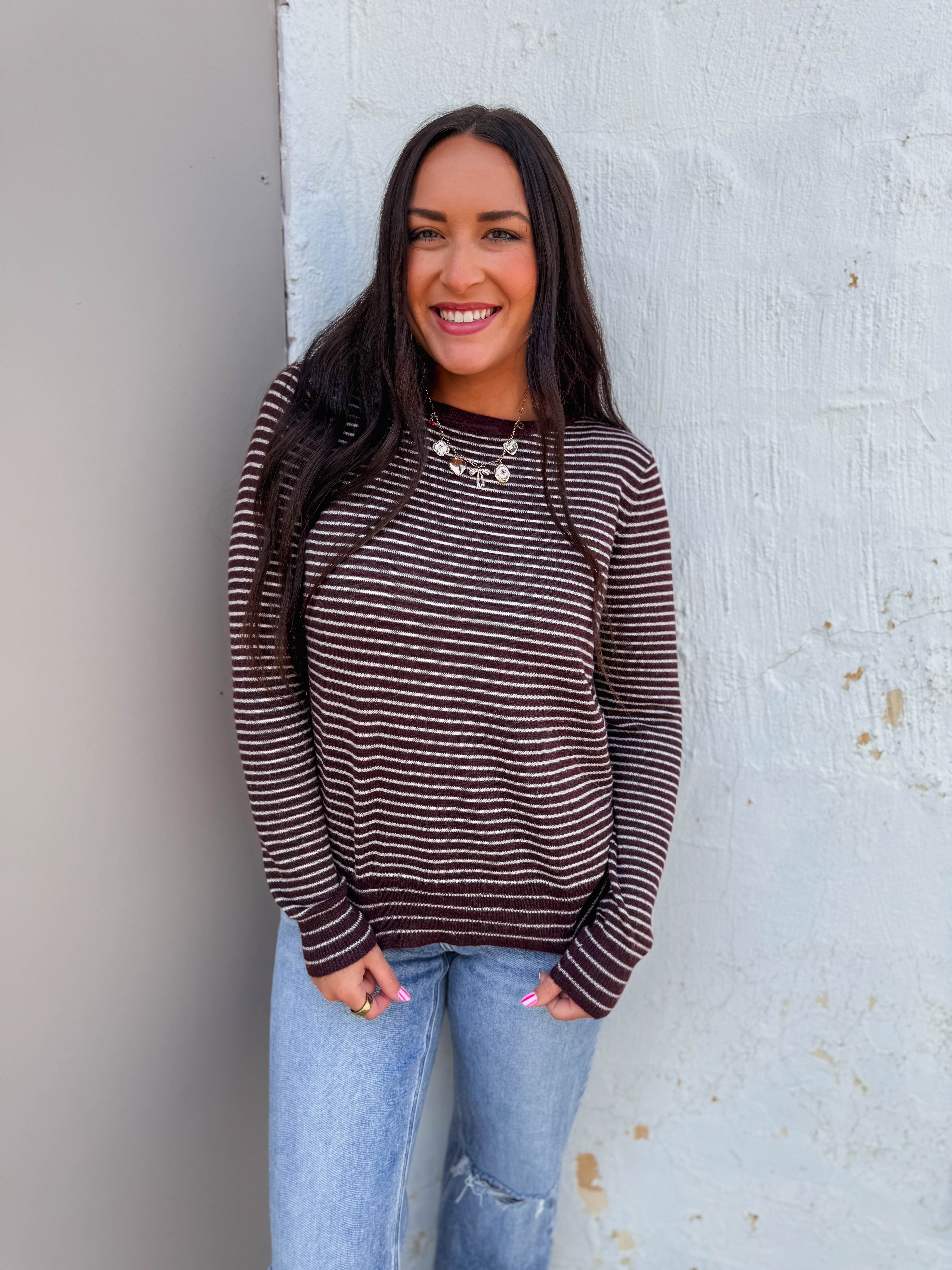 The Mandy Striped Sweater in Dark Plum features a cozy crew neckline and long sleeves, perfect for all-day comfort. With playful contrast trim and classic pinstripes, it effortlessly transitions from work to weekend. Your new go-to for everyday style!