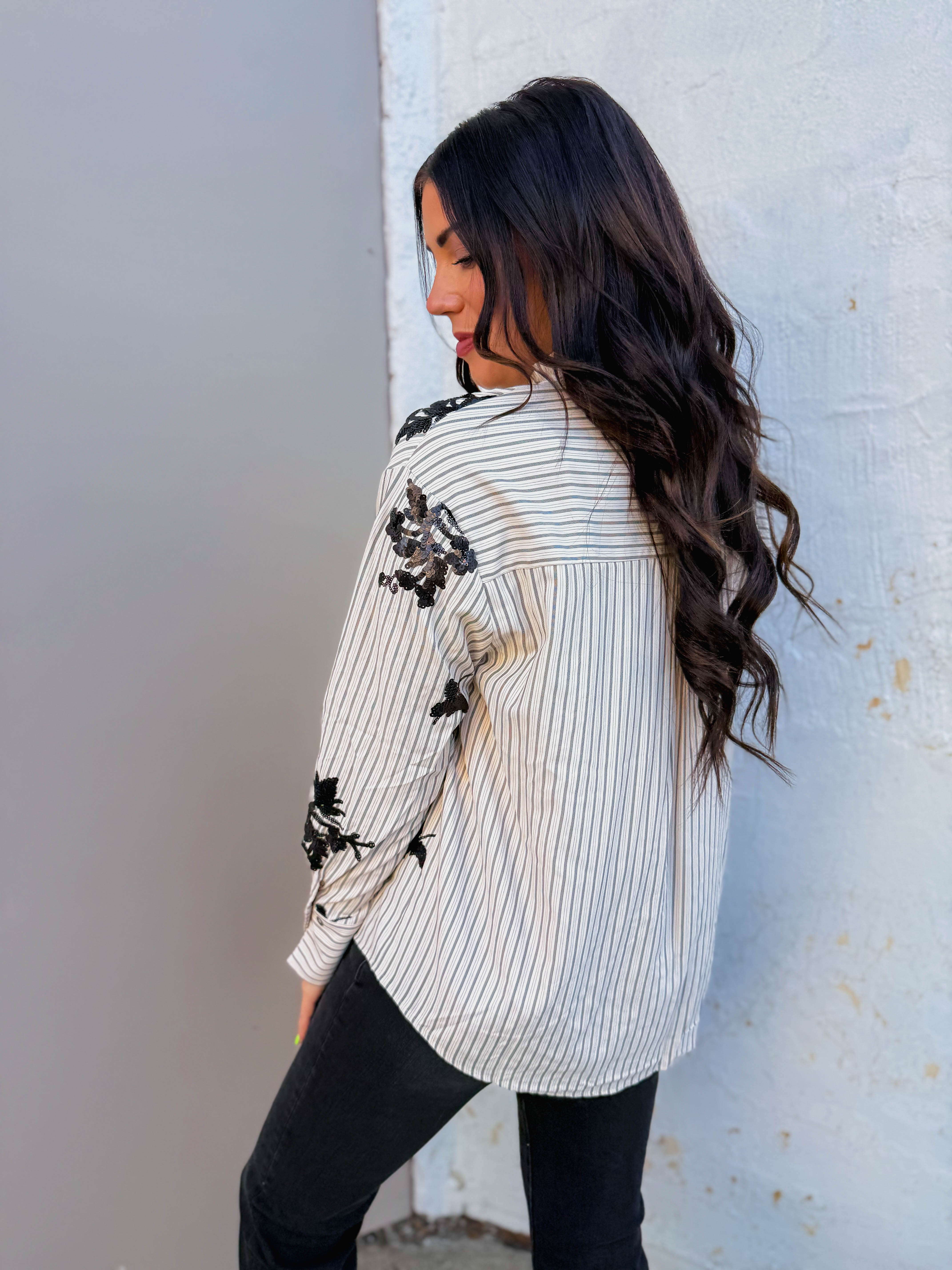 Elevate your style with the Natalia Floral Top, featuring a ruffled band collar and charming floral applique embroidery. Its striped pattern and buttoned cuffs add a polished touch, while fun sequins bring holiday sparkle. Perfect for work or weekend adventures, this blouse blends playful details with effortless wearability.