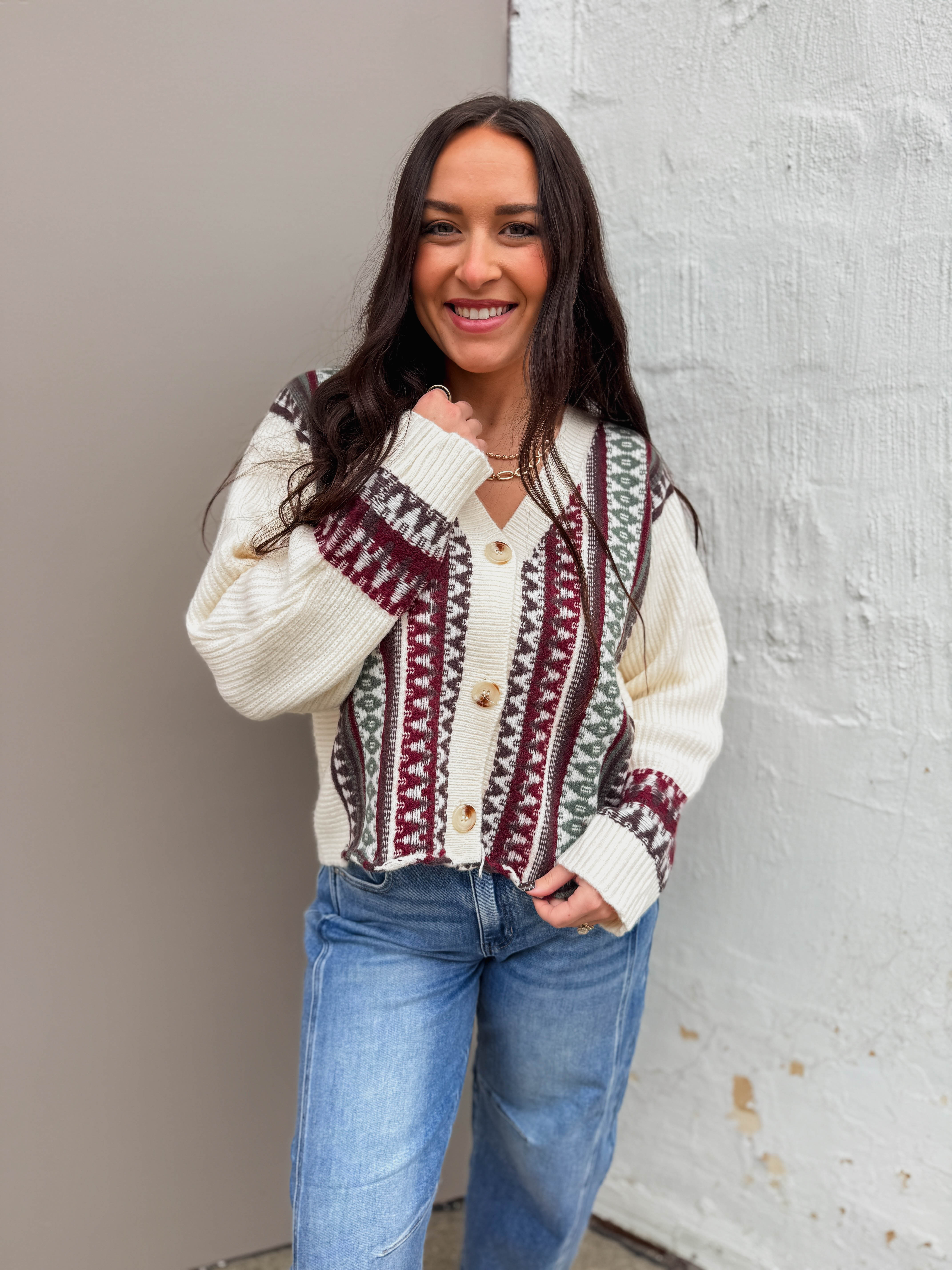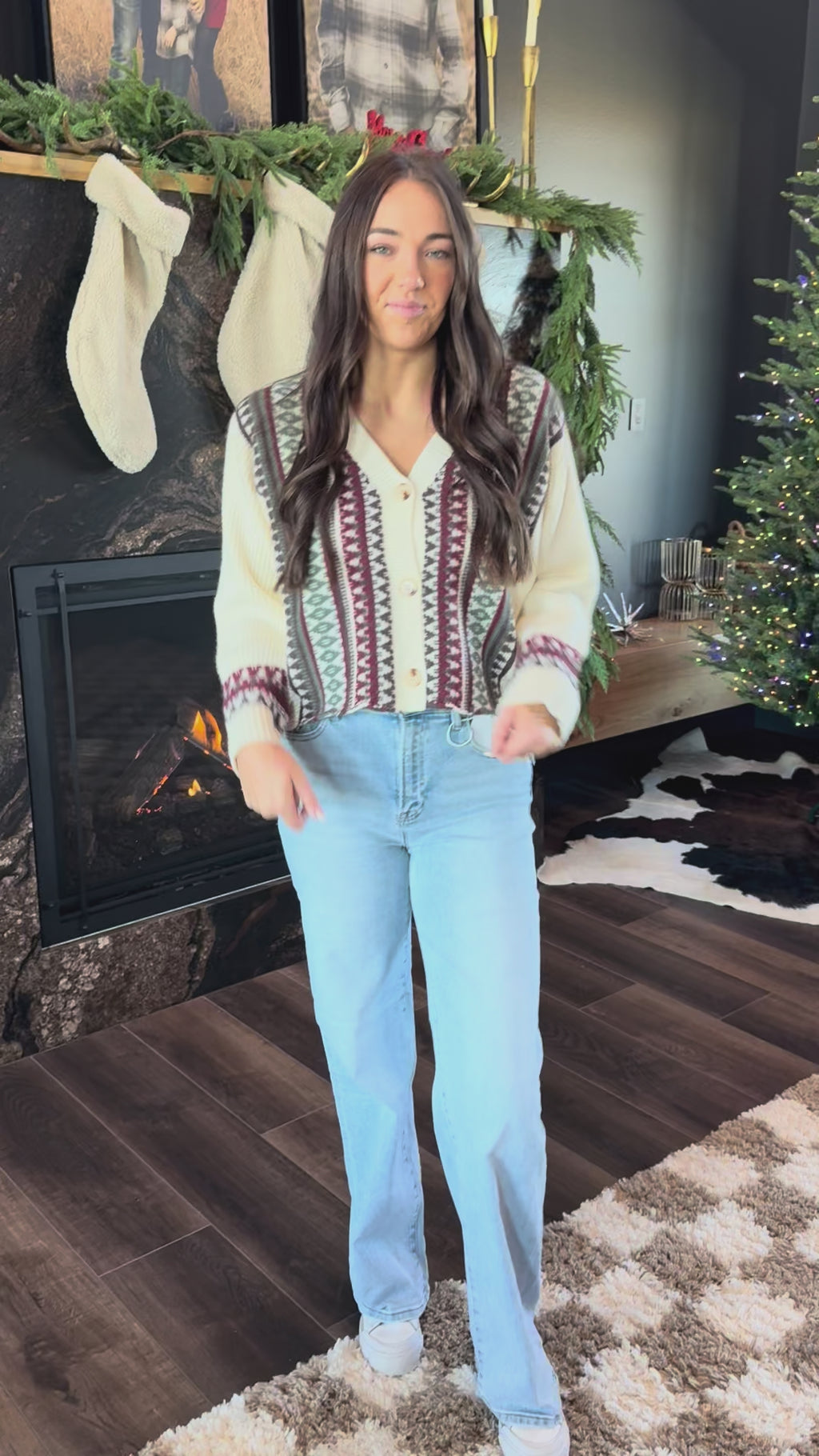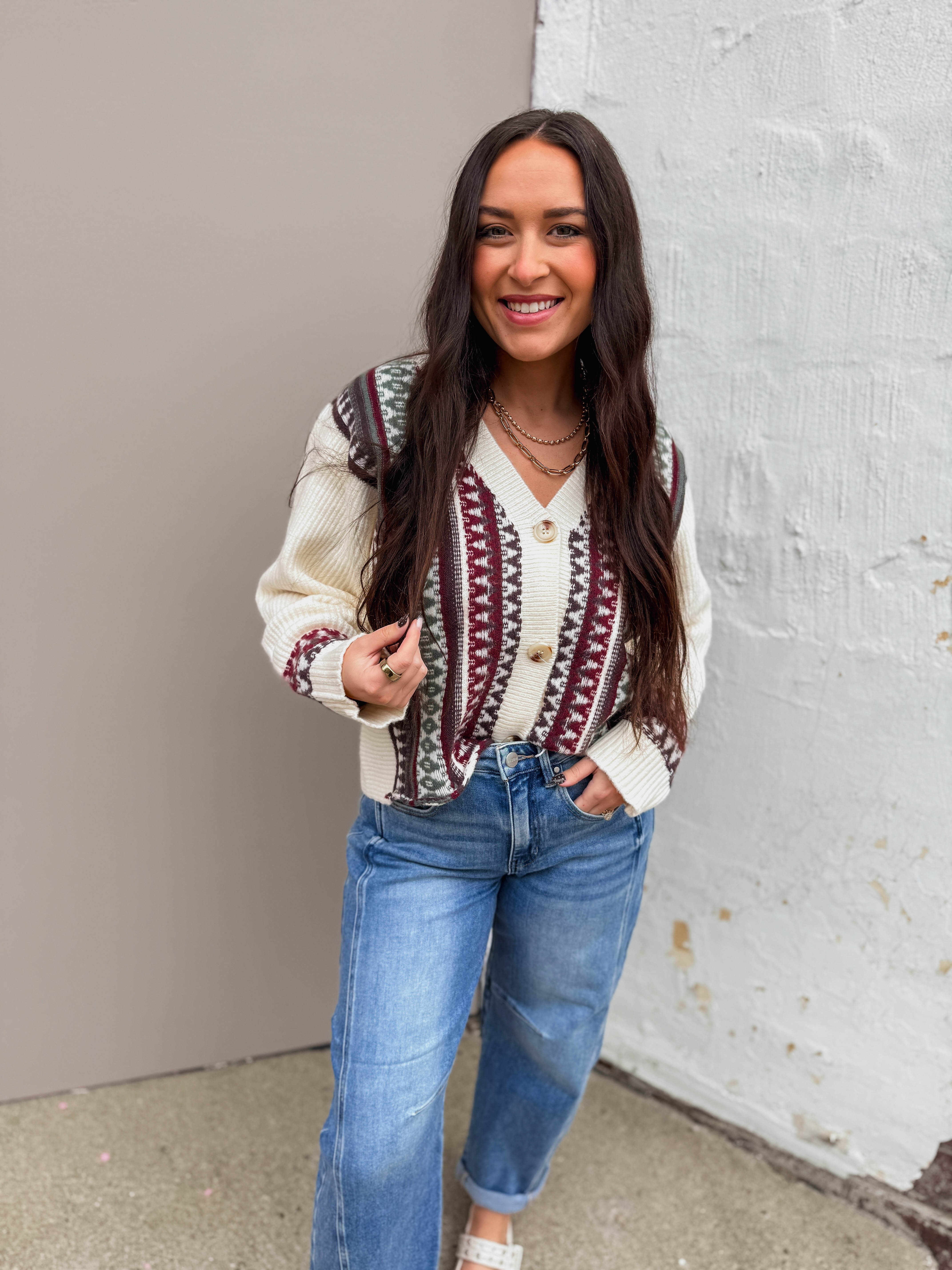 Cozy up in the Rhett Cardigan, featuring a flattering V-neckline and easy button front. Its long sleeves and cheerful multicolor pattern make it perfect for workdays or weekend fun. Stylishly cute for the holiday season!