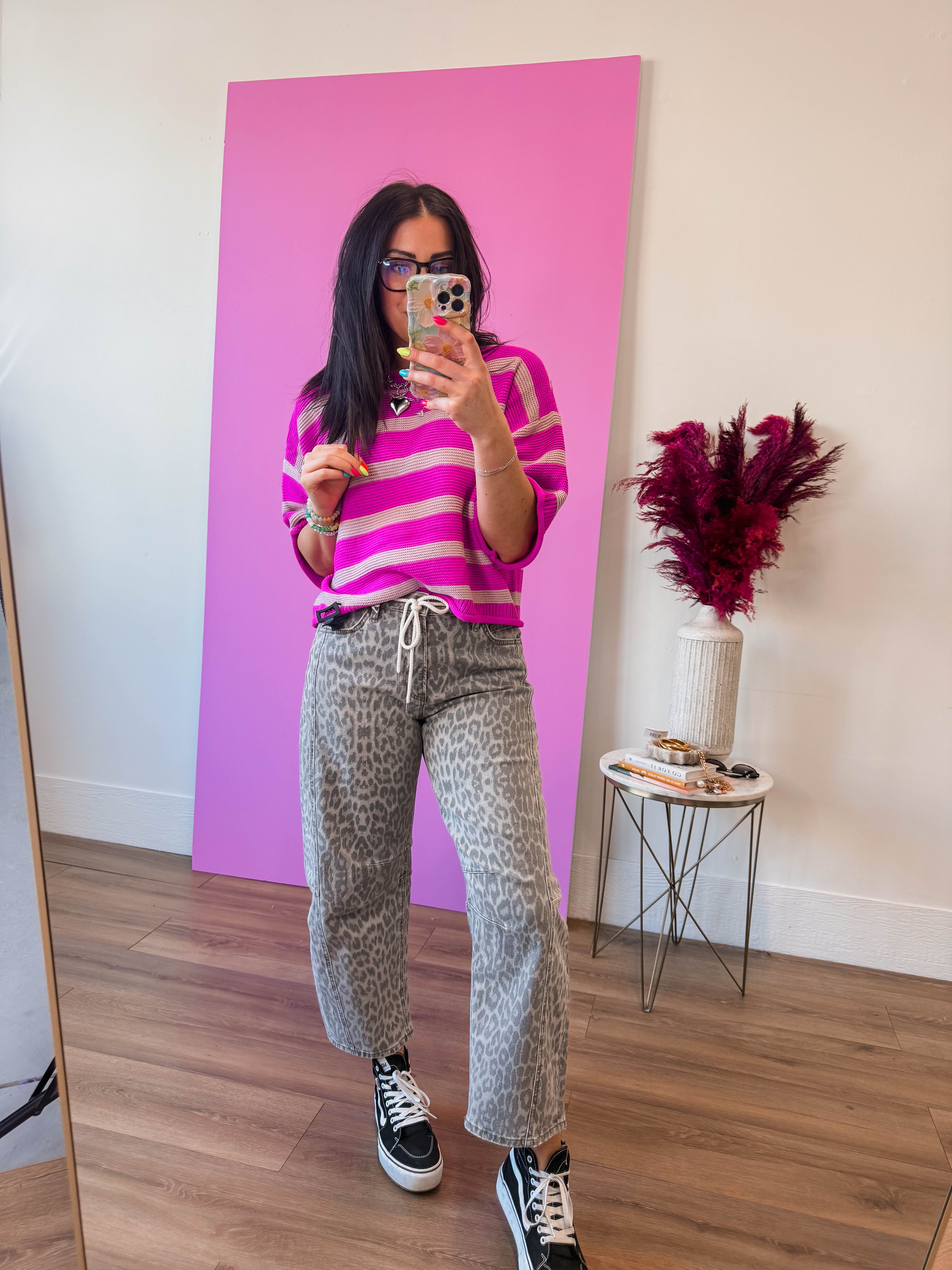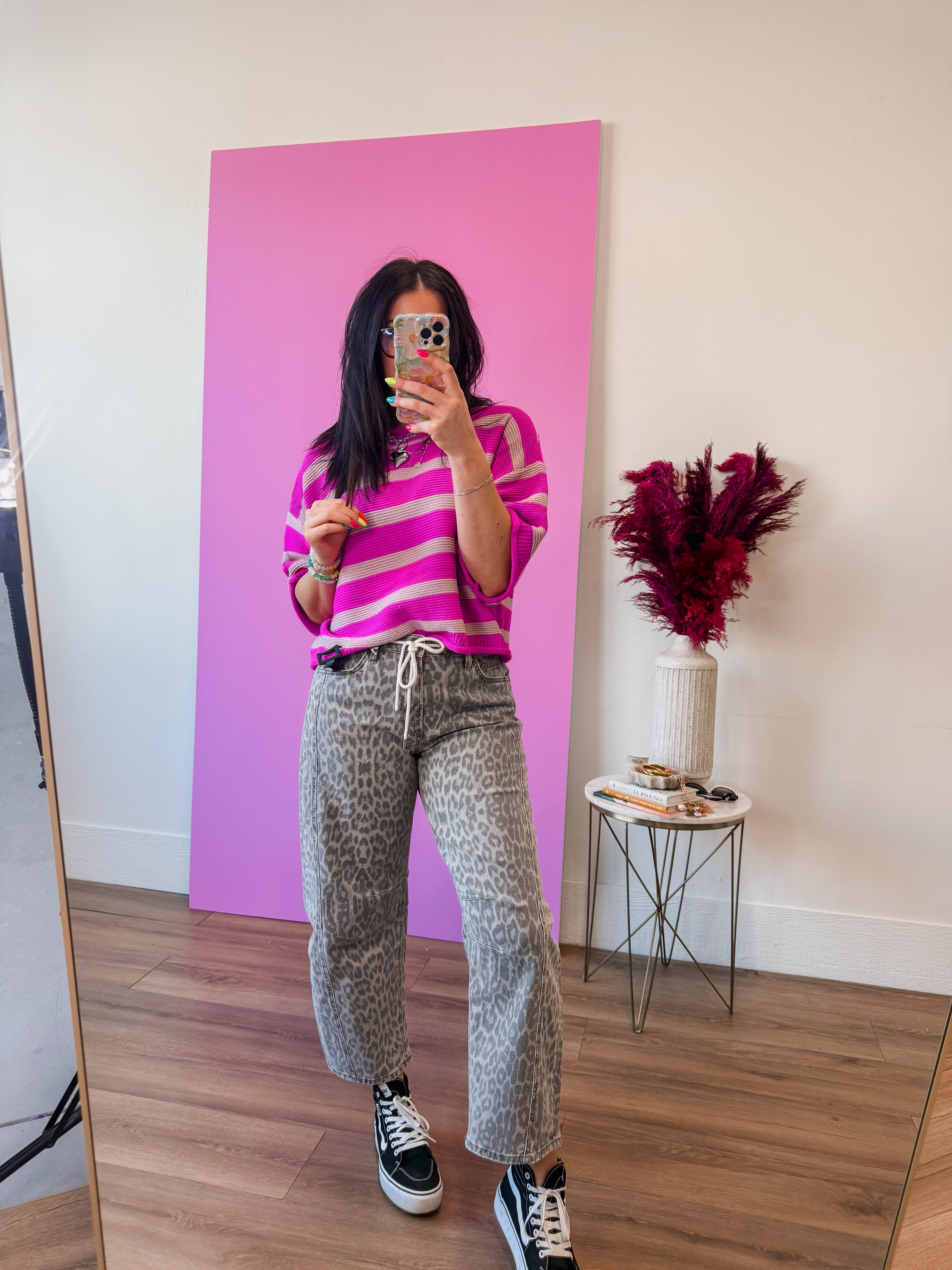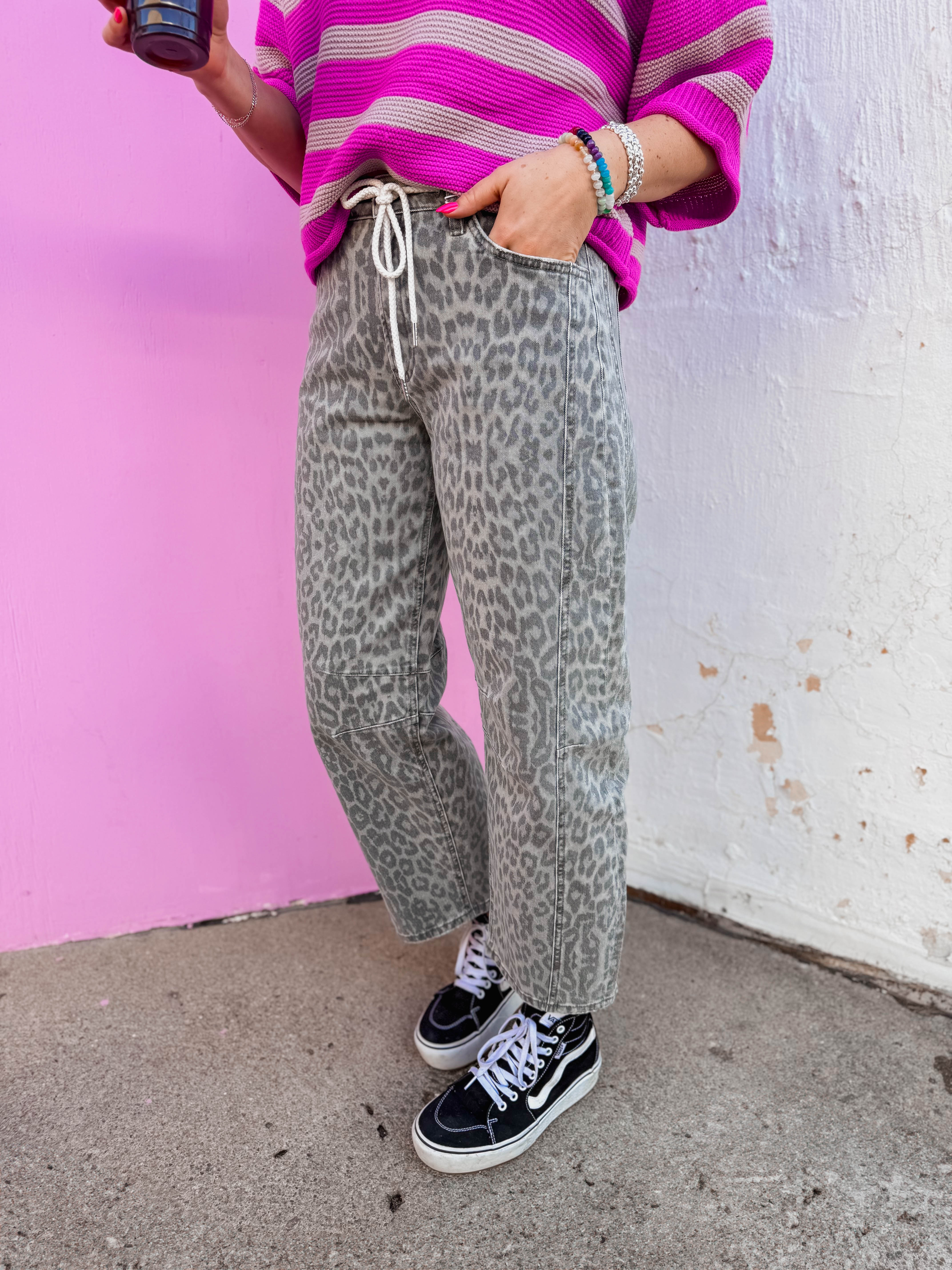 Embrace your wild side with these eye-catching barrel jeans featuring a bold grey leopard print. The high-waisted silhouette with adjustable drawstring offers a flattering, comfortable fit that works for any occasion. Perfect for anyone who loves making a statement with their style, these fun and trendy denim pieces bring an instant edge to your everyday wardrobe.