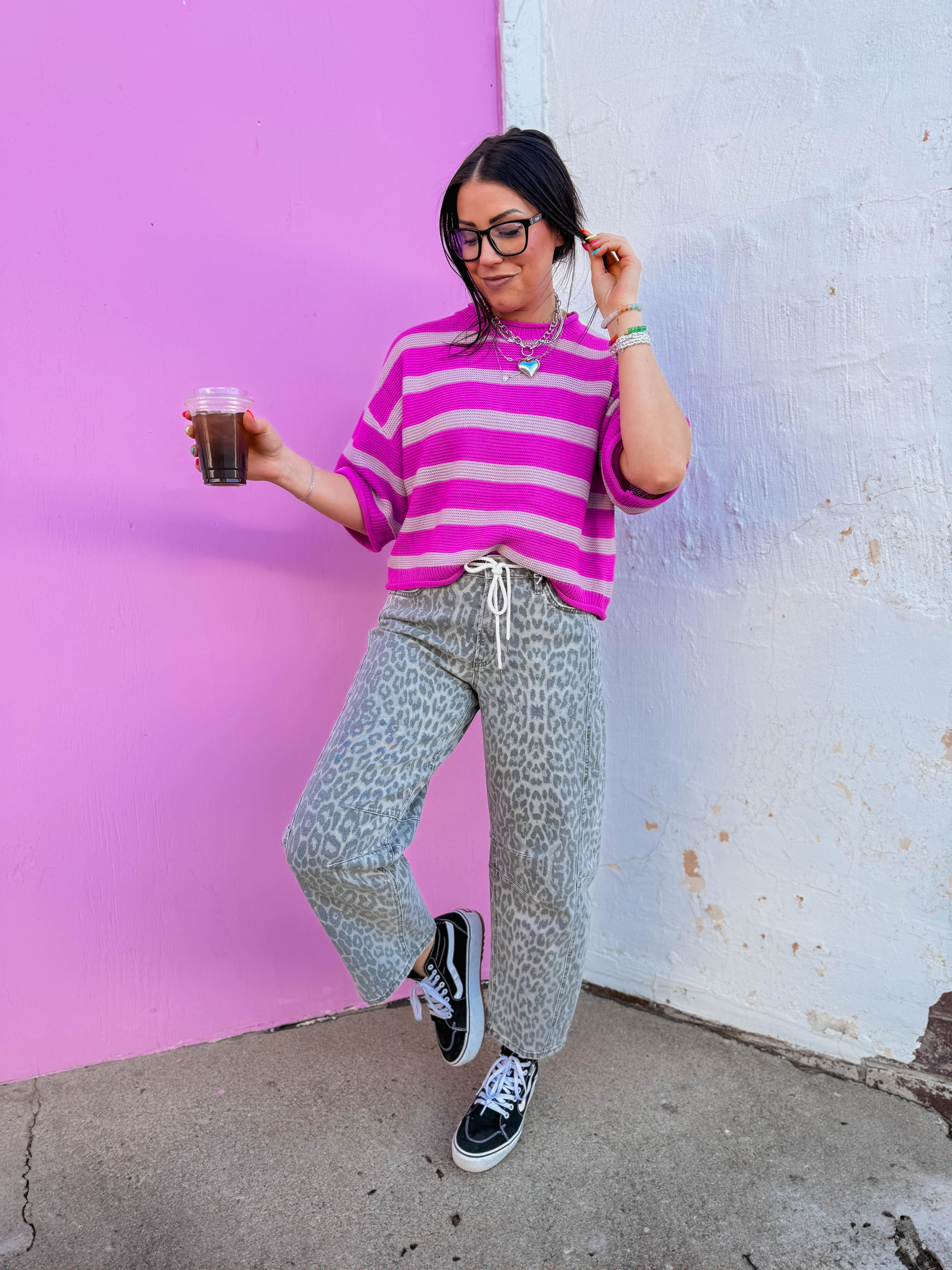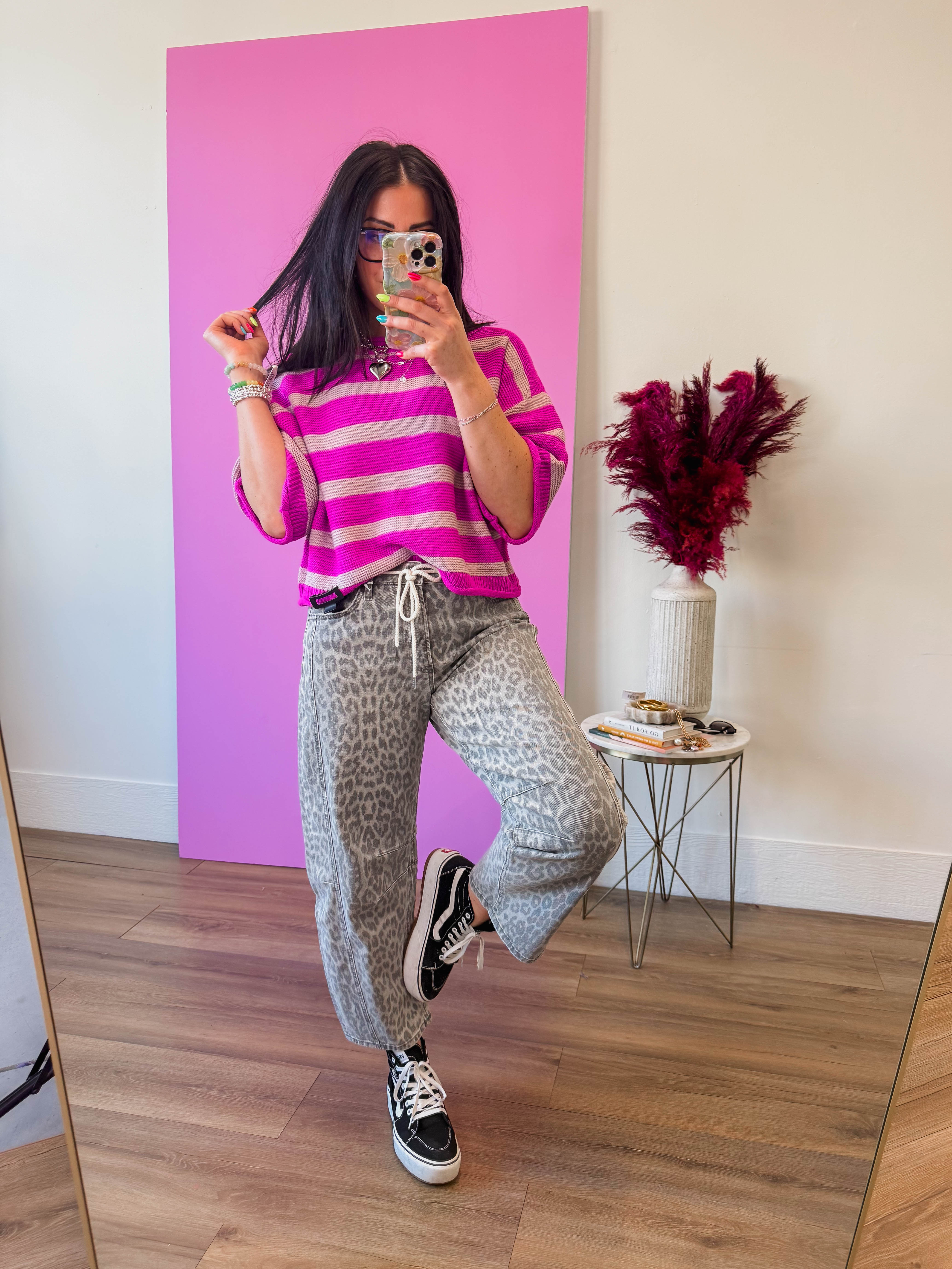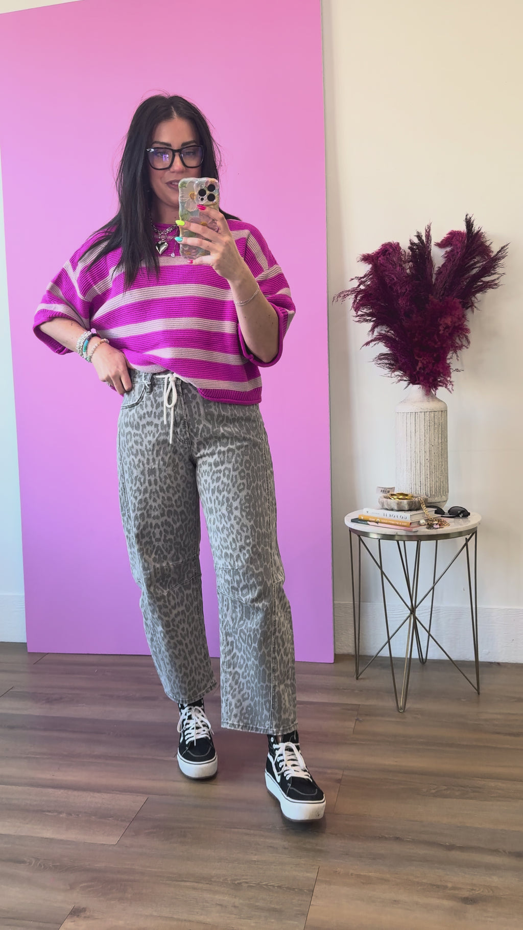 Embrace your wild side with these eye-catching barrel jeans featuring a bold grey leopard print. The high-waisted silhouette with adjustable drawstring offers a flattering, comfortable fit that works for any occasion. Perfect for anyone who loves making a statement with their style, these fun and trendy denim pieces bring an instant edge to your everyday wardrobe.