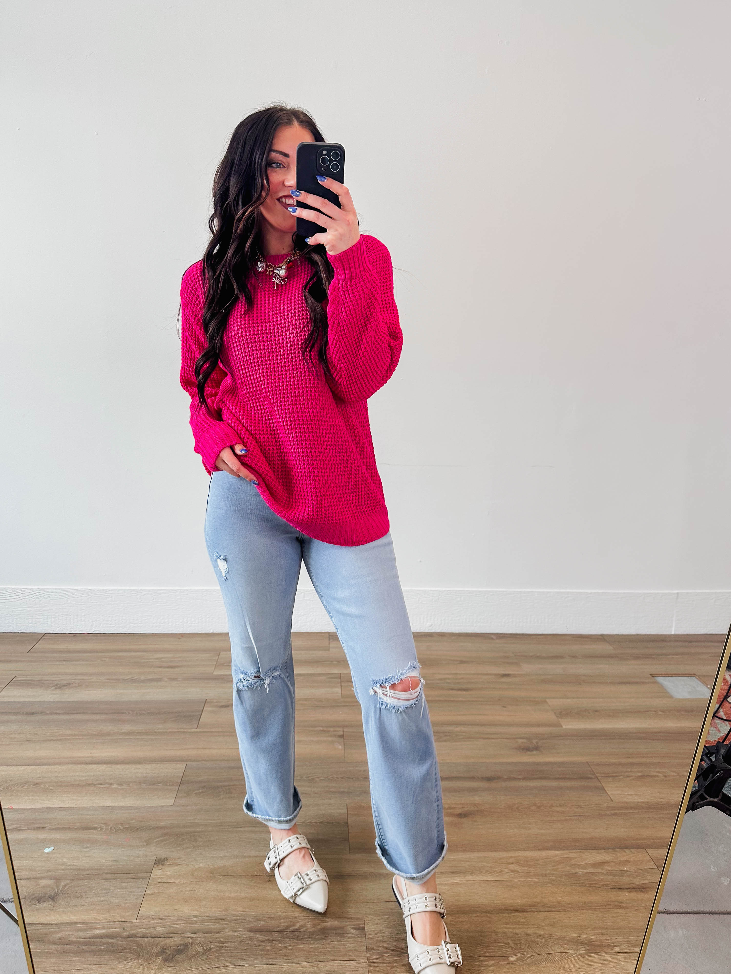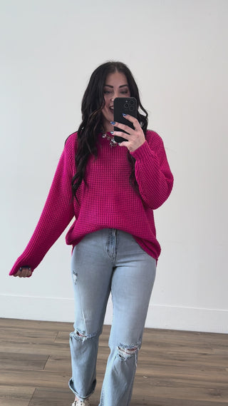 Meet your new favorite sweater—the Zoey Waffle Knit. With its textured waffle knit fabric, classic round neckline, and long sleeves, this pullover takes you from desk to drinks without missing a beat. The playful hi-low hem and bold color pop add personality to any outfit. Comfortable, versatile, and ready for whatever comes your way.
