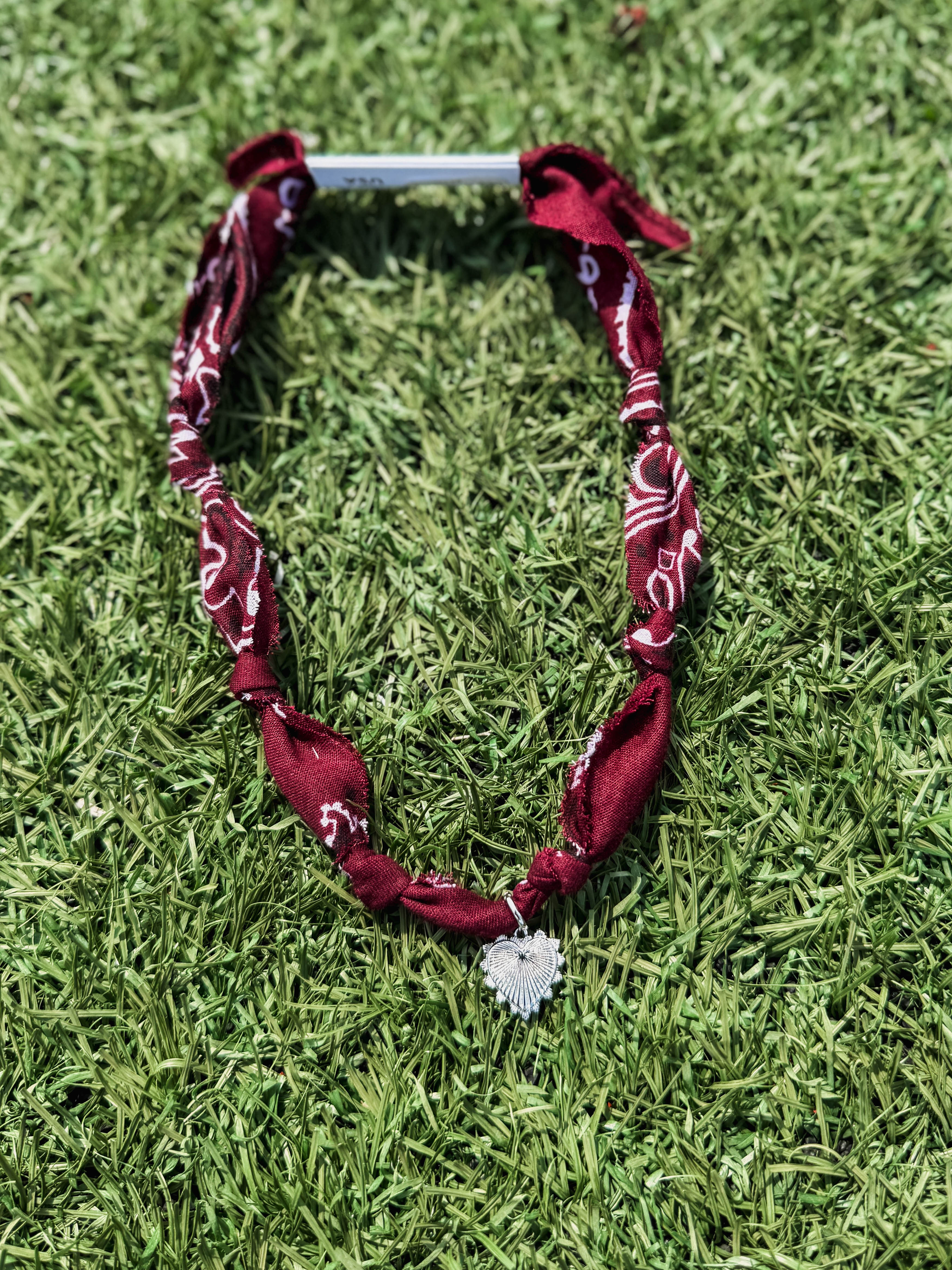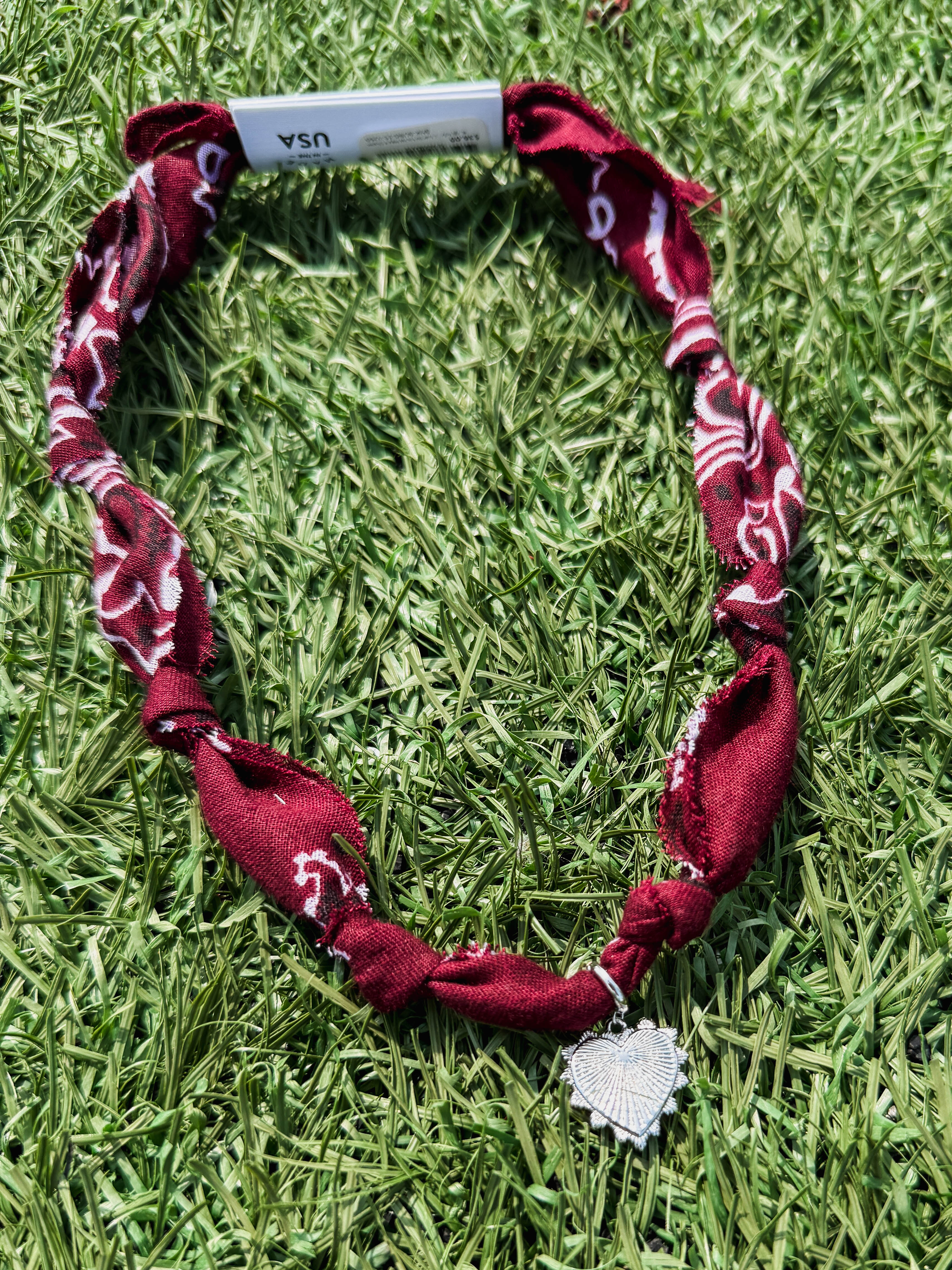 Nickel & Suede - Burgundy Bandana Necklace-Silver Sunburst Heart Charm
