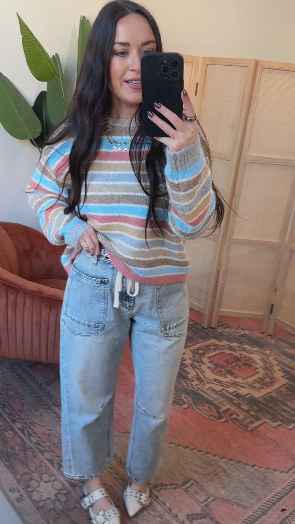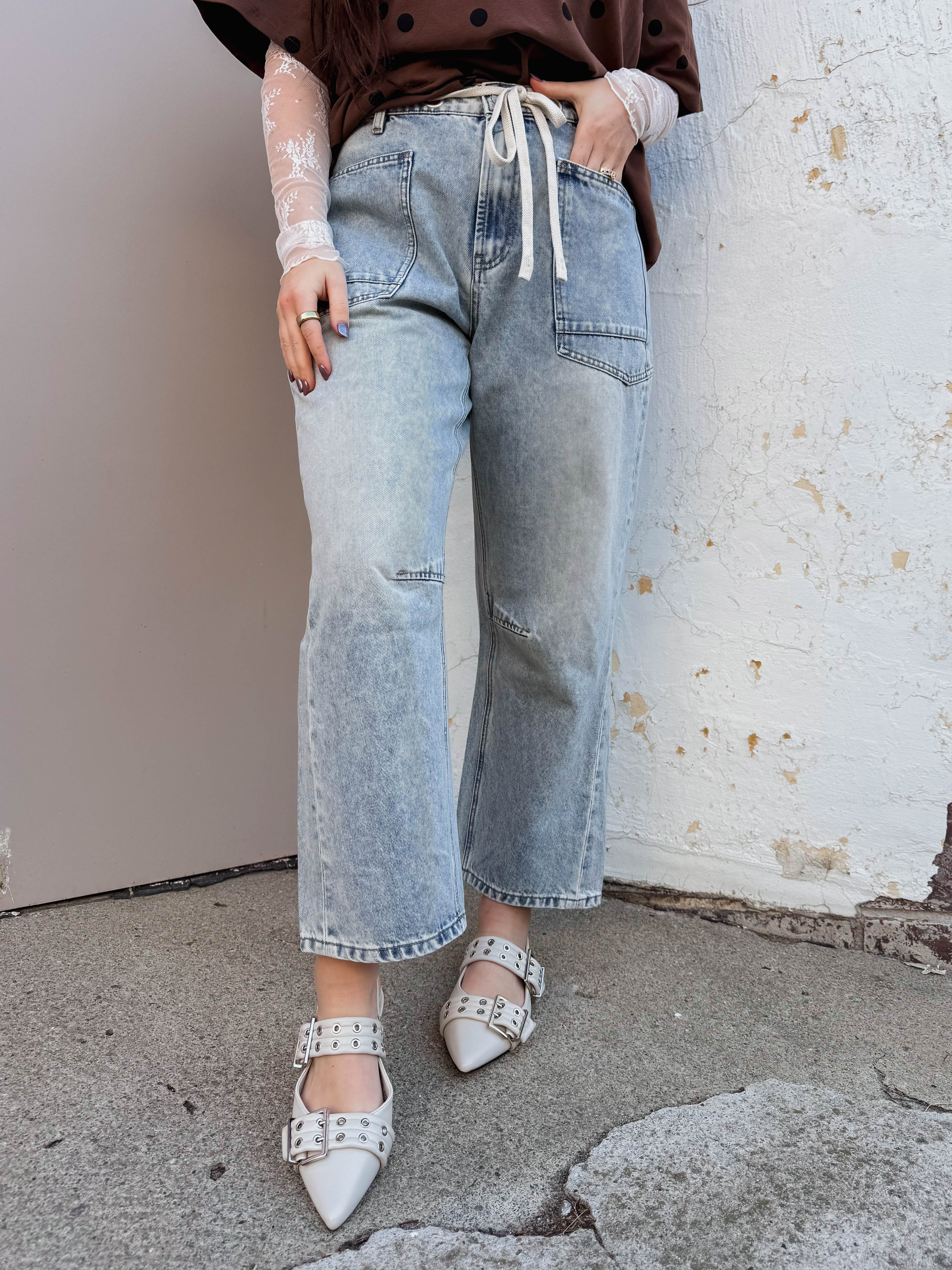 These Atlas Barrel Jeans bring a fun twist to your denim game with a trendy acid-washed look and a flattering self-tie high waist. Featuring handy front pockets and a comfy barrel style, they zip and button up for easy wear. Perfect for effortless cool and all-day comfort!