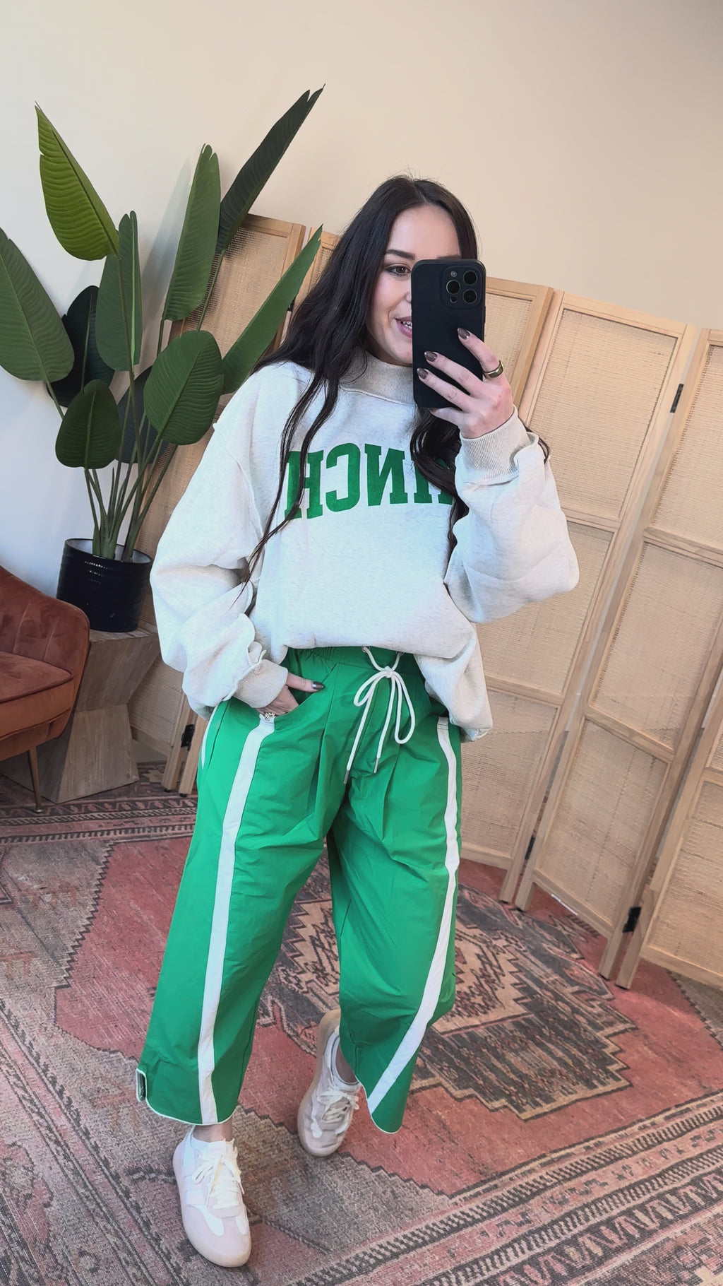 The Cool Girl Barrel Pants in green bring sporty flair with a high-waisted fit and elastic smocked waistband for comfort. The adjustable drawstring and tulip hem add playful details, while contrast piping sharpens the look. Easy to style and perfect for making a trendy statement.