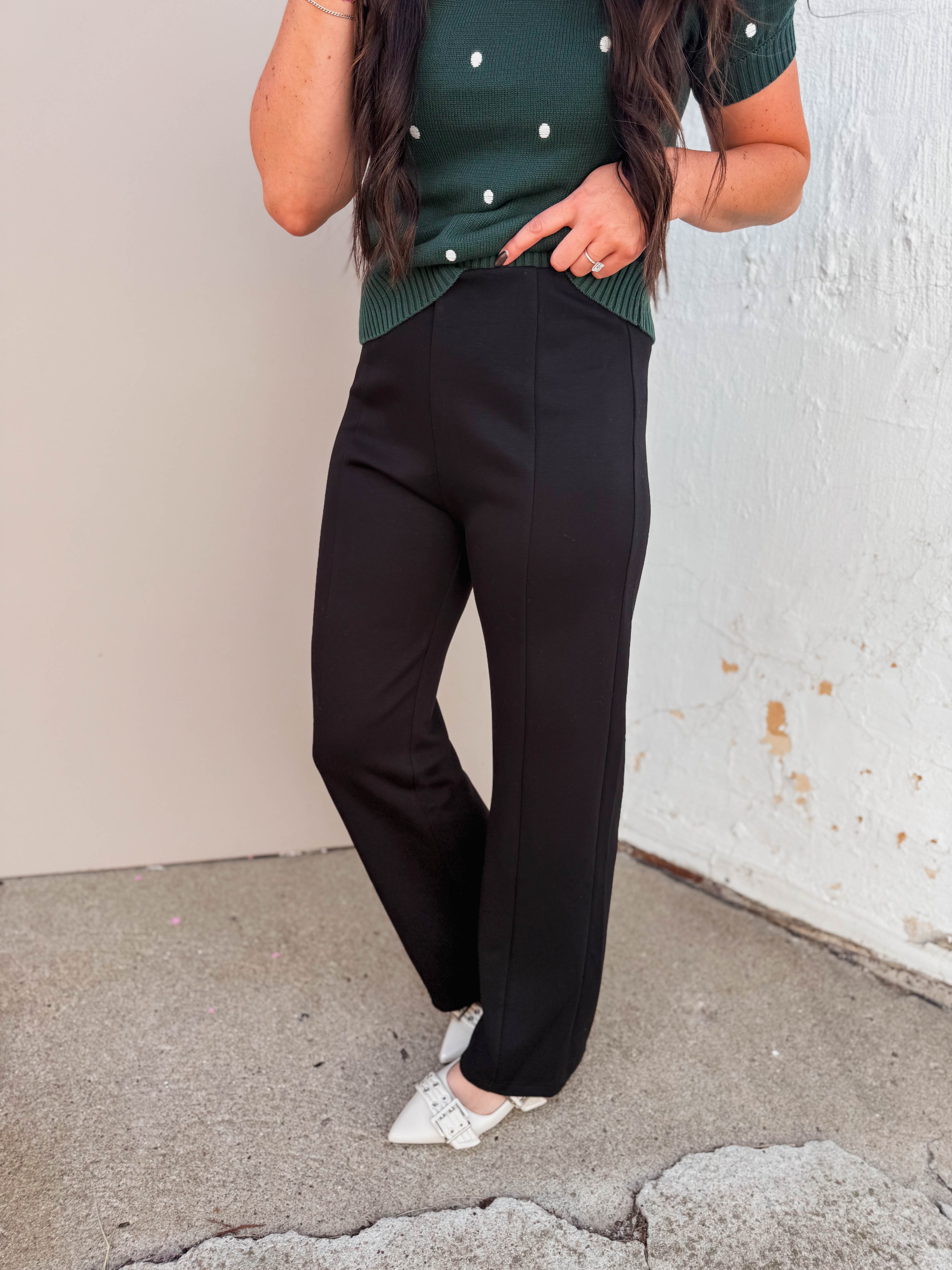 Step out in style with the Daria Trousers! Made from comfy scuba material, these high-waisted, wide-leg pants feature a chic front seam detail. Perfectly versatile to take you from workday meetings to weekend fun with ease.