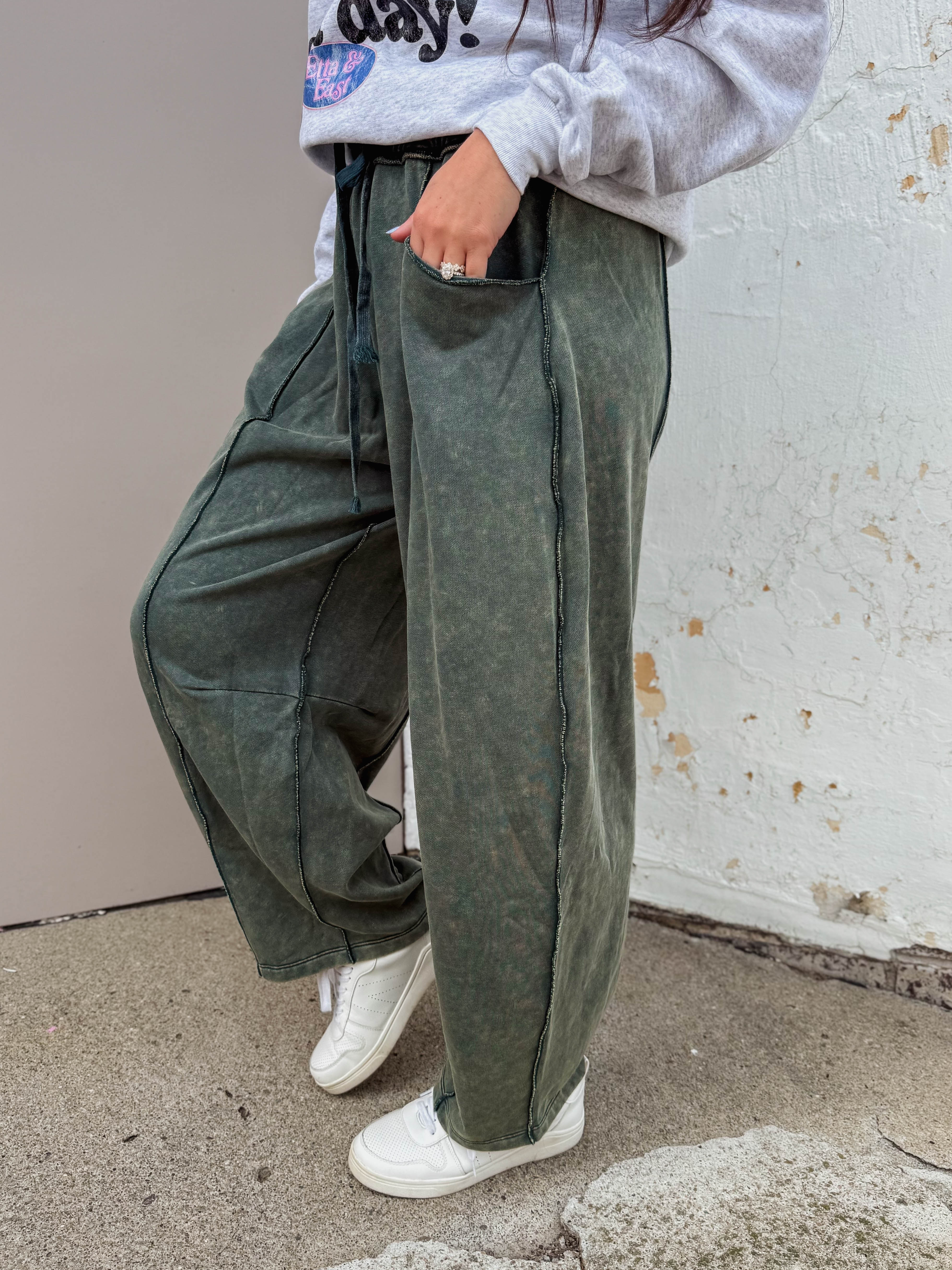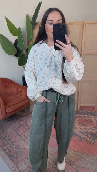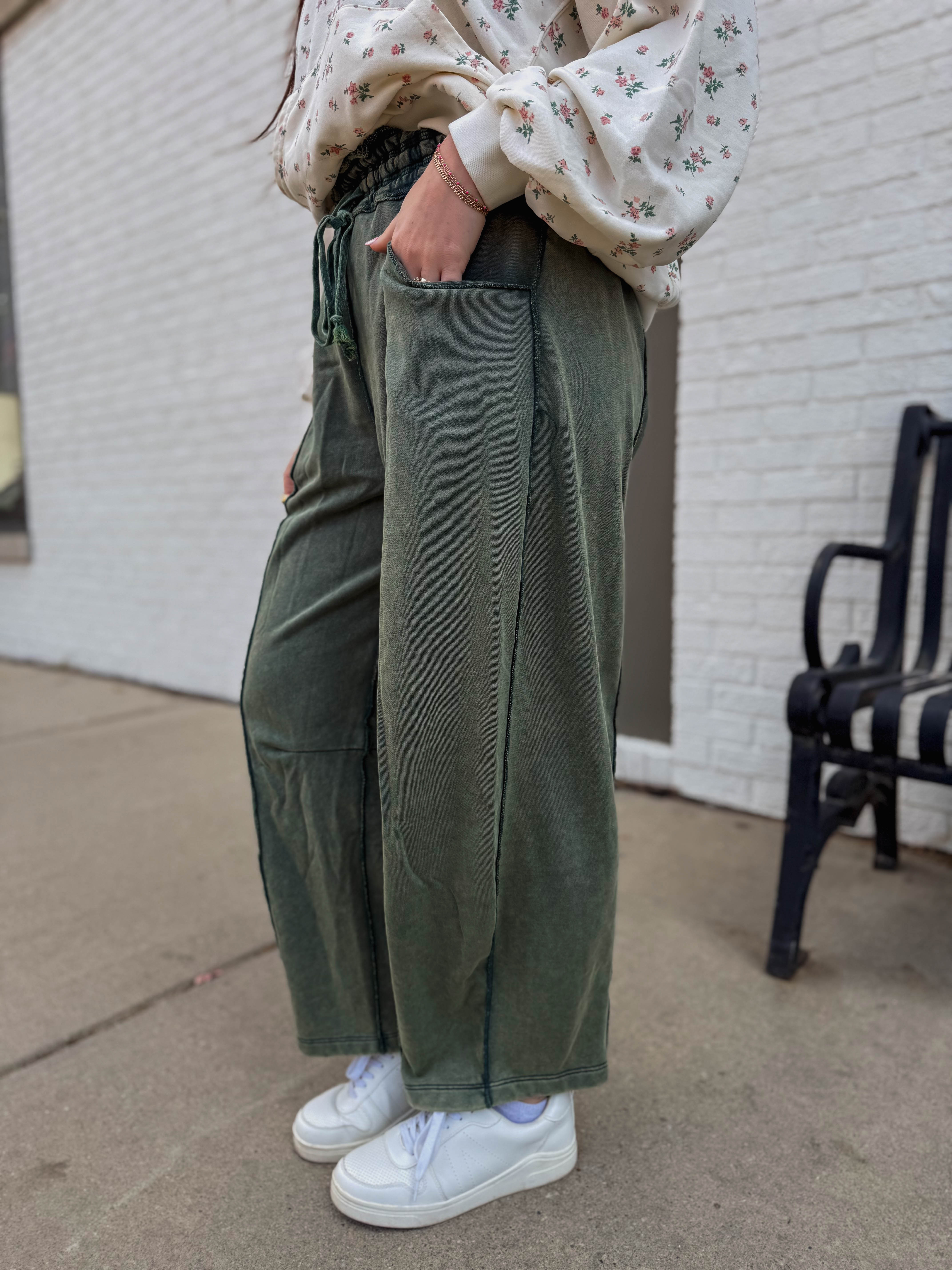 Cozy up in the Karley Barrel Pants! Made from soft cotton French terry knit with a mineral wash, these ankle-length pants blend comfort and style. The elastic waist with a drawstring ensures the perfect fit, while side and back pockets add handy storage. Perfect for cool fall and winter days!