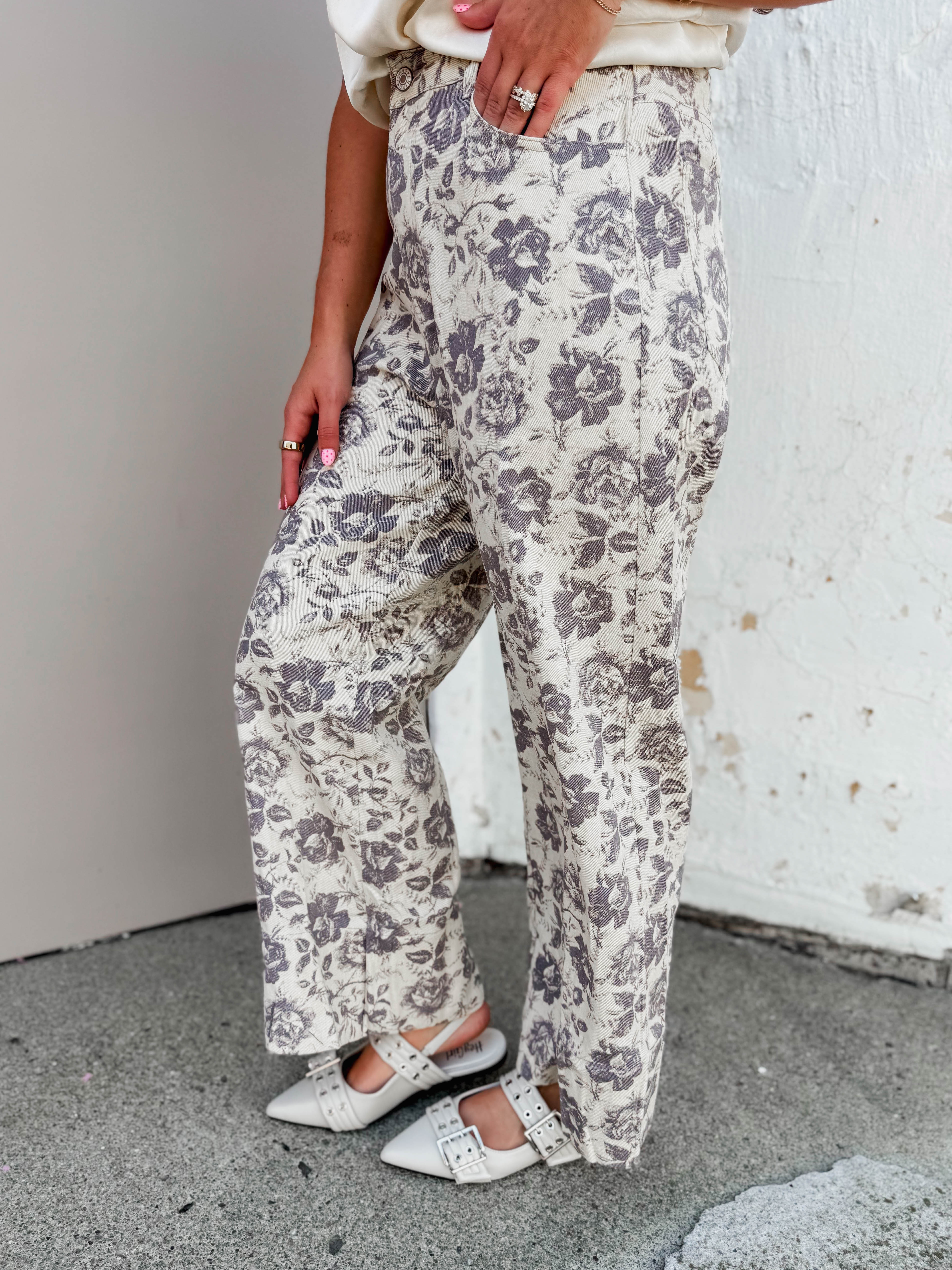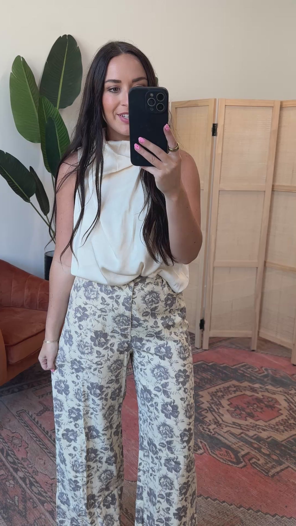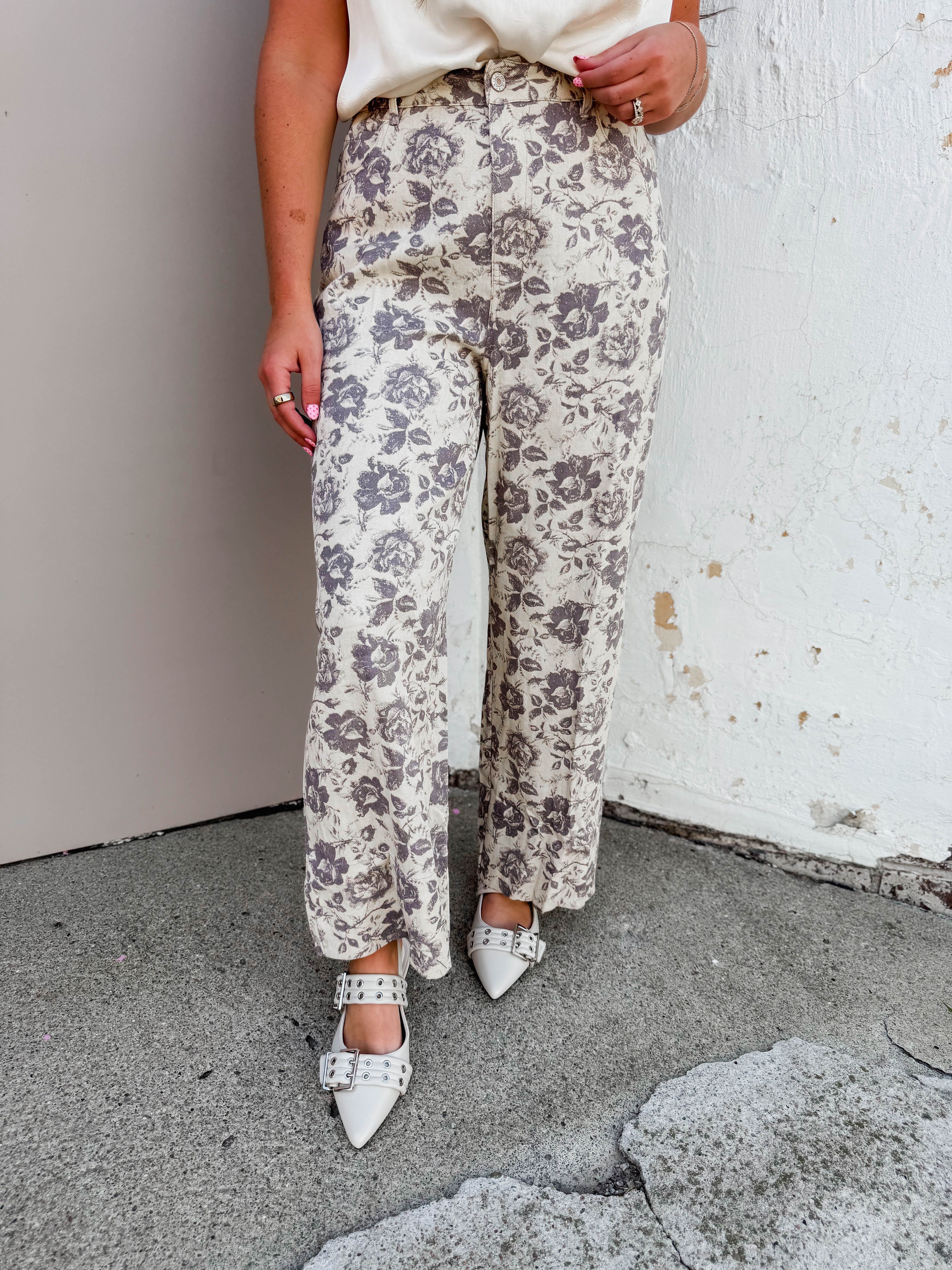 RESTOCK! Step into style with the Serena Floral Pants in Ecru. These high-waisted, ankle-length pants feature a button fly-front zip closure, cozy side pockets, and chic back patch pockets. Perfectly designed to take you from workdays to weekends, they’re playful enough to dress up or down with ease.