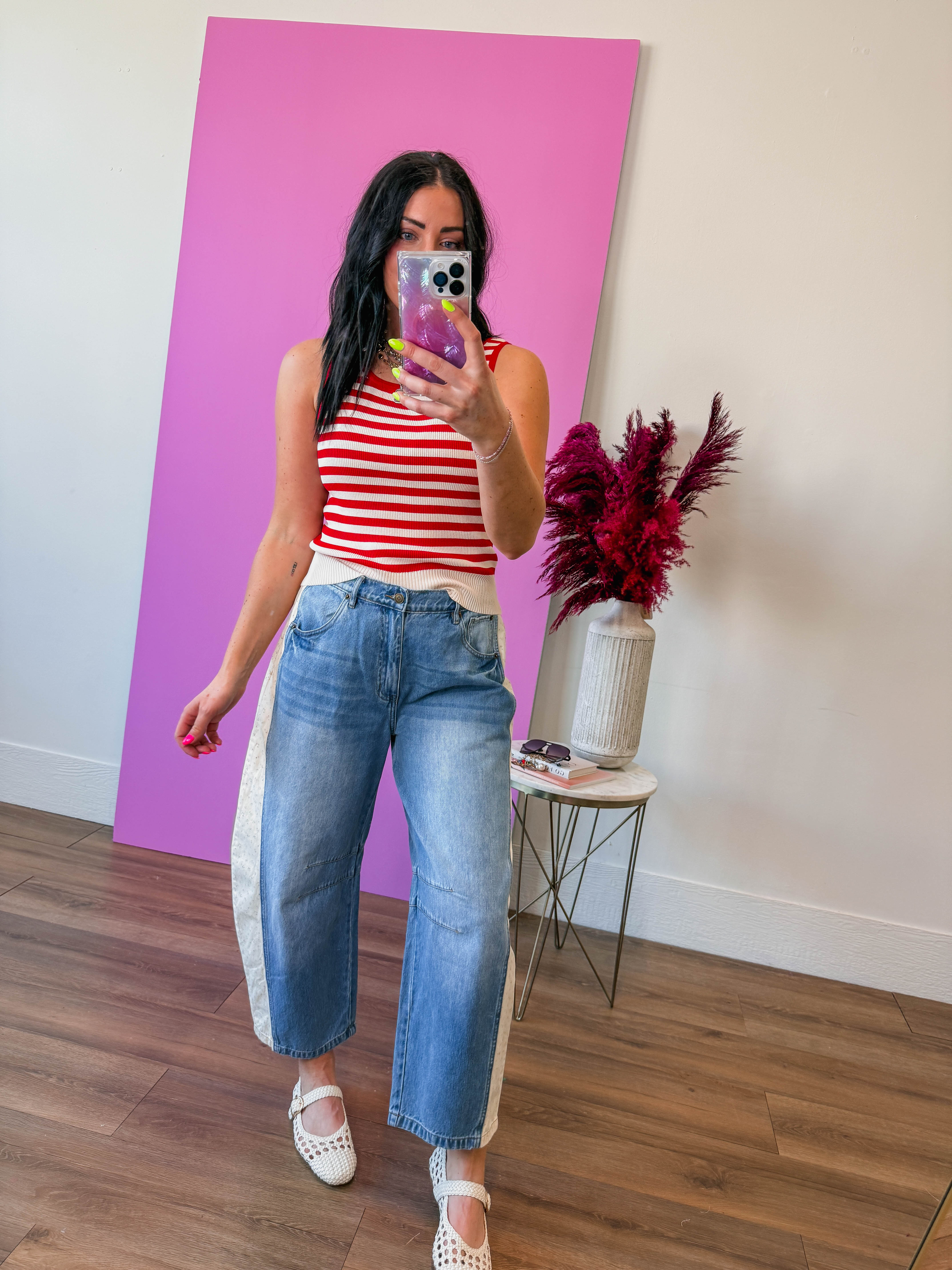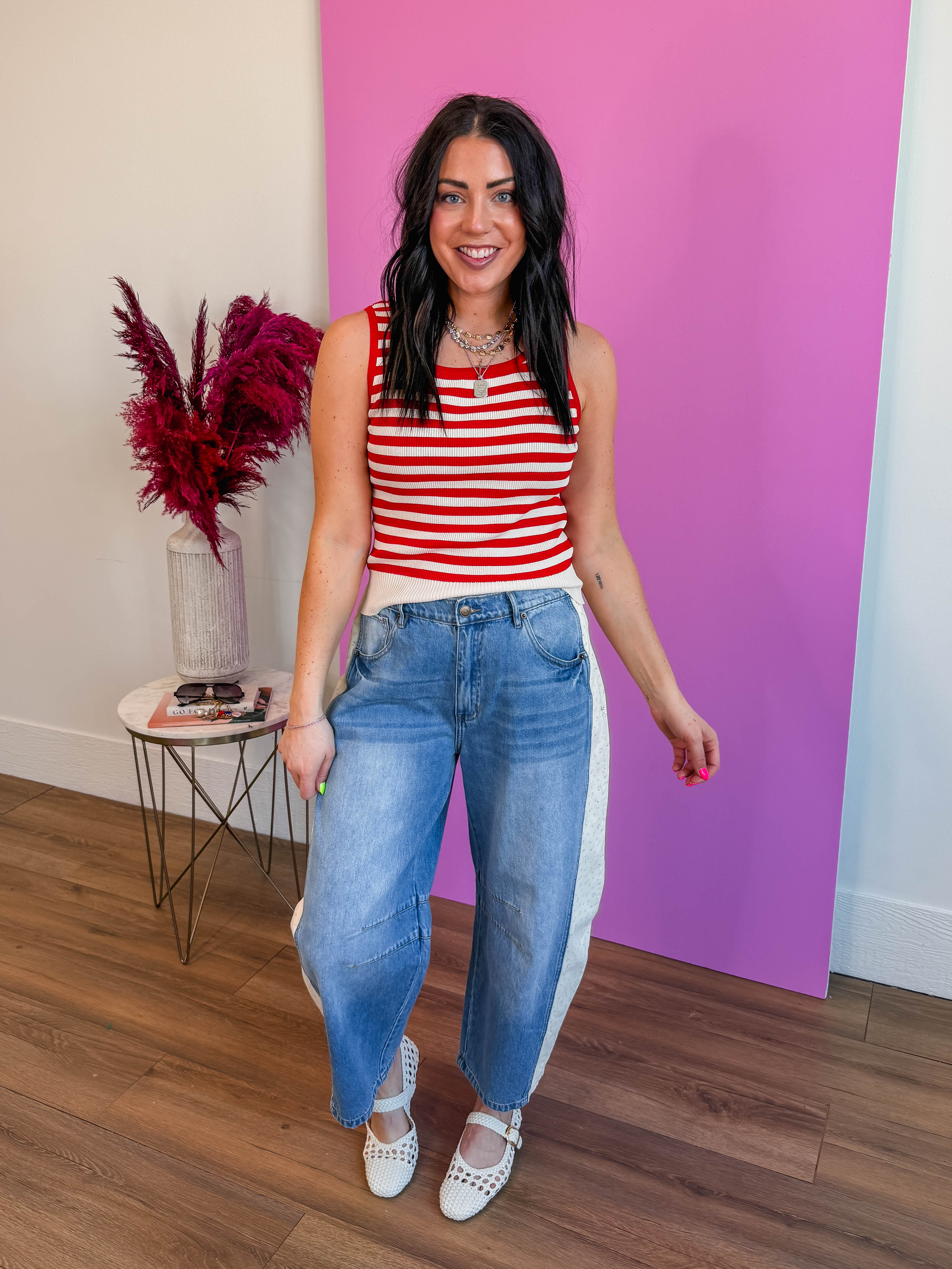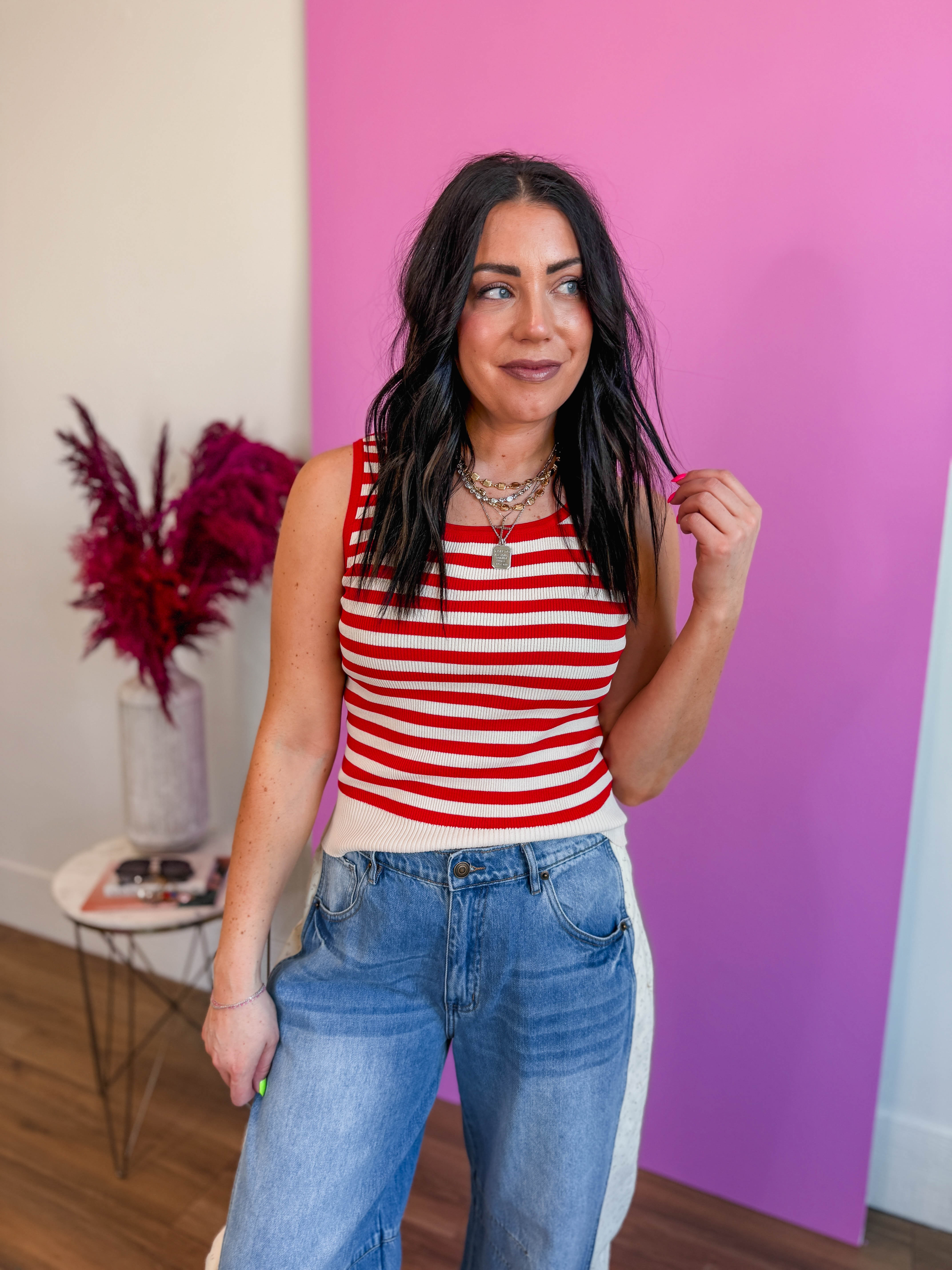 Effortless layering meets playful style with this striped knit tank. The classic red stripe pattern brings a fresh, summery vibe that pairs perfectly under denim jackets for cooler days. Lightweight and versatile, it's your go-to piece for transitional weather—cute enough to wear solo when it warms up, practical enough to layer year-round.