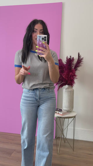 The Claire Striped Top brings effortless style from office to weekend. This crew neck tee features bold pinstripes with a fun leopard trim that adds a playful pop of pattern to any outfit. Short sleeves keep it breezy and comfortable, while the ivory base keeps it versatile enough to pair with everything in your closet.