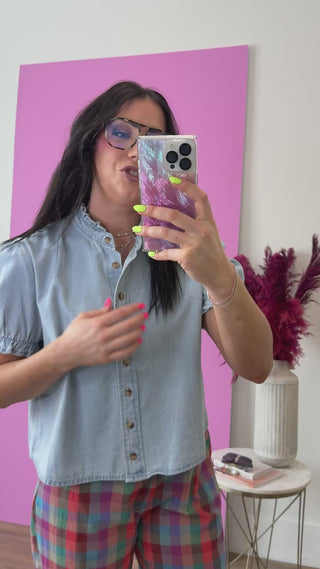 Effortlessly chic, this denim blouse transitions from office to weekend with ease. Featuring a classic crew neckline, charming puff short sleeves, and smocked cuffs for a polished finish, it's the versatile piece your spring and summer wardrobe needs. Button front closure makes dressing up or down a breeze.