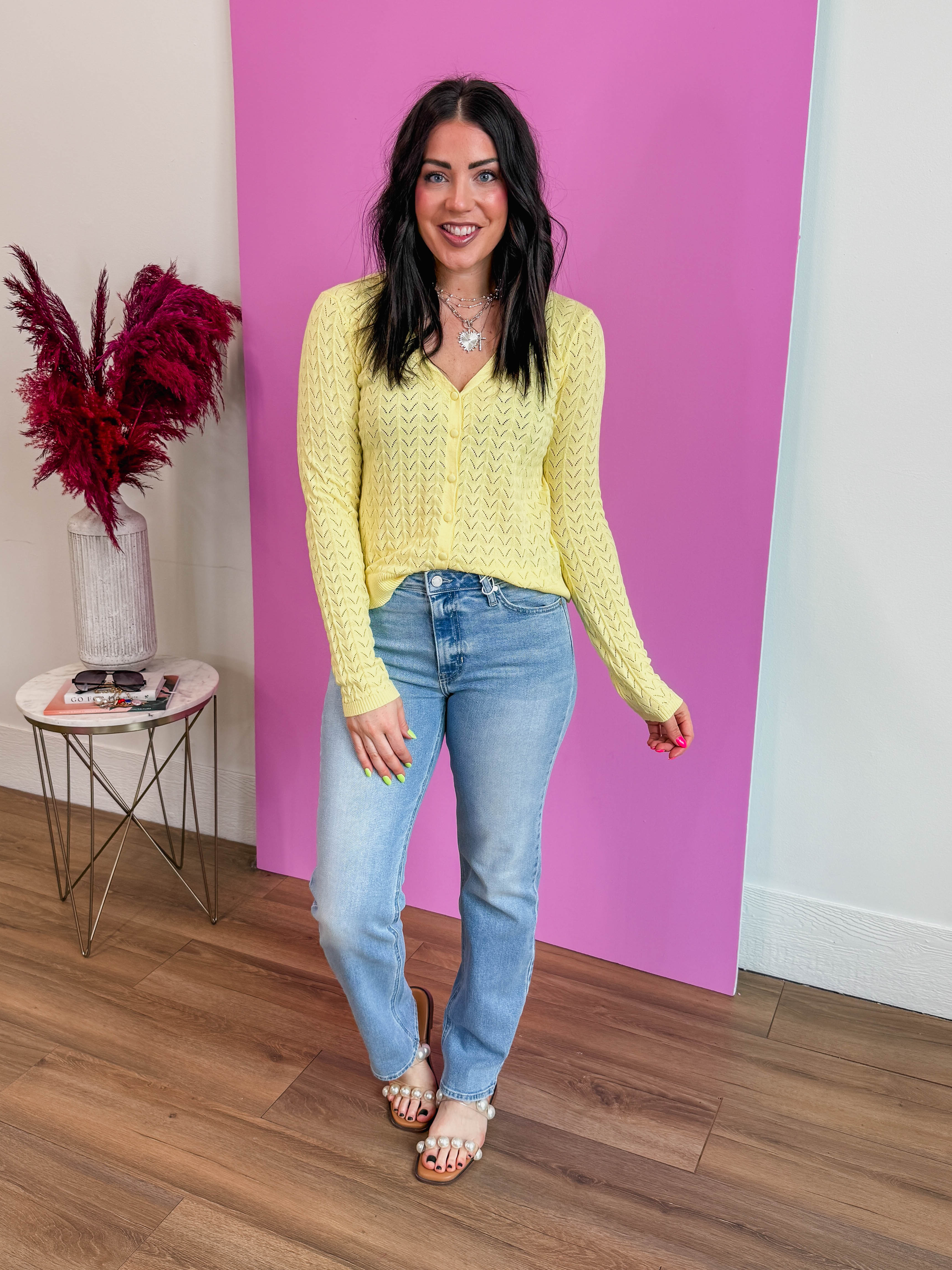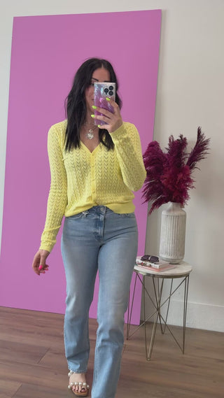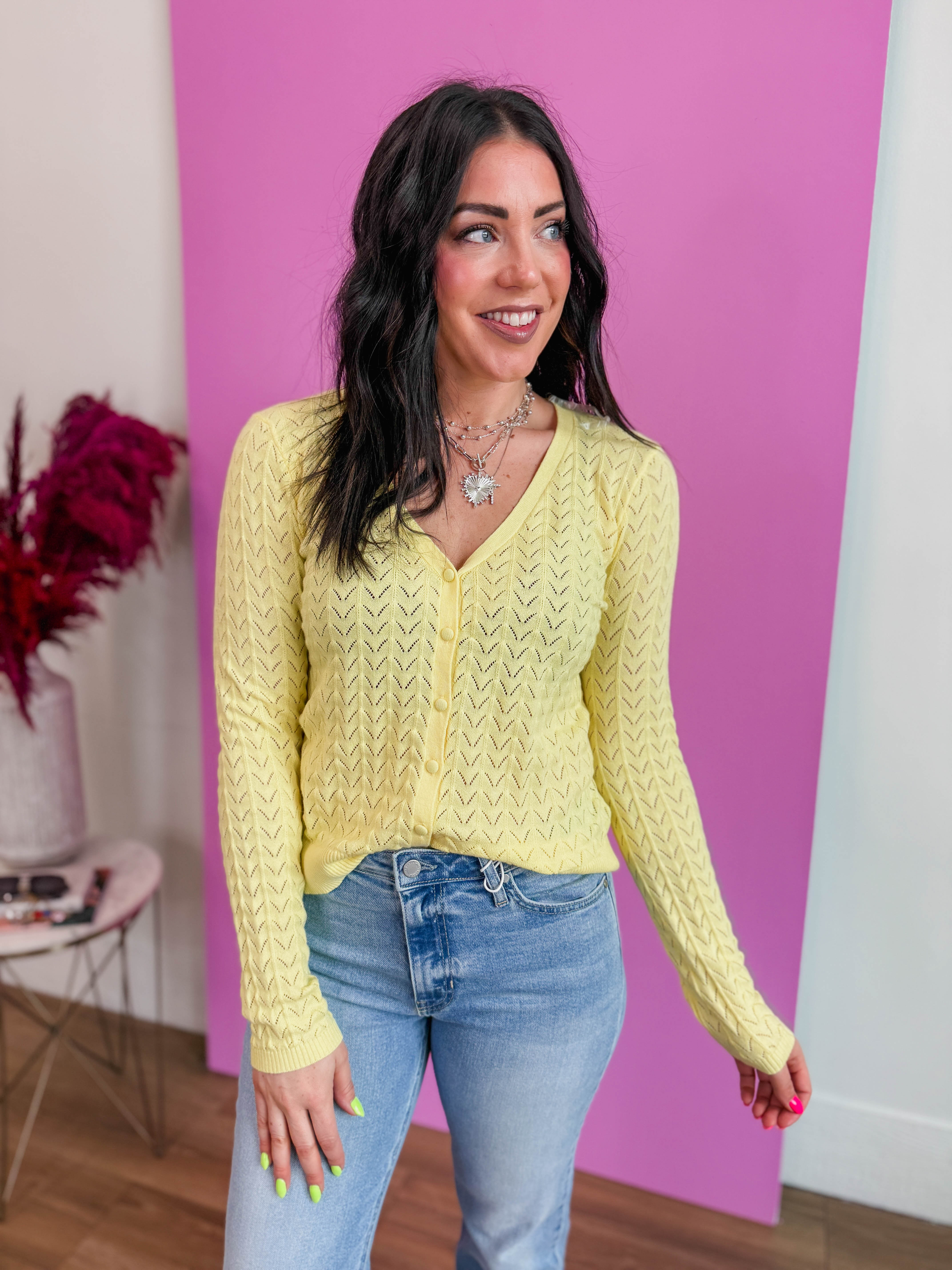 The Mckinzee Cardigan is your go-to layer for effortless style. Crafted in a delicate pointelle knit, this vibrant yellow piece transitions seamlessly from office meetings to weekend adventures. Its versatile design pairs beautifully with everything in your wardrobe, making it the perfect addition to any season. Cozy, chic, and endlessly wearable.