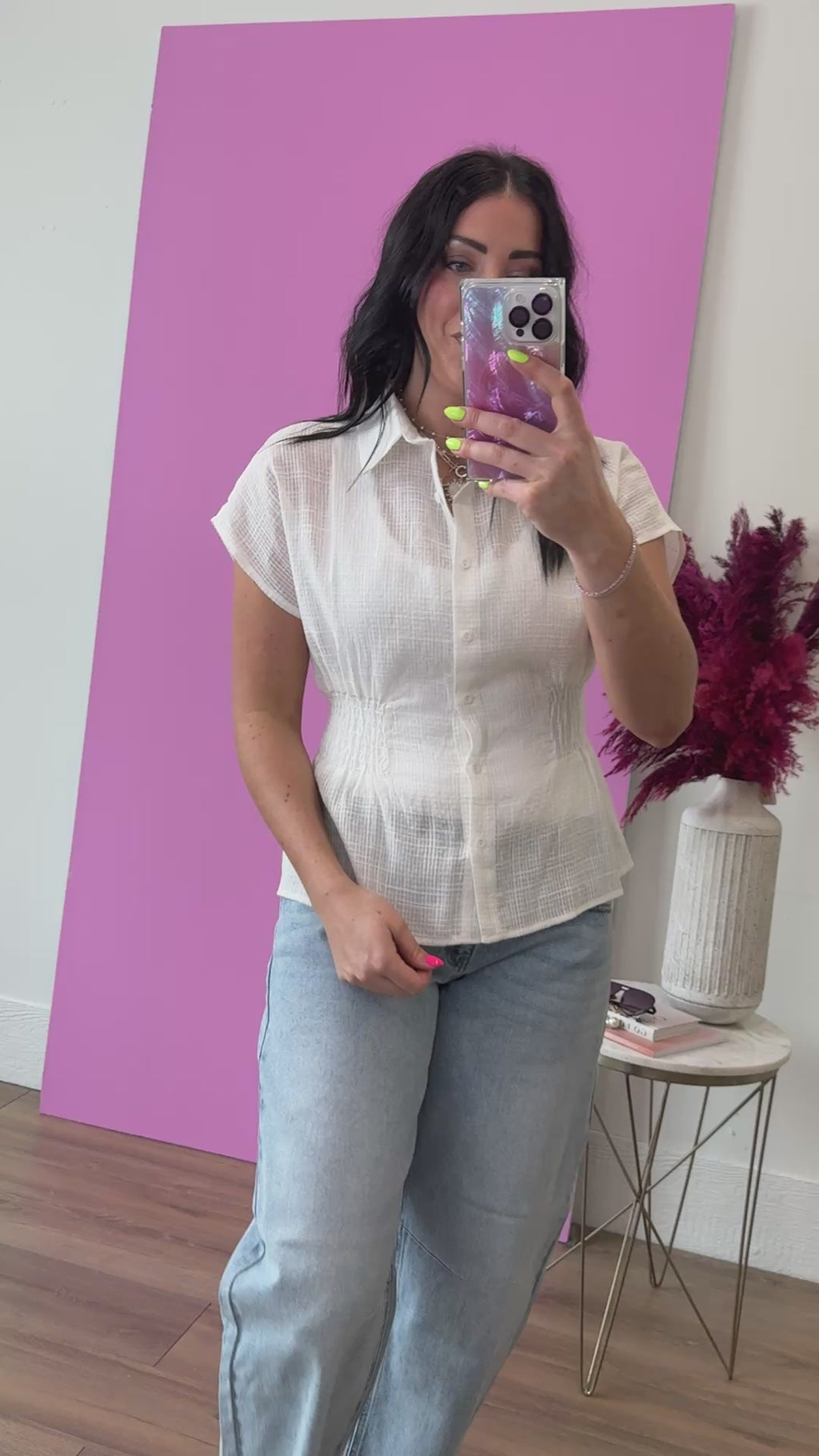The Mikayla Top combines timeless elegance with modern detailing. The collared neckline frames the face beautifully, while delicate waist smocking adds dimension and flatters your silhouette. Crafted for versatility, it works equally well paired with trousers for the office or paired with jeans for weekend ease. The classic white hue ensures it coordinates with virtually any bottoms, making it an essential staple that transitions effortlessly across seasons and occasions.