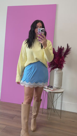 Elevate your wardrobe with this stunning blue satin mini skirt, featuring delicate lace trim that adds a touch of feminine sophistication. The luxurious satin fabric drapes beautifully while the intricate lace detailing creates visual interest and dimension. Perfect for nights out, date nights, or when you want to feel confident and polished!