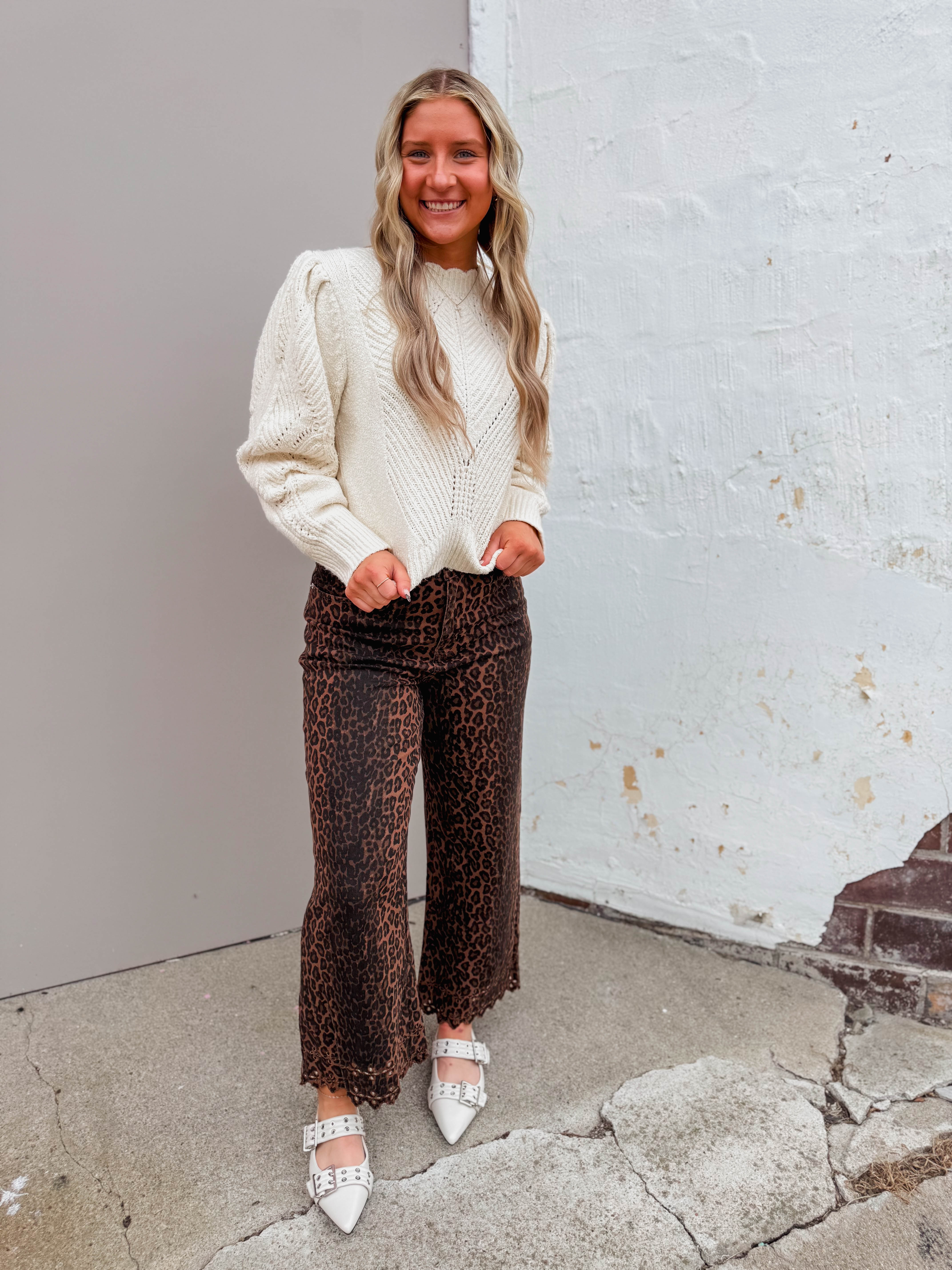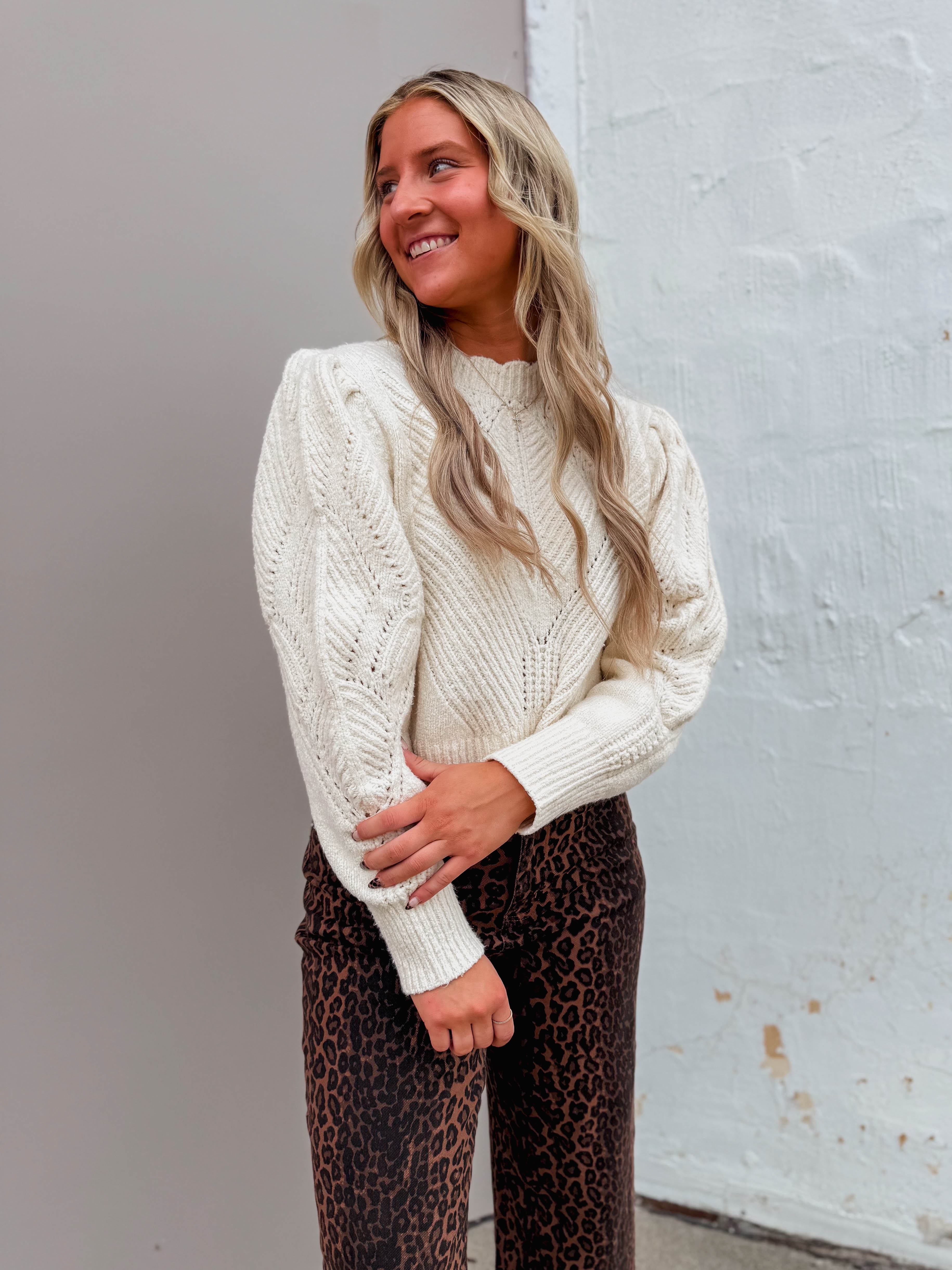 Cozy up in the Haven Sweater, featuring a playful crew neckline and long puff sleeves for extra charm. Its scalloped edges and multi-pattern knit add fun, stylish flair that easily takes you from work to weekend.