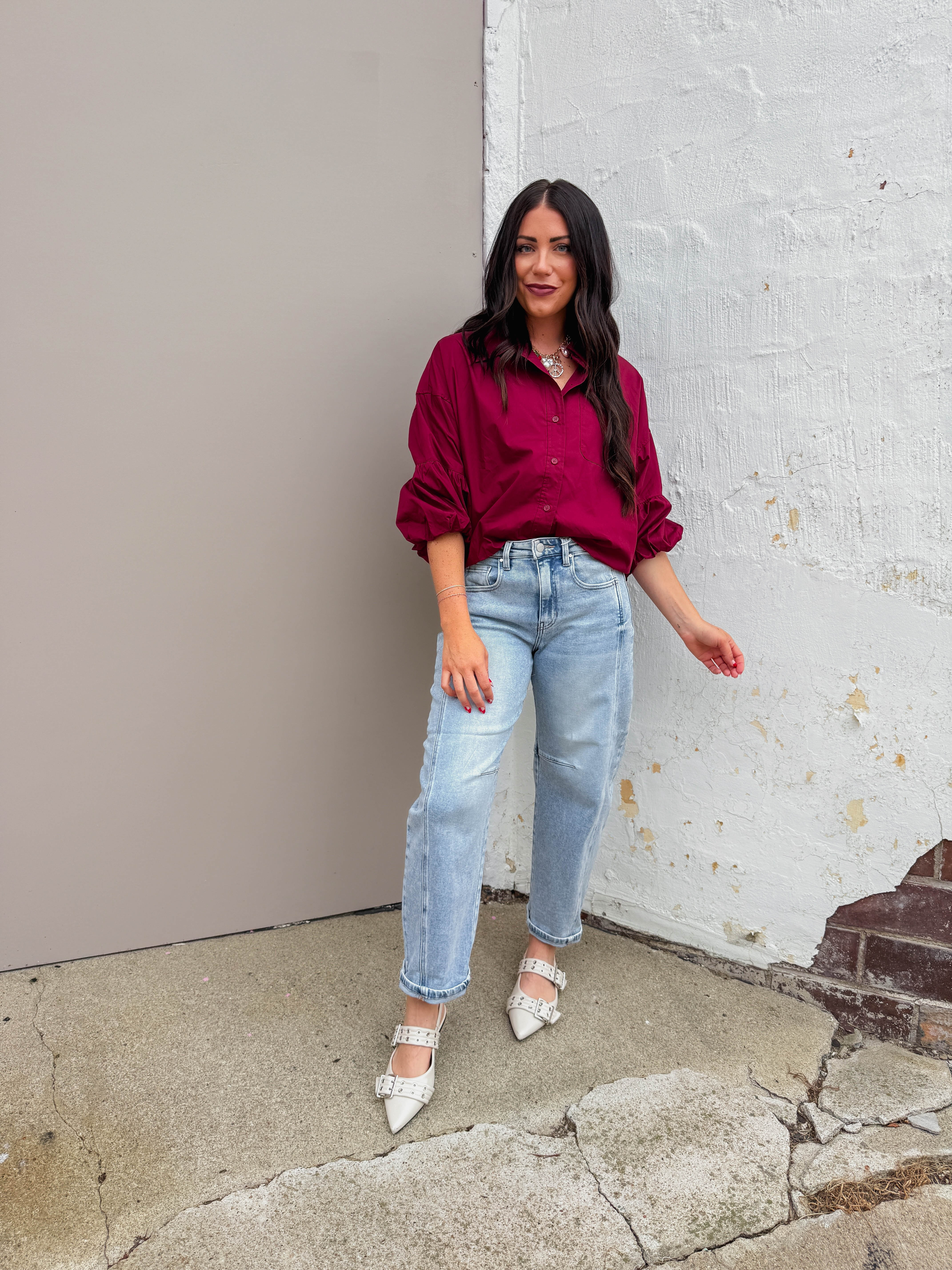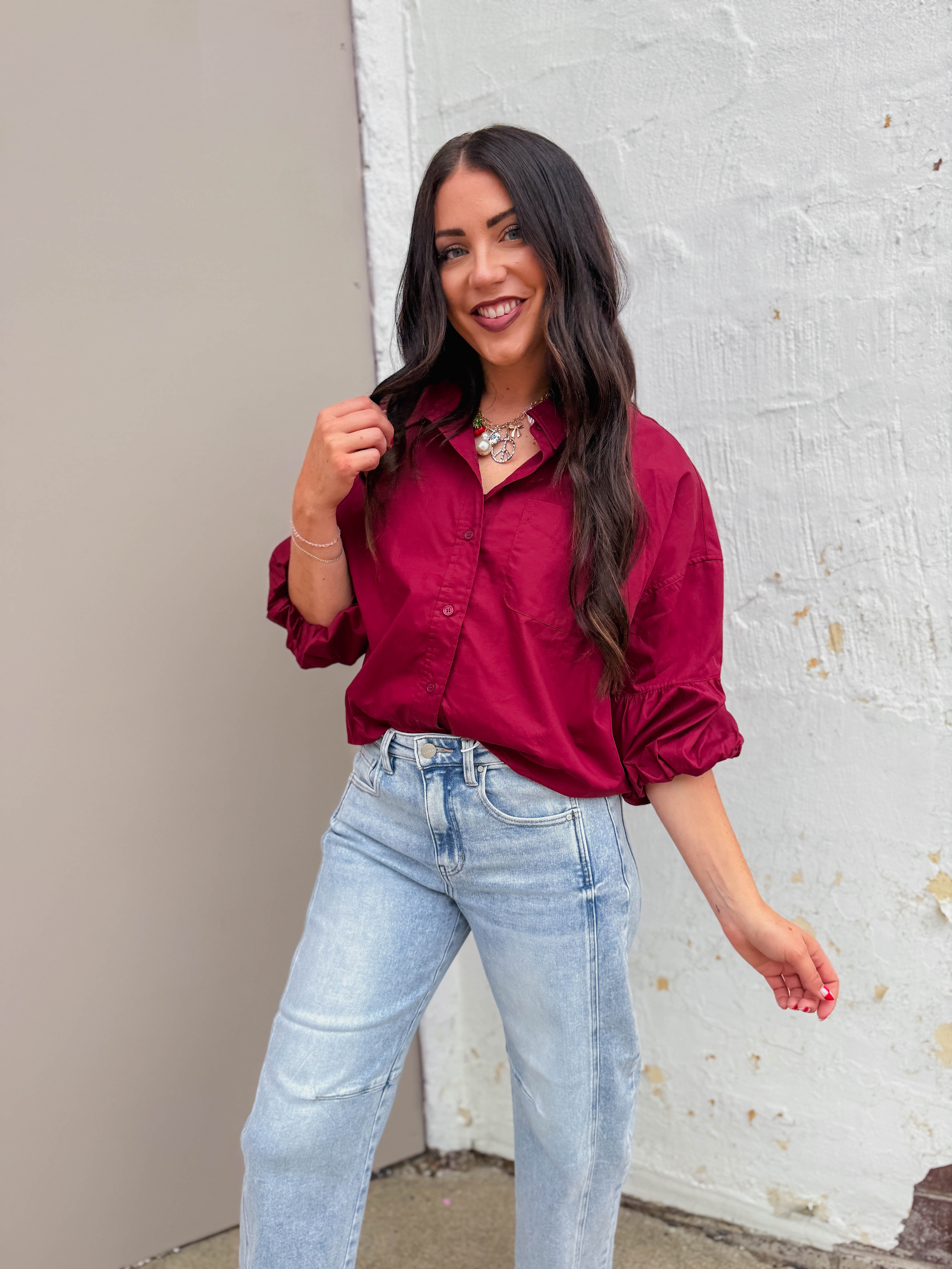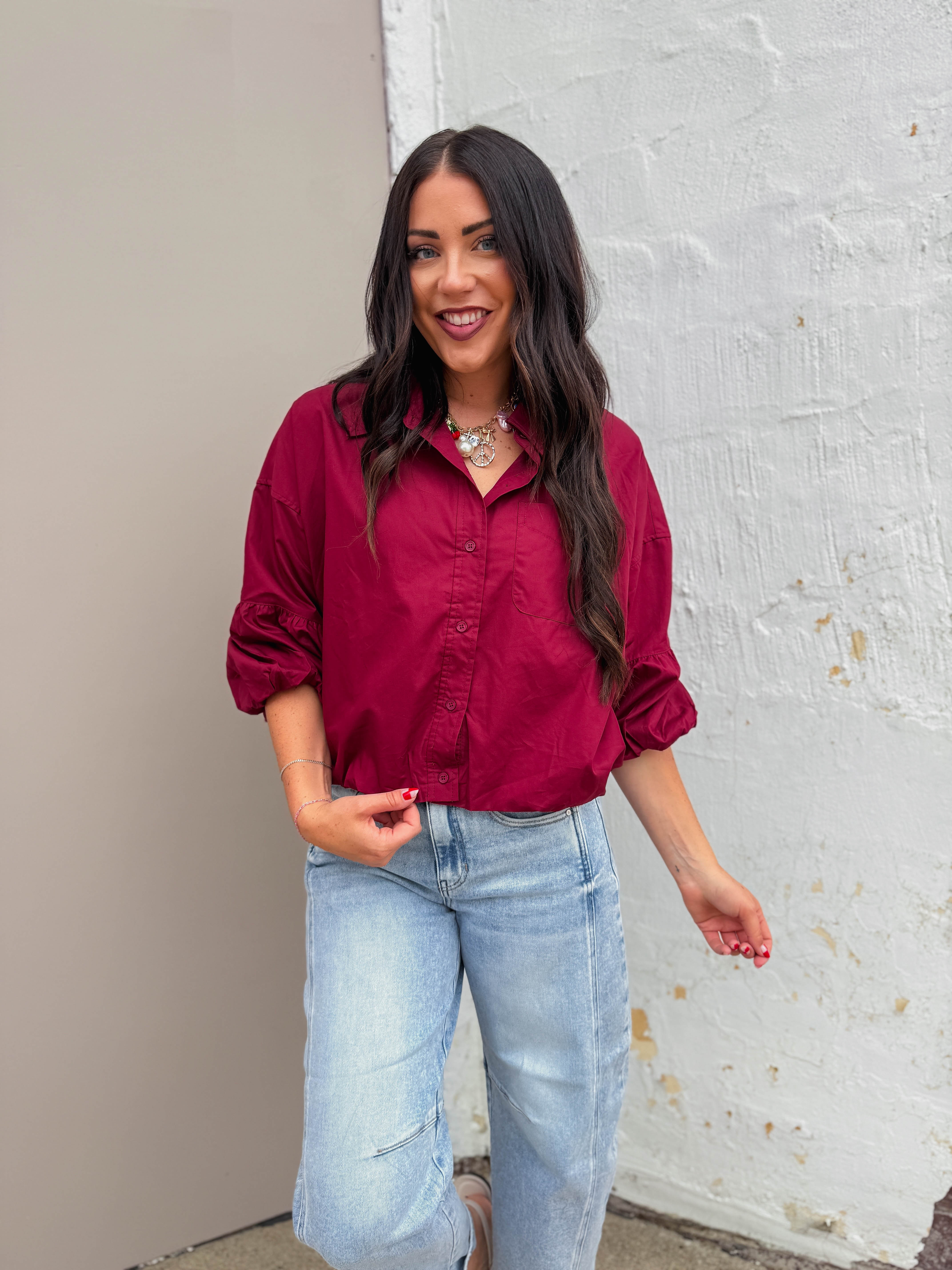 The Jude Top brings fun to your wardrobe with its collared neckline and playful balloon short sleeves. Featuring a button-down placket and a trendy bubble hem, it's perfect for effortlessly transitioning from work to weekend looks.