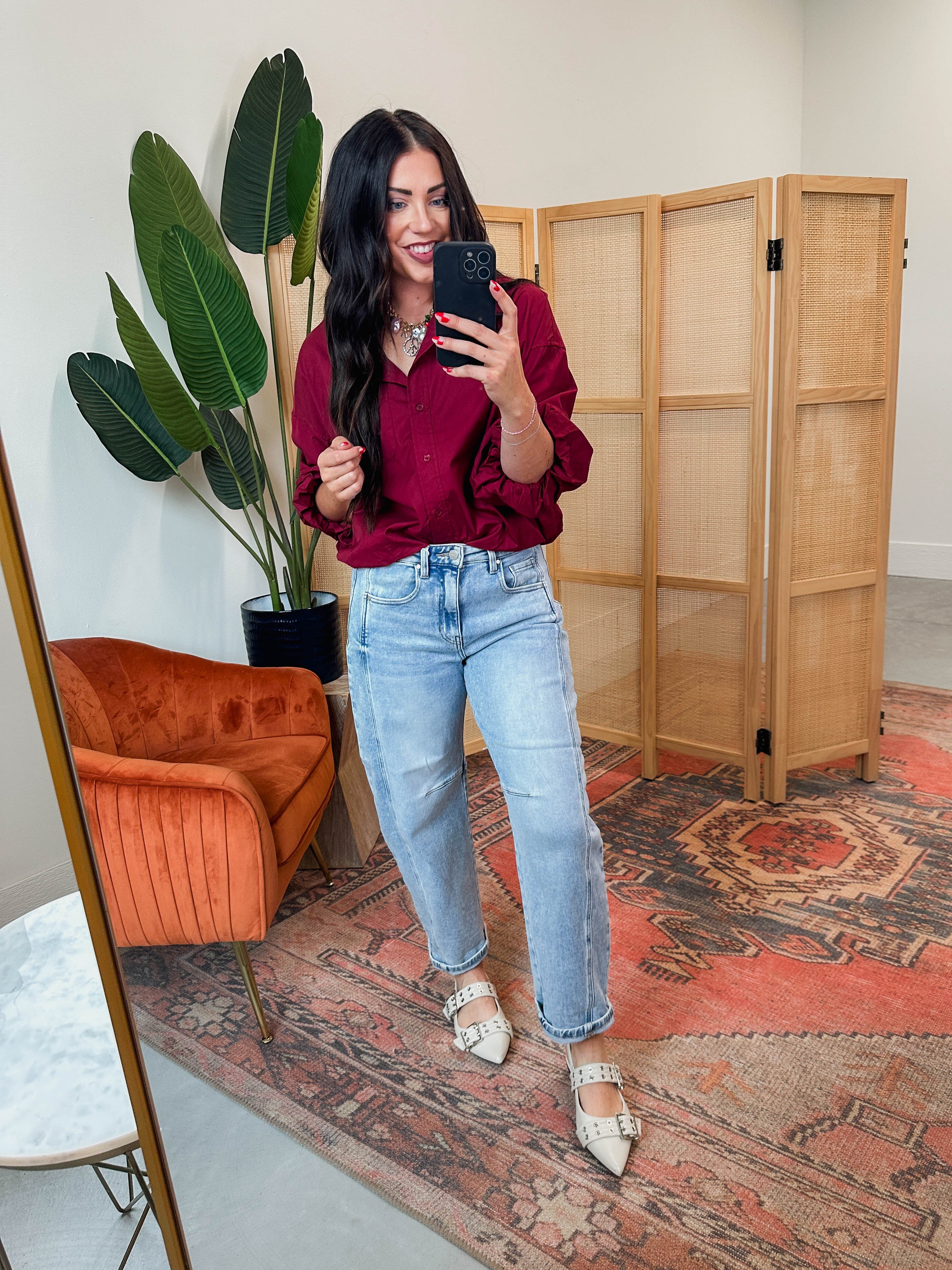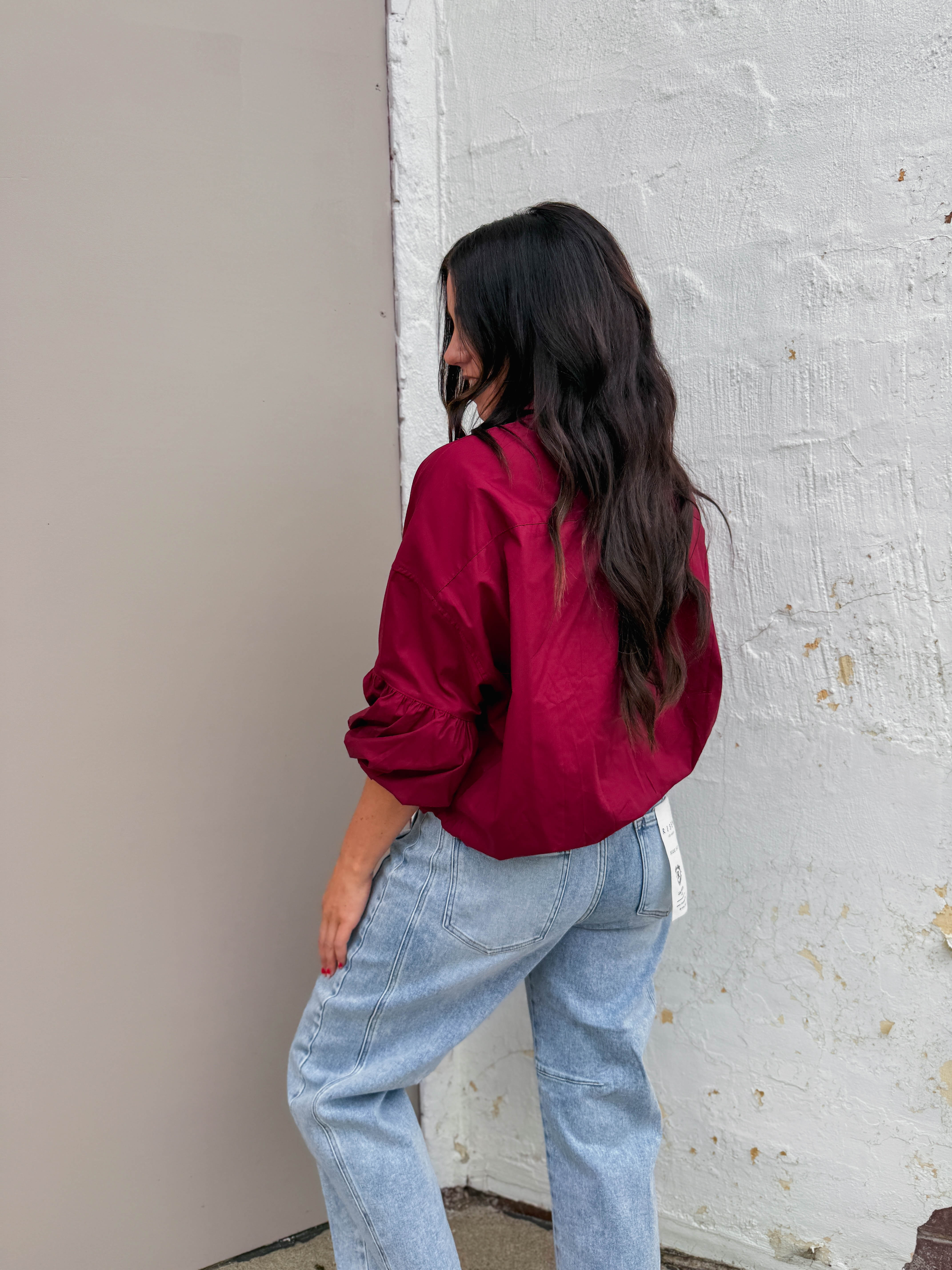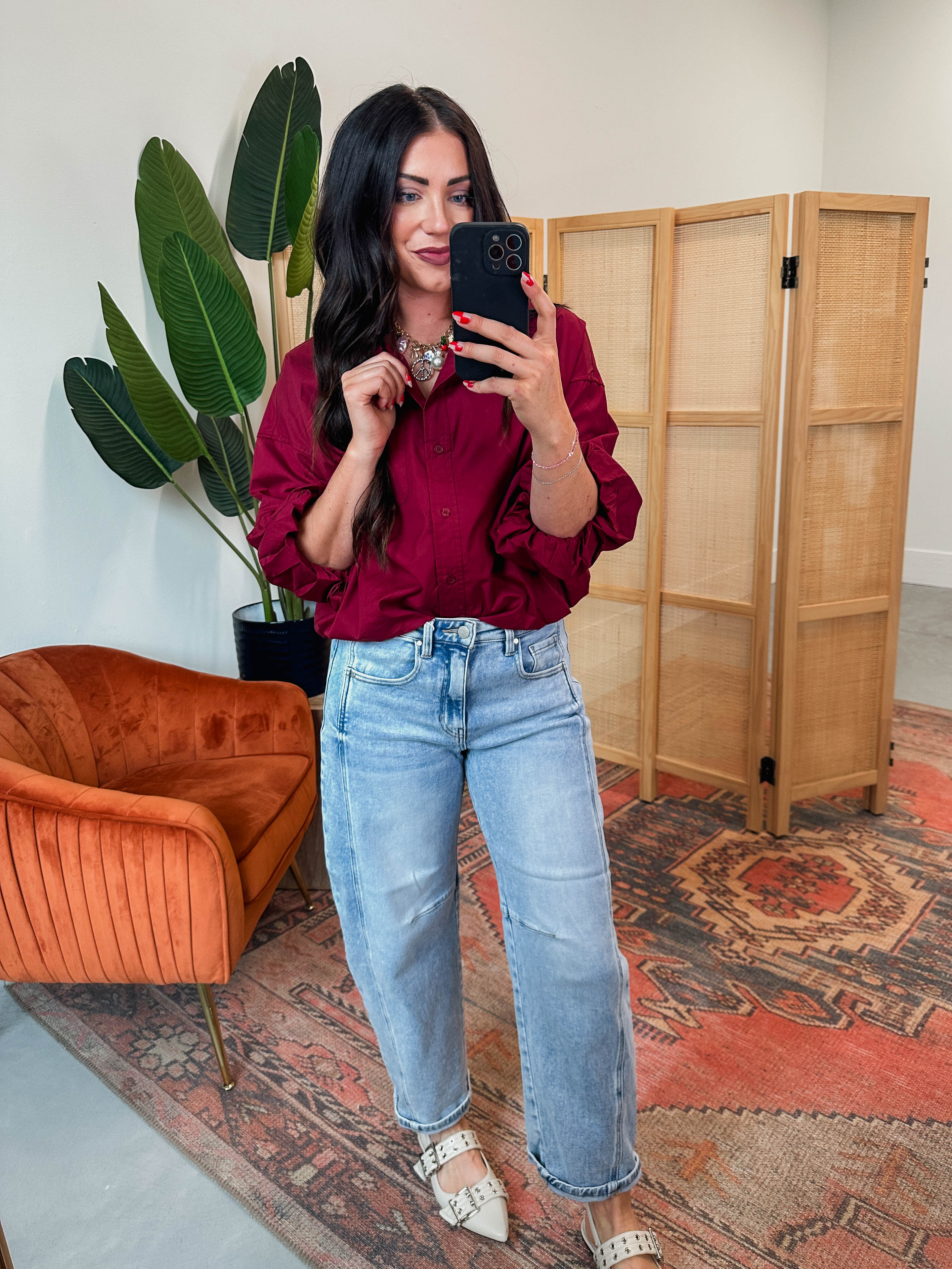 The Jude Top brings fun to your wardrobe with its collared neckline and playful balloon short sleeves. Featuring a button-down placket and a trendy bubble hem, it's perfect for effortlessly transitioning from work to weekend looks.