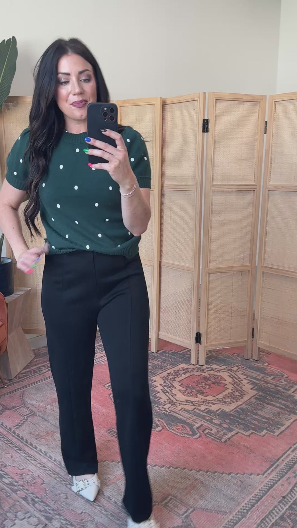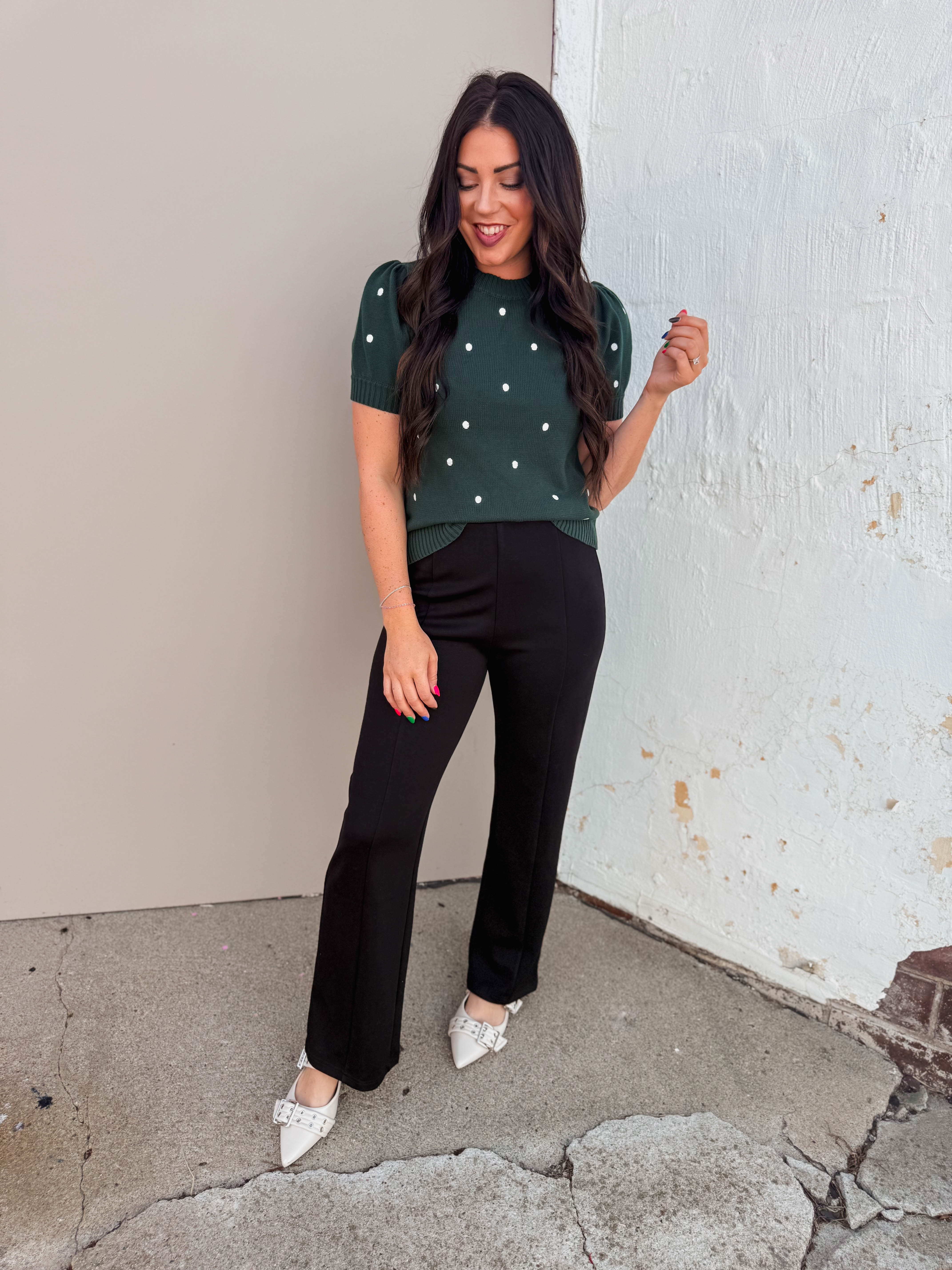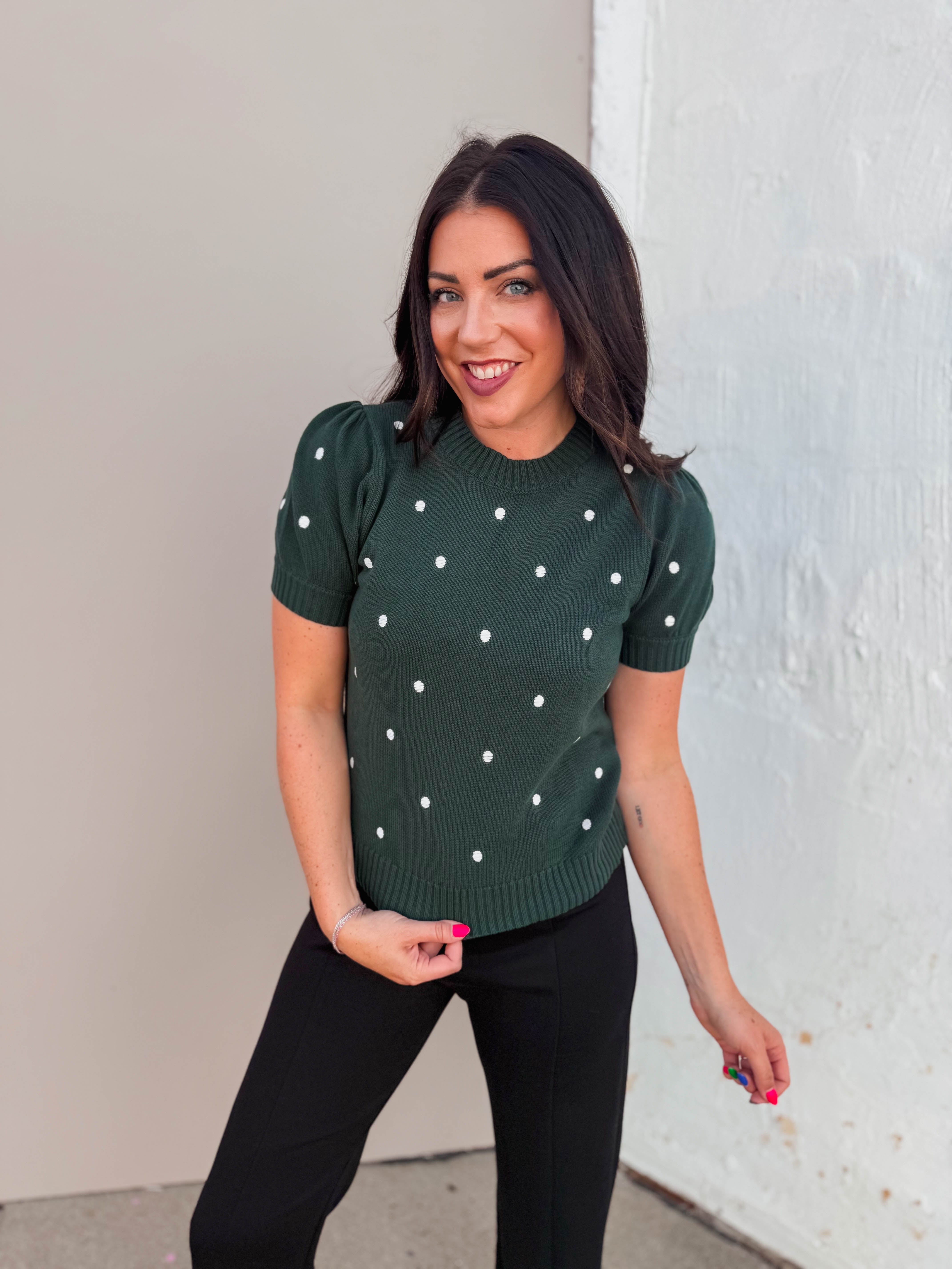This Hunter Green knit top features a playful polka dot embroidery, round neck, and trendy short puff sleeves. Perfect for work or weekend, it adds a fun, stylish touch to any outfit.