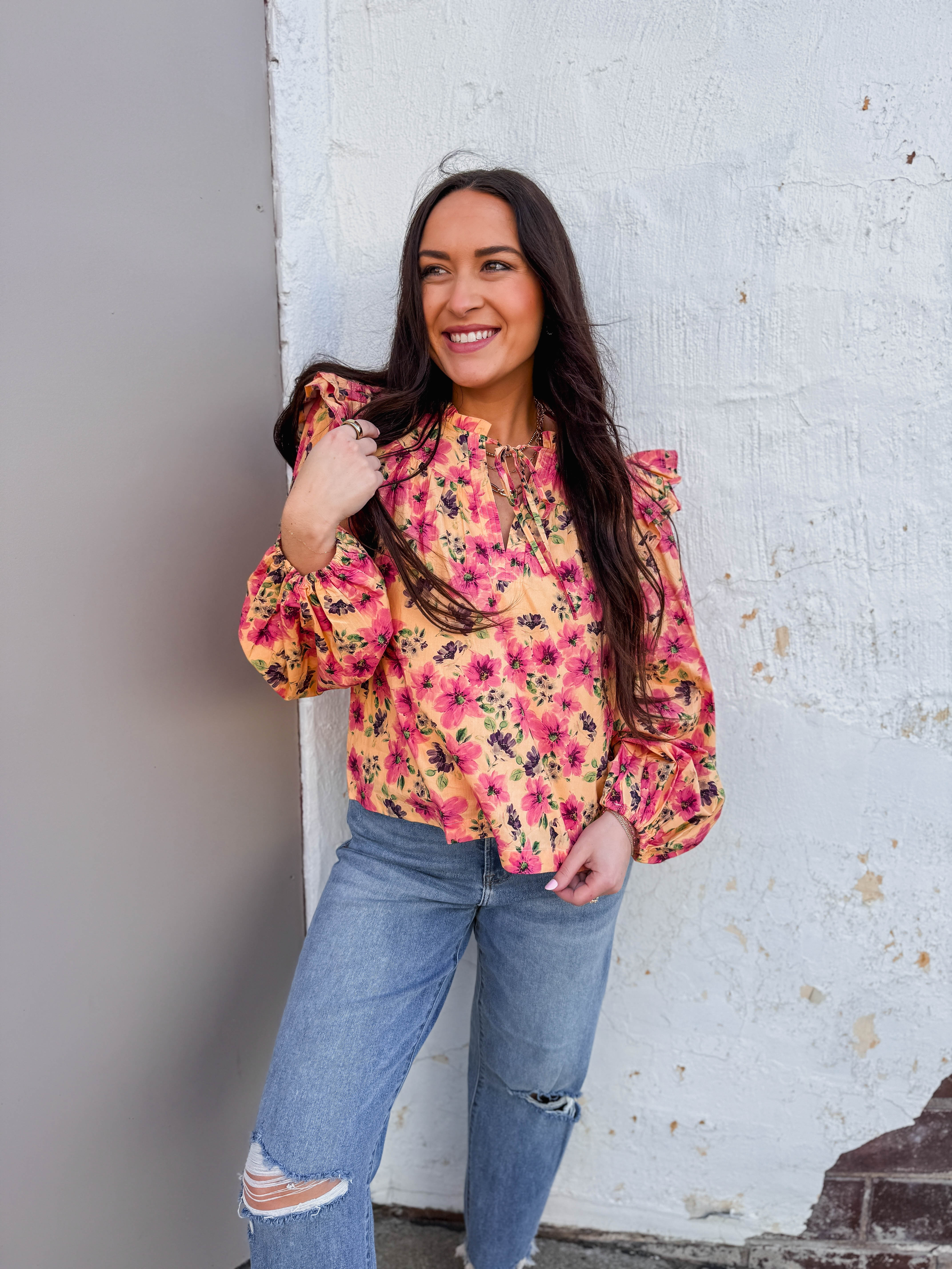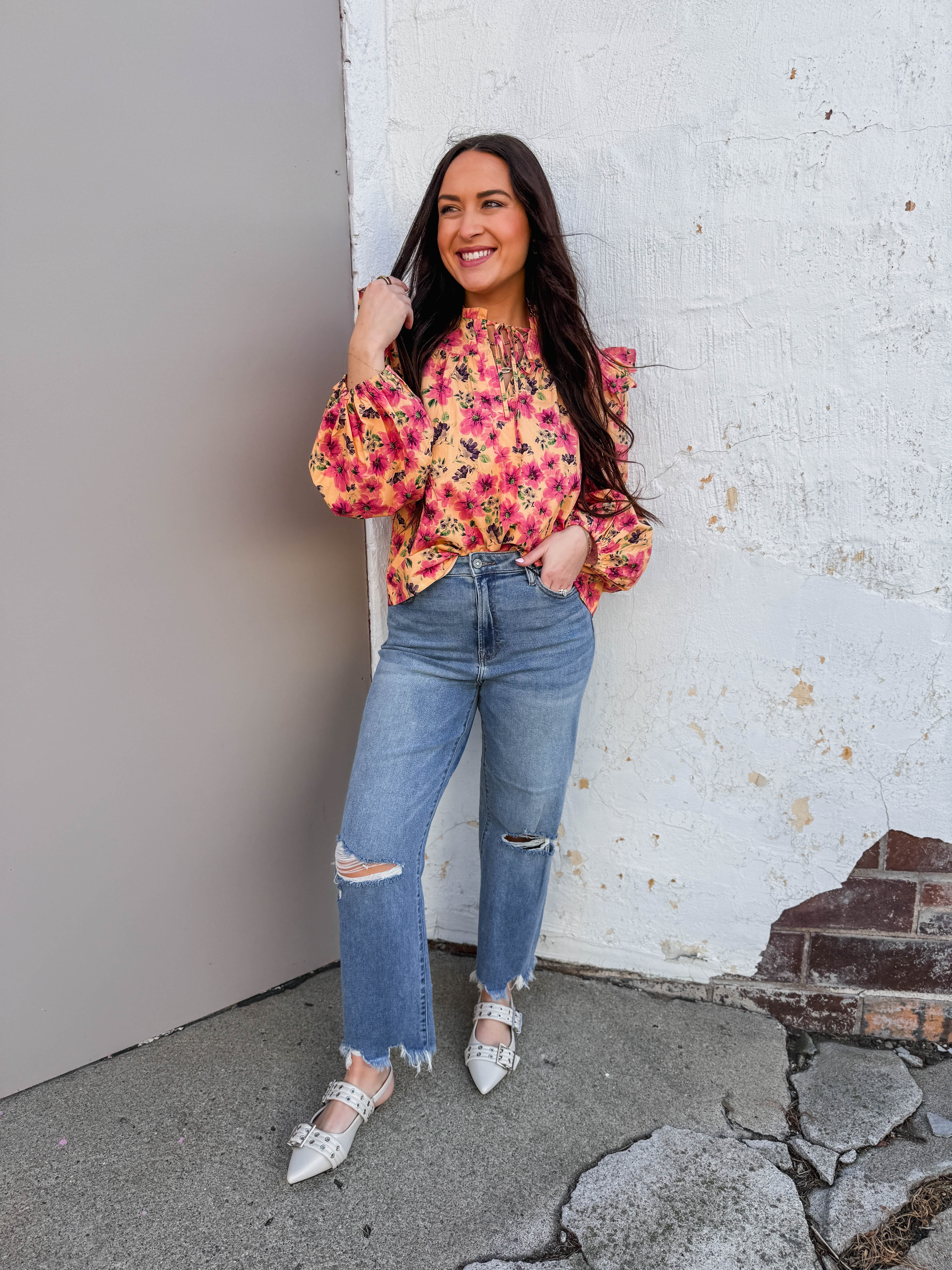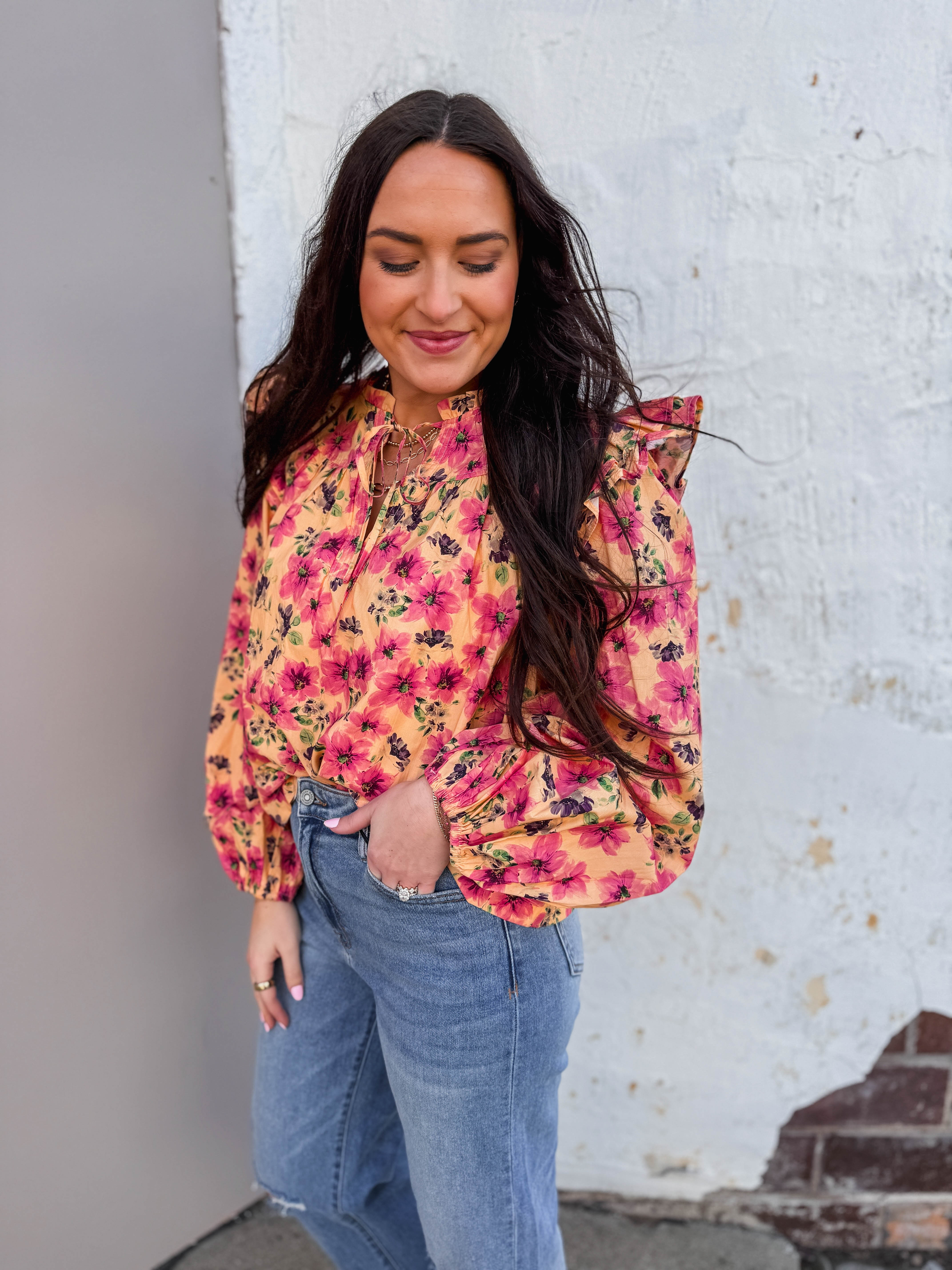 Add a fun pop of color to your wardrobe with the Kimberly Top. Featuring a flattering notched V-neck, long puff sleeves, and playful ruffle details, this floral print blouse transitions effortlessly from work to weekend.