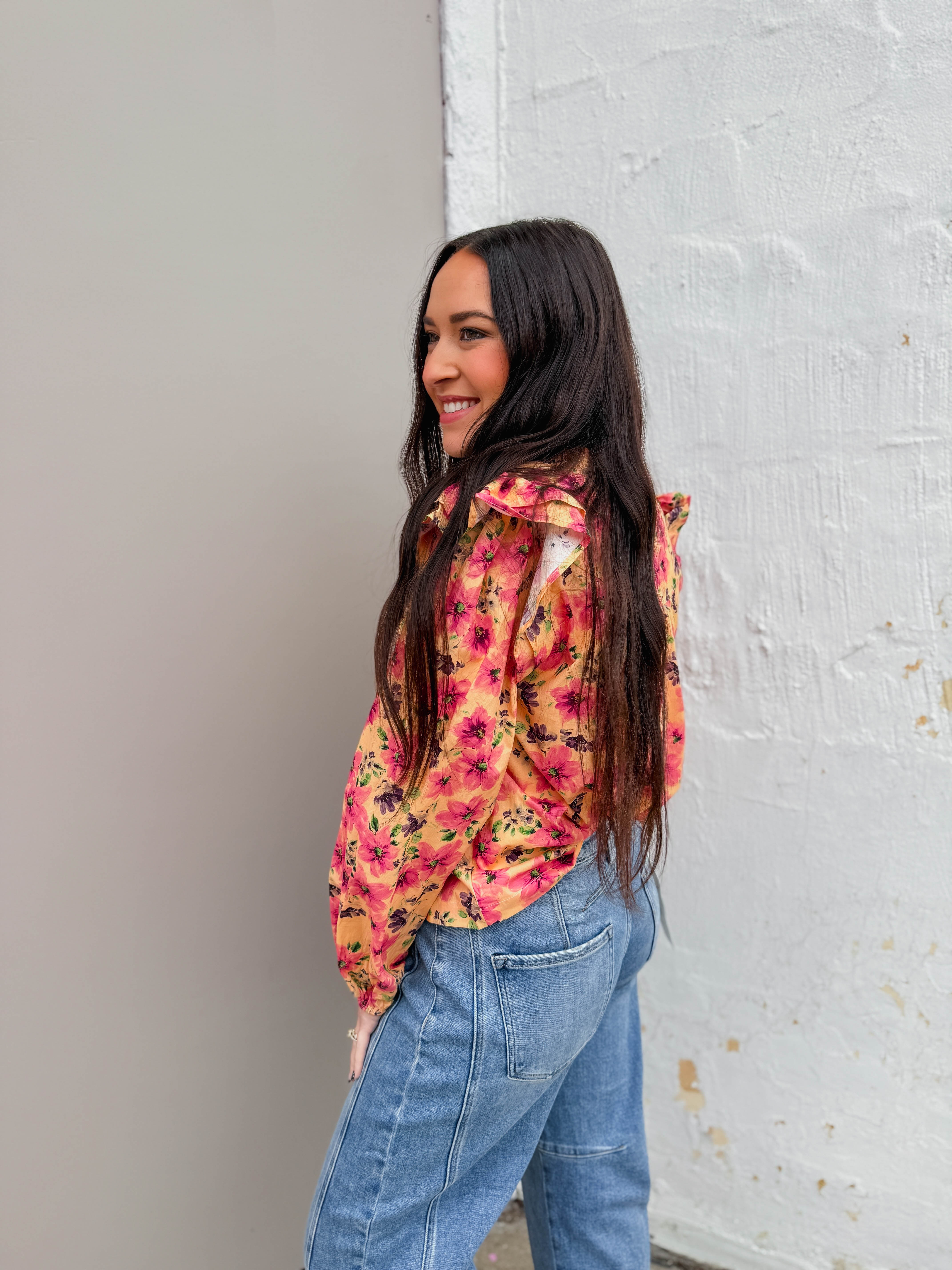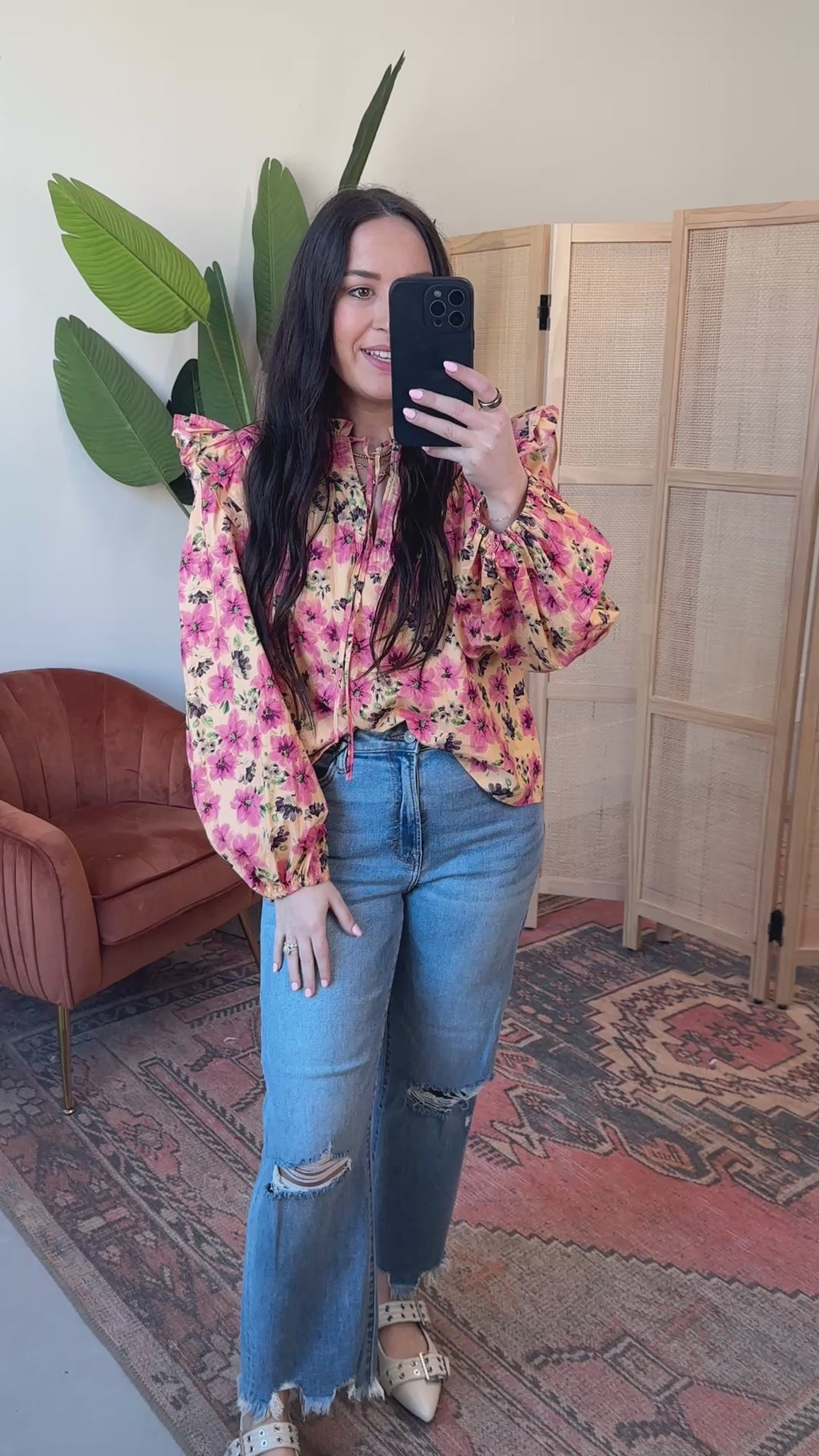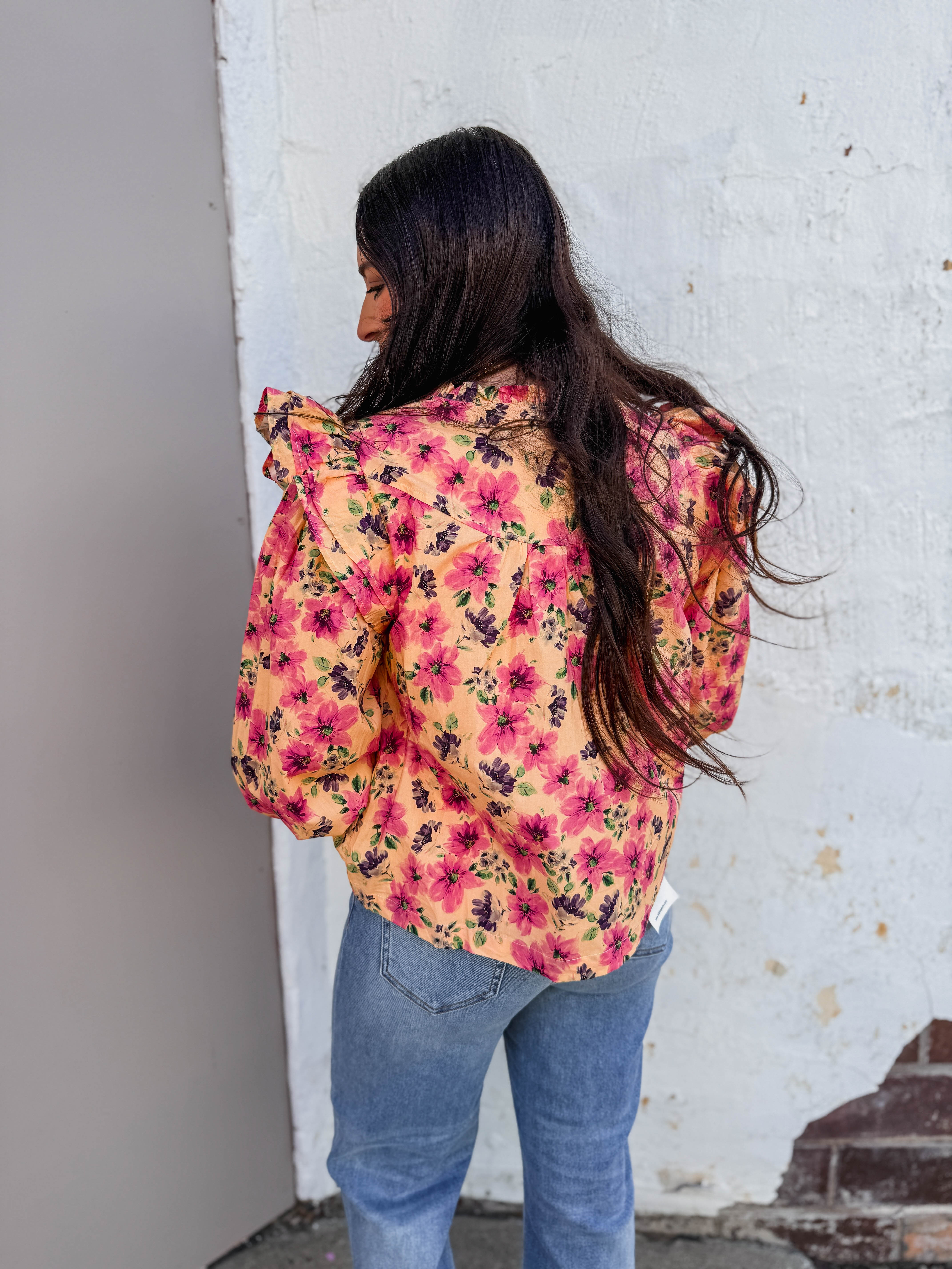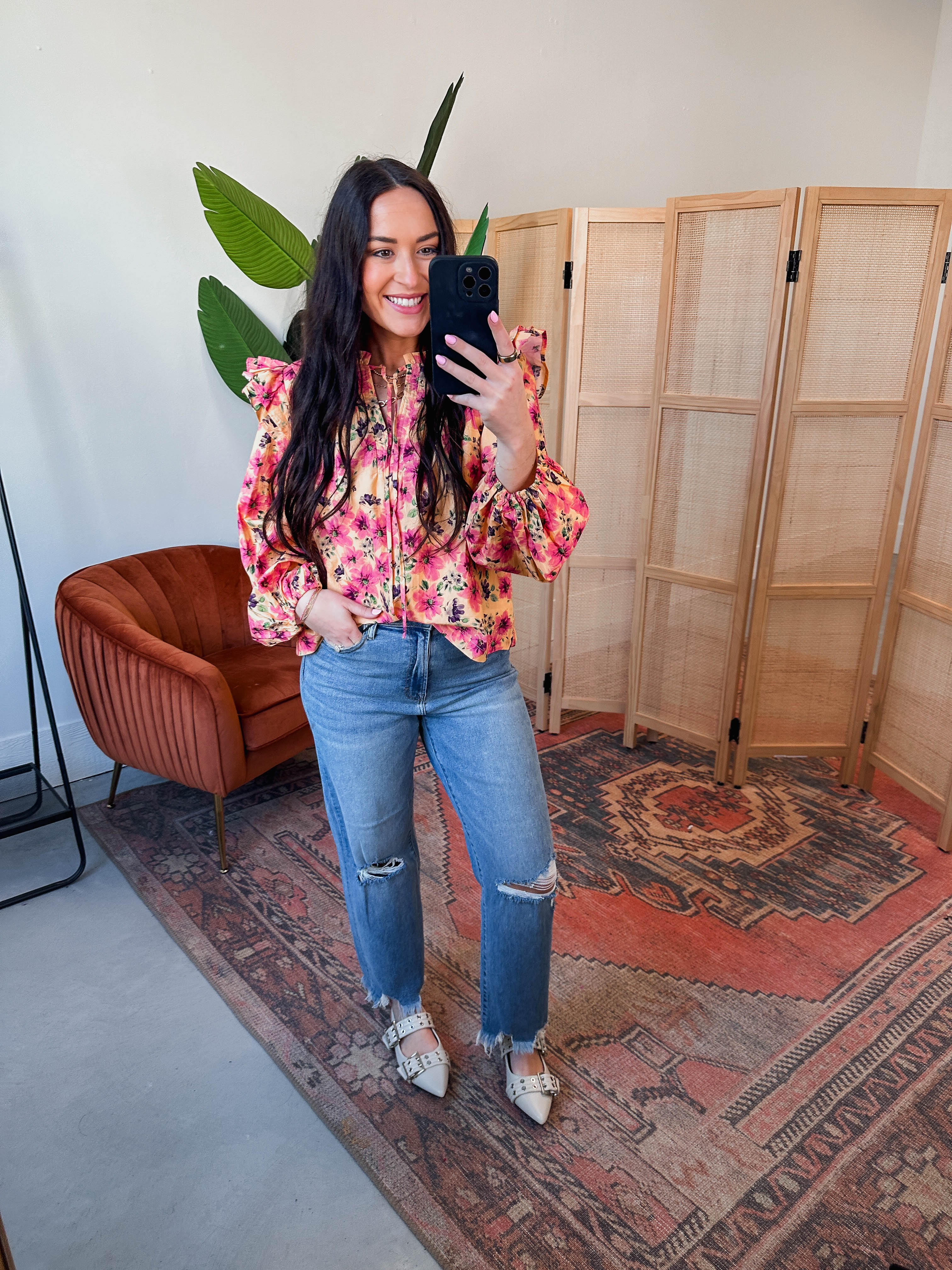 Add a fun pop of color to your wardrobe with the Kimberly Top. Featuring a flattering notched V-neck, long puff sleeves, and playful ruffle details, this floral print blouse transitions effortlessly from work to weekend.