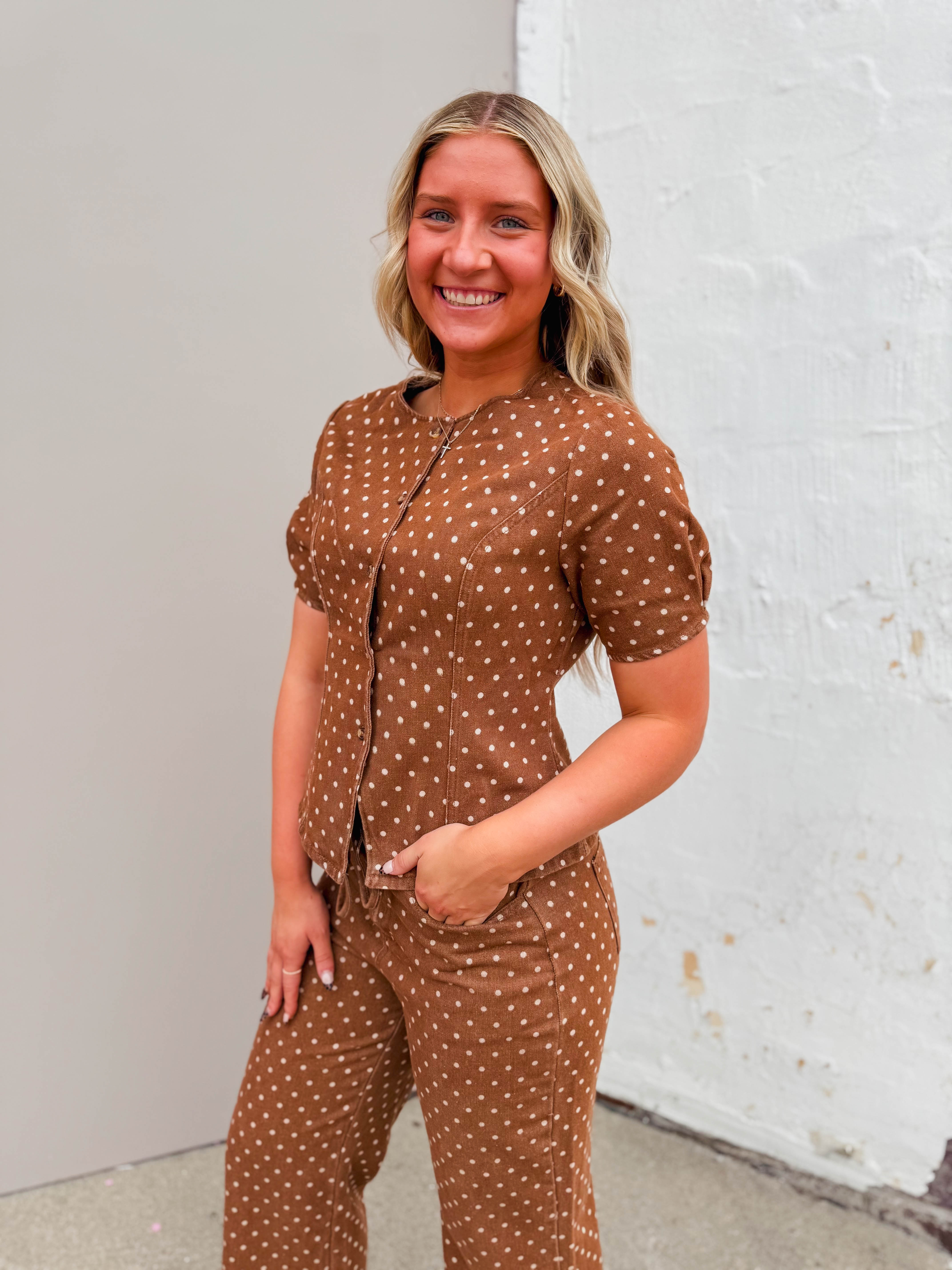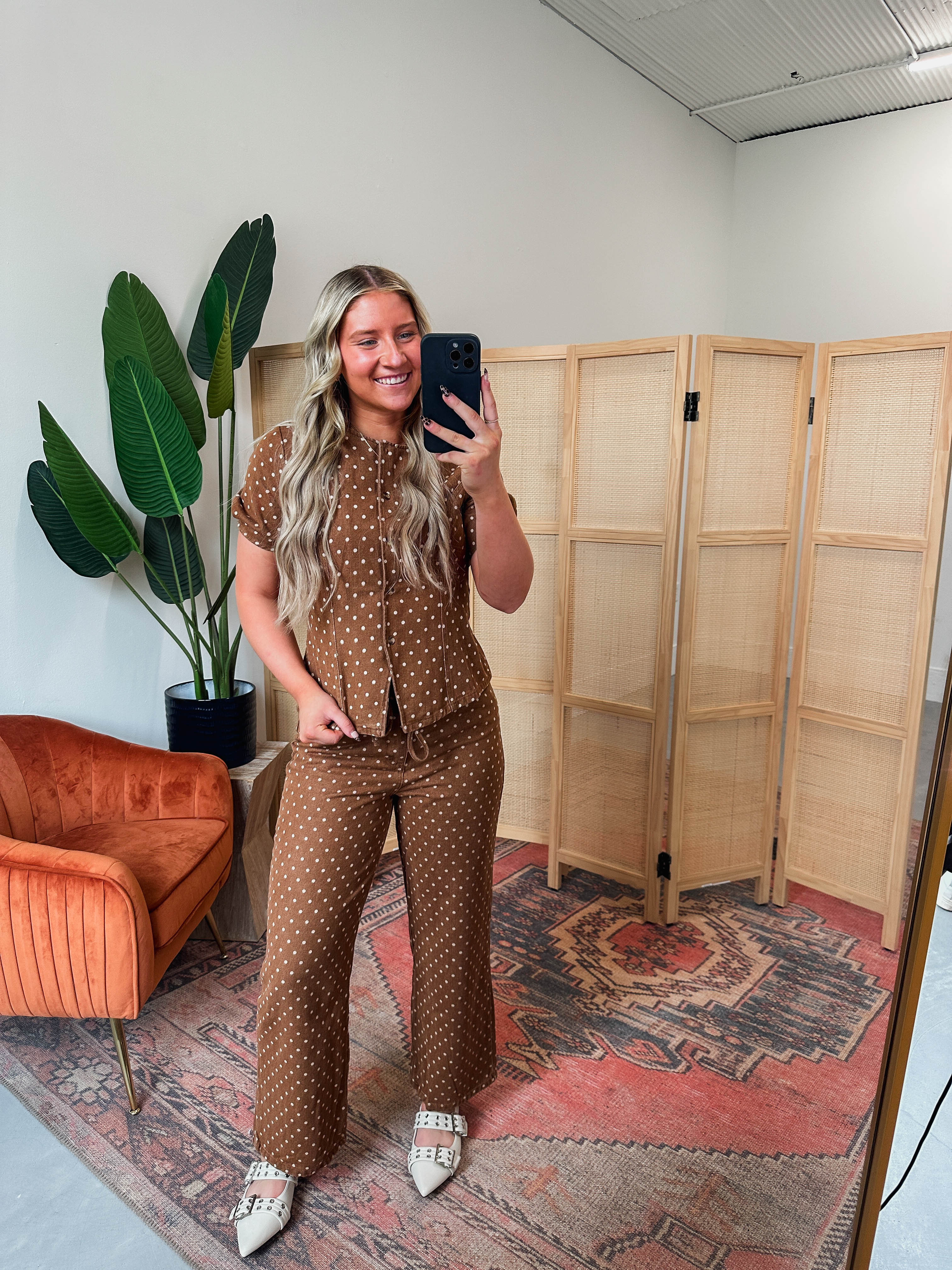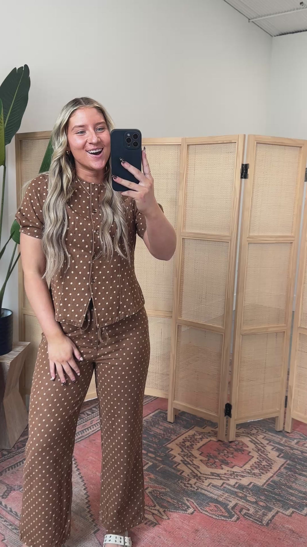 The Mabel Polka Dot Top is your go-to for day-to-night style. Featuring a cute crew neck, easy short sleeves, and a button-front closure, it’s playful yet polished. The classic polka dot print adds a fun twist, perfect for work hours or weekend vibes.