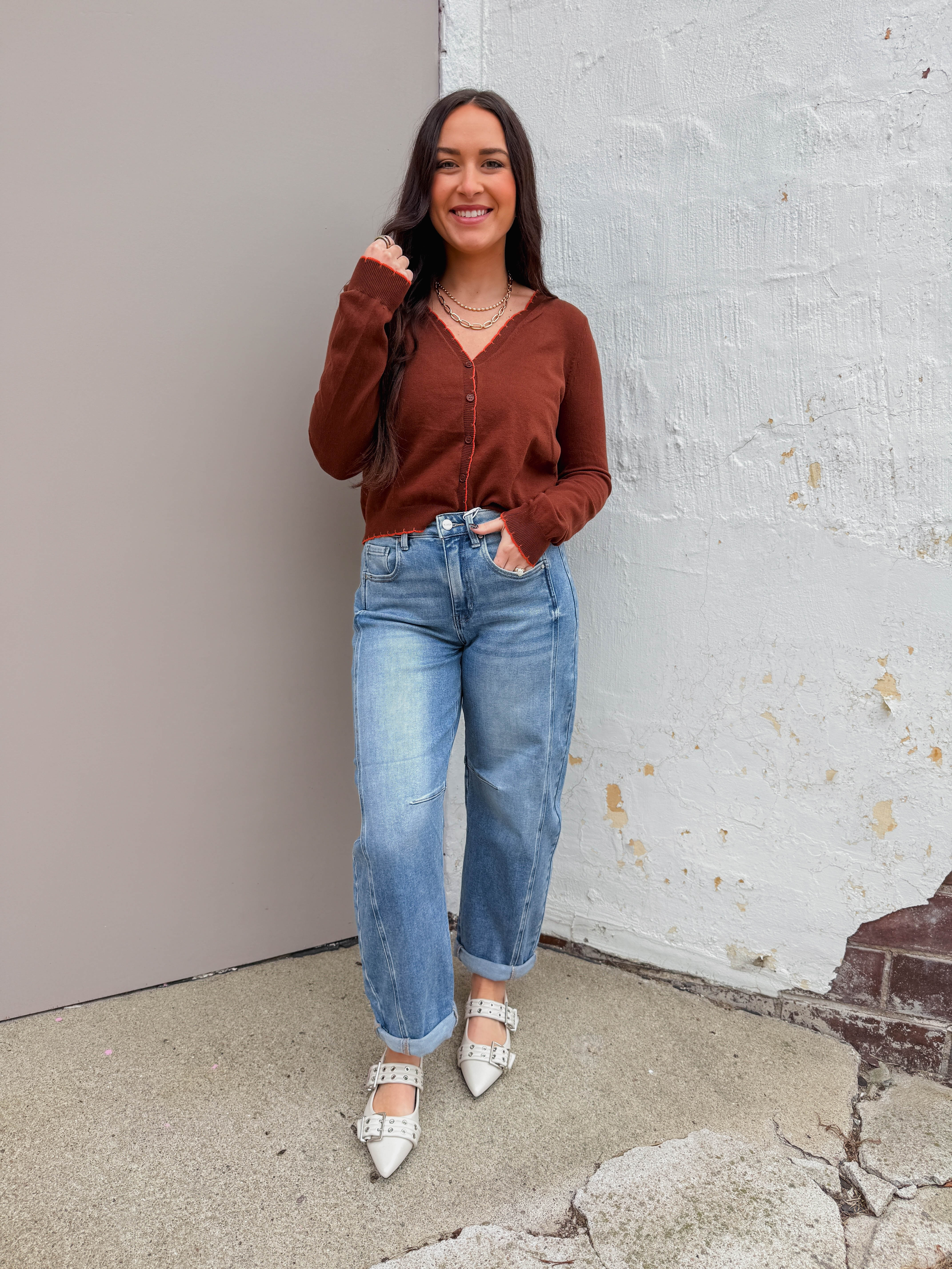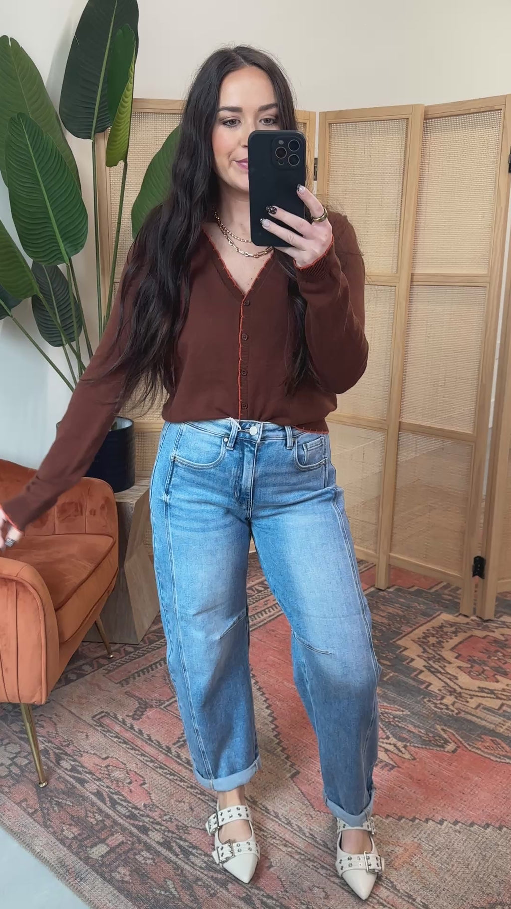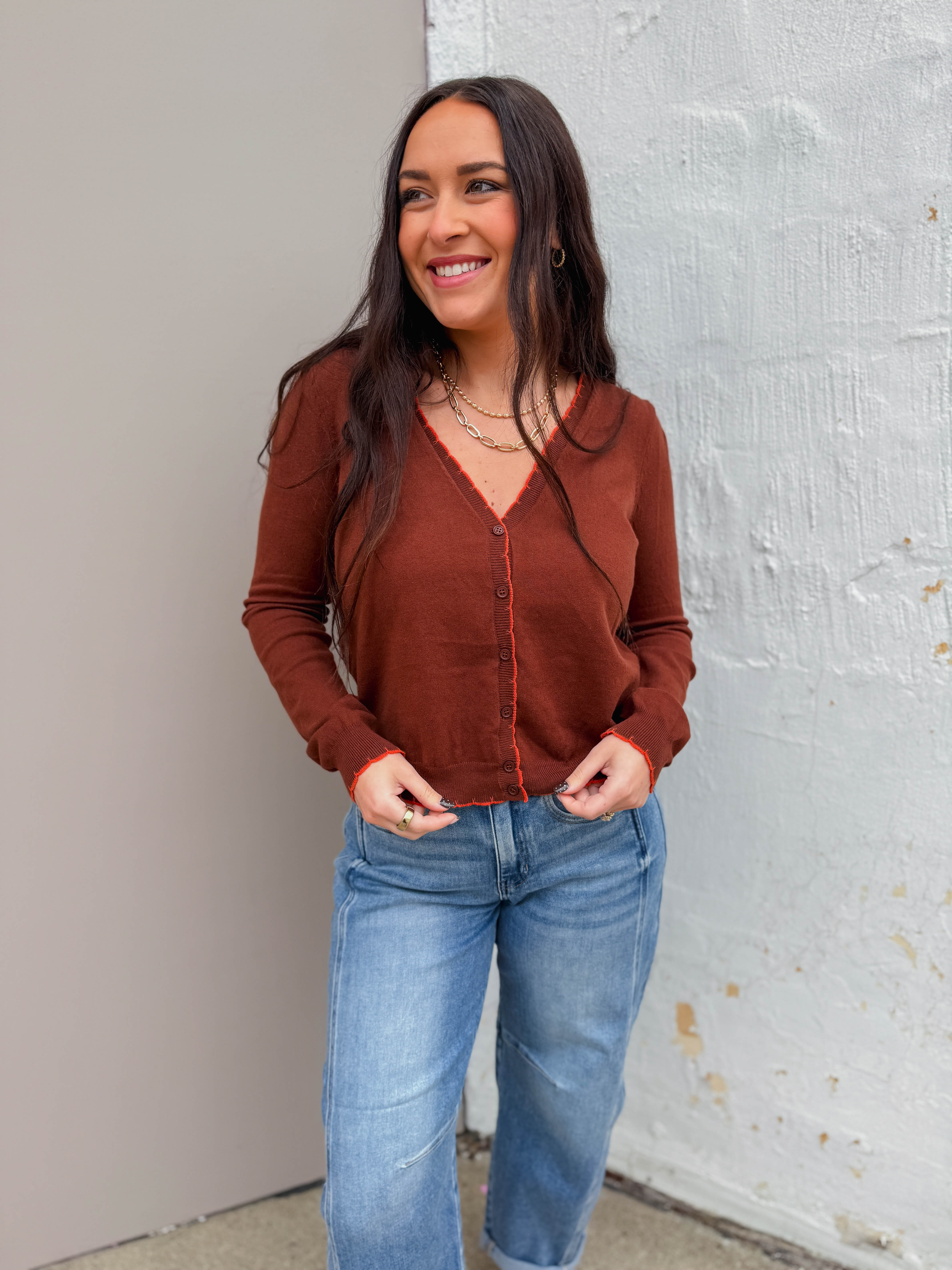 Cozy up in the Nadia Cardigan, featuring a playful V-neck and charming scalloped edges. With its button-front style and long sleeves, it’s perfect for effortless layering—from work meetings to weekend chill-outs. Add a splash of warm brown and orange to brighten your day!