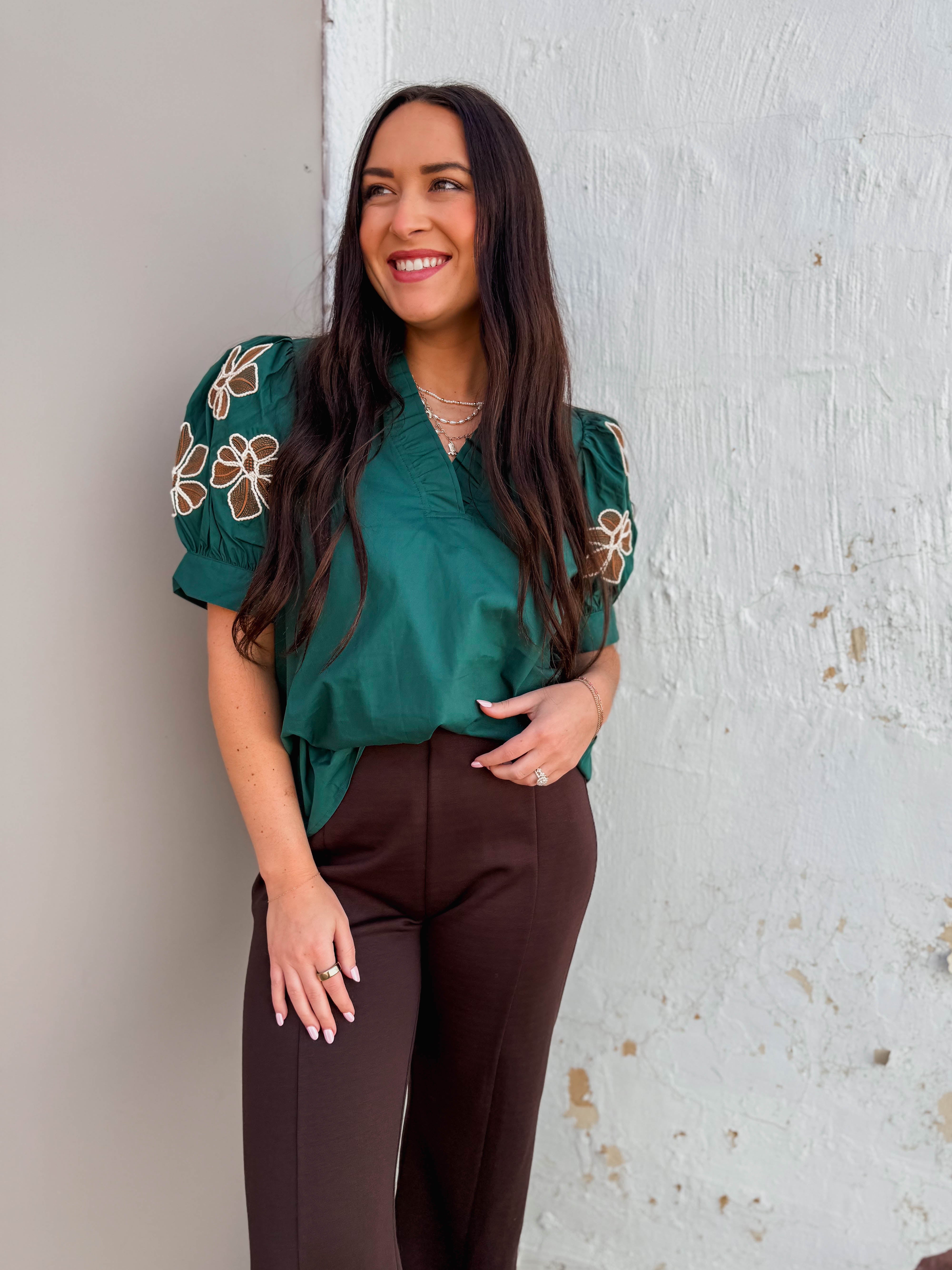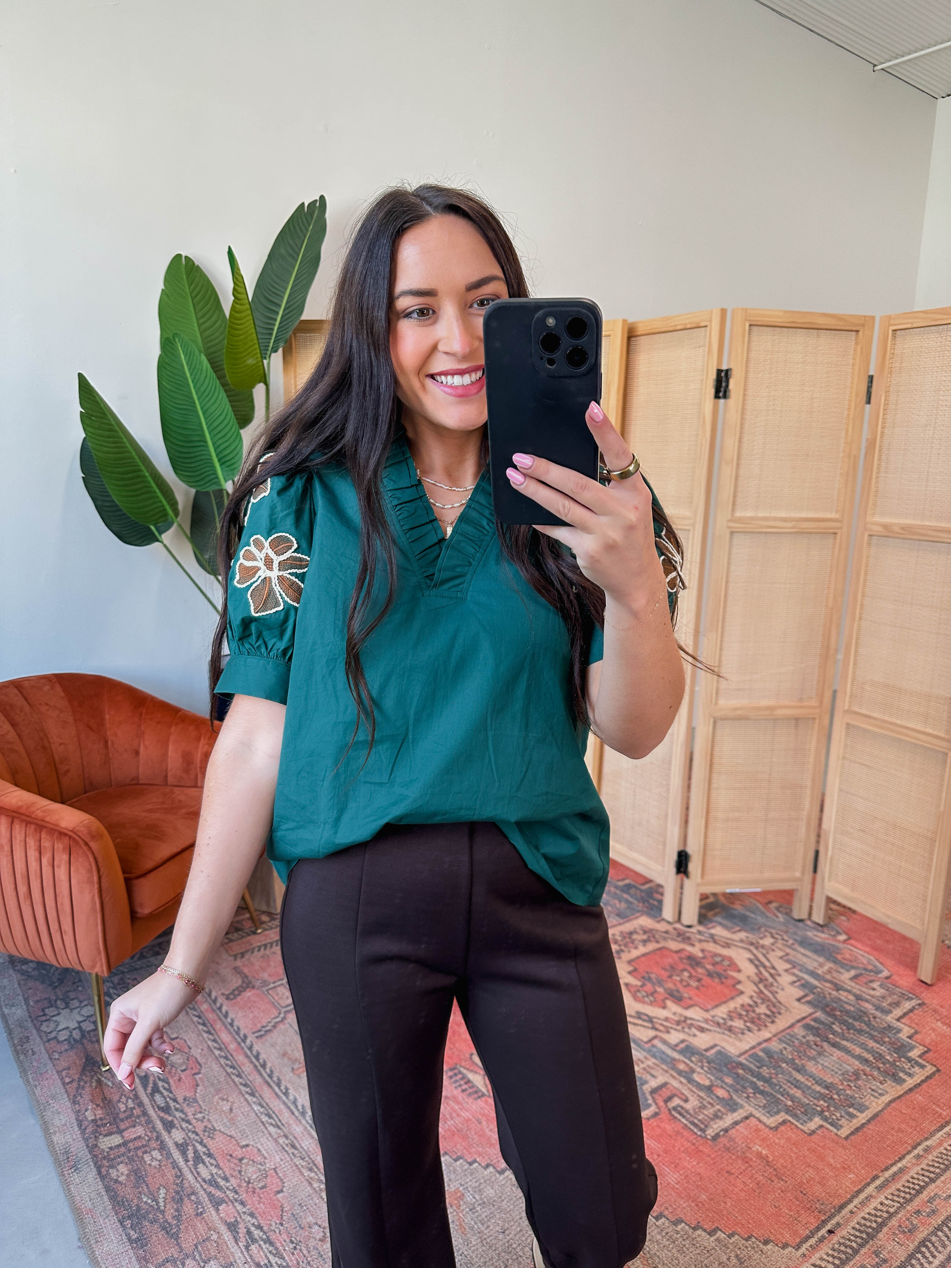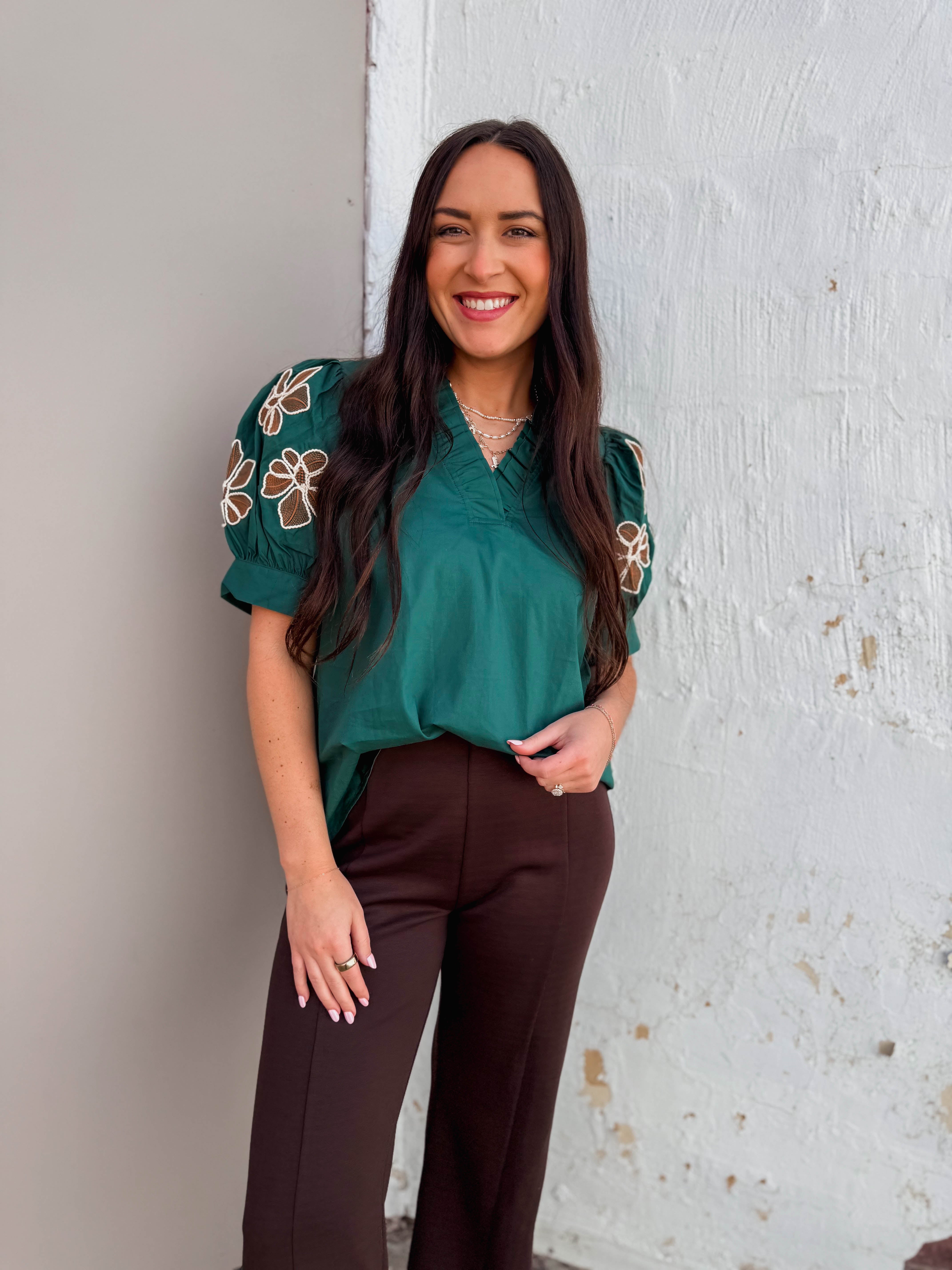 The Octavia Top features a flirty V-neck and charming short puff sleeves with playful ruffle accents. Delicate floral embroidered appliques add a sweet touch that’s perfect for taking you from work to weekend in style.