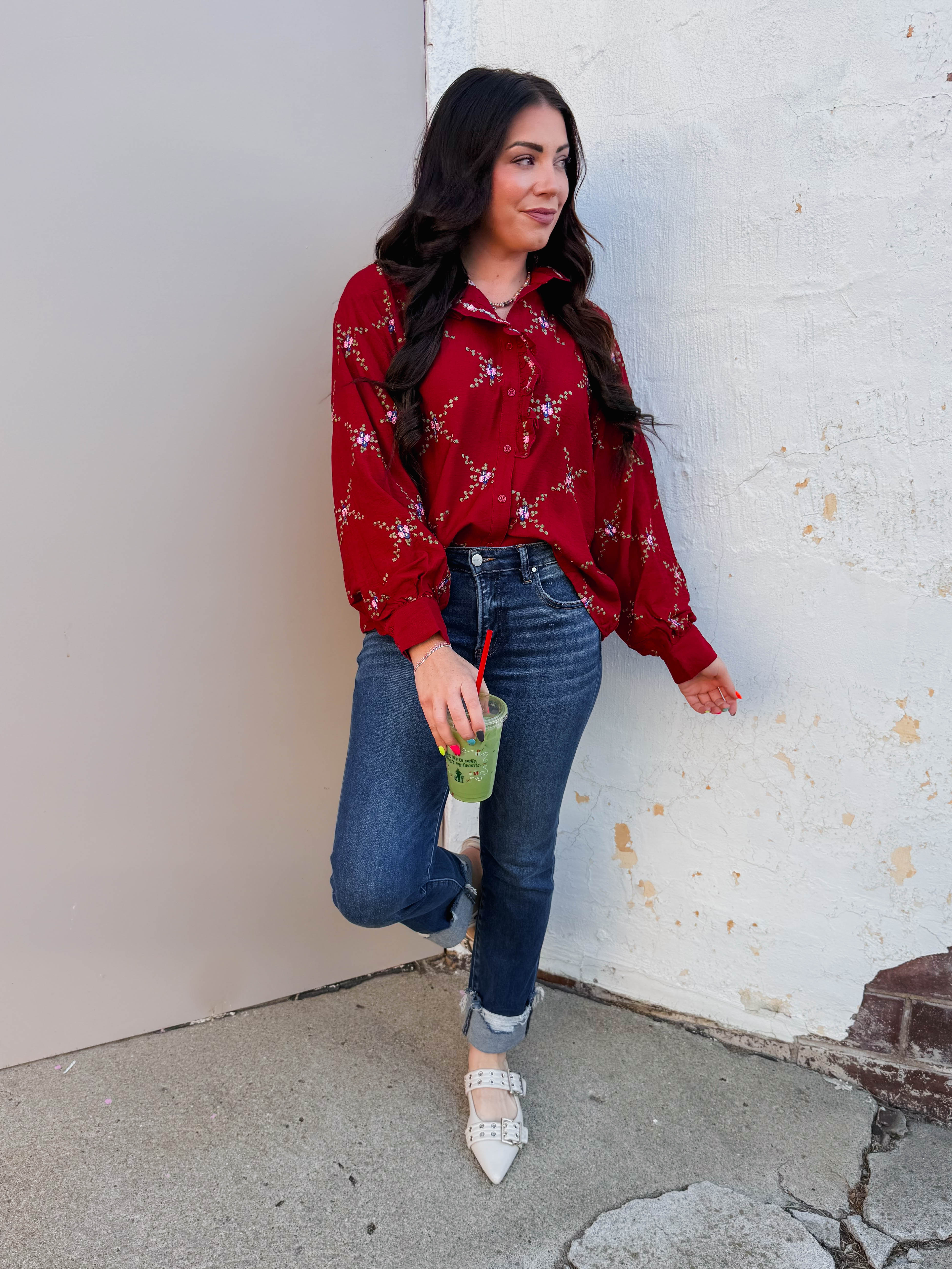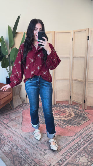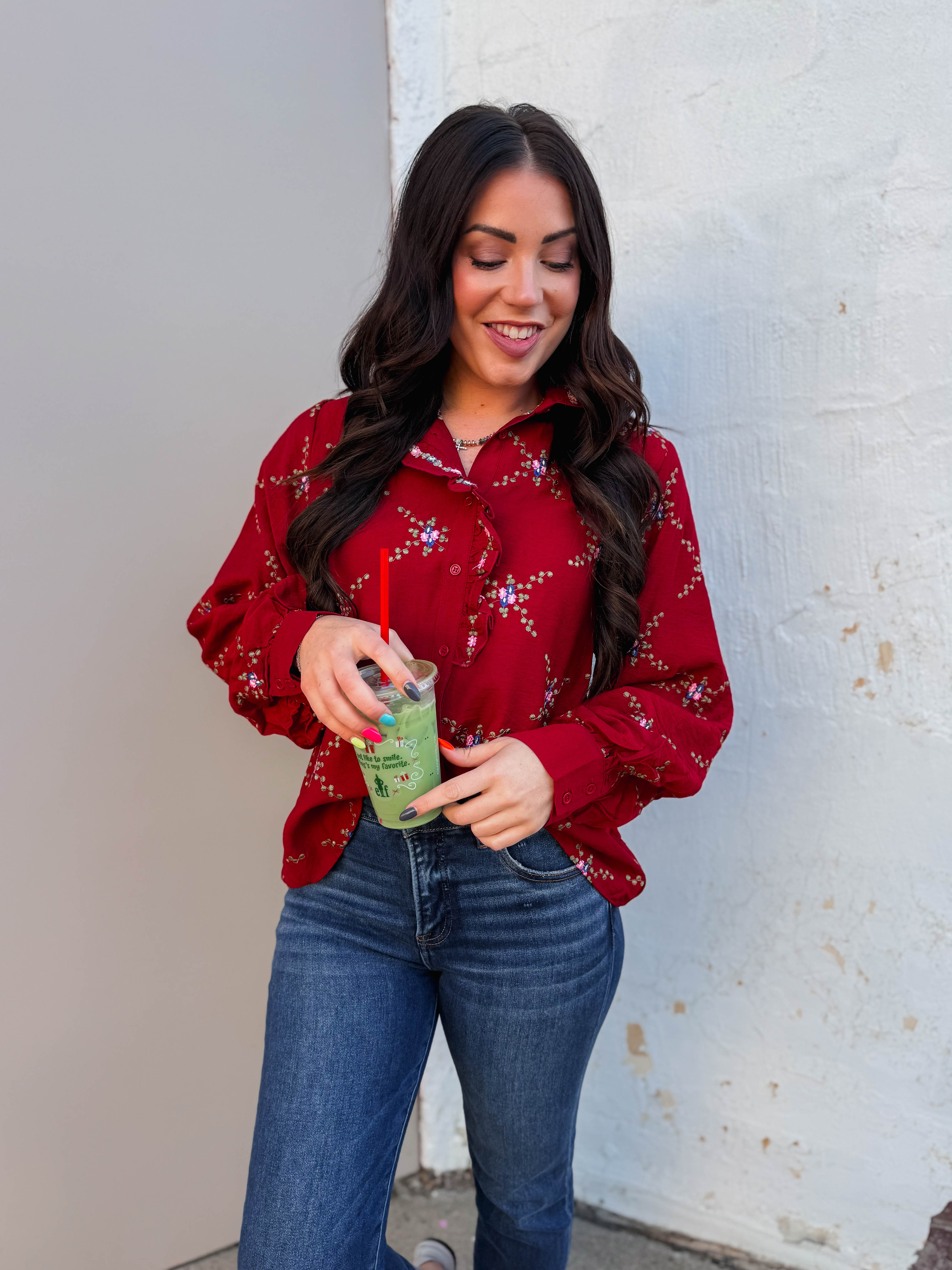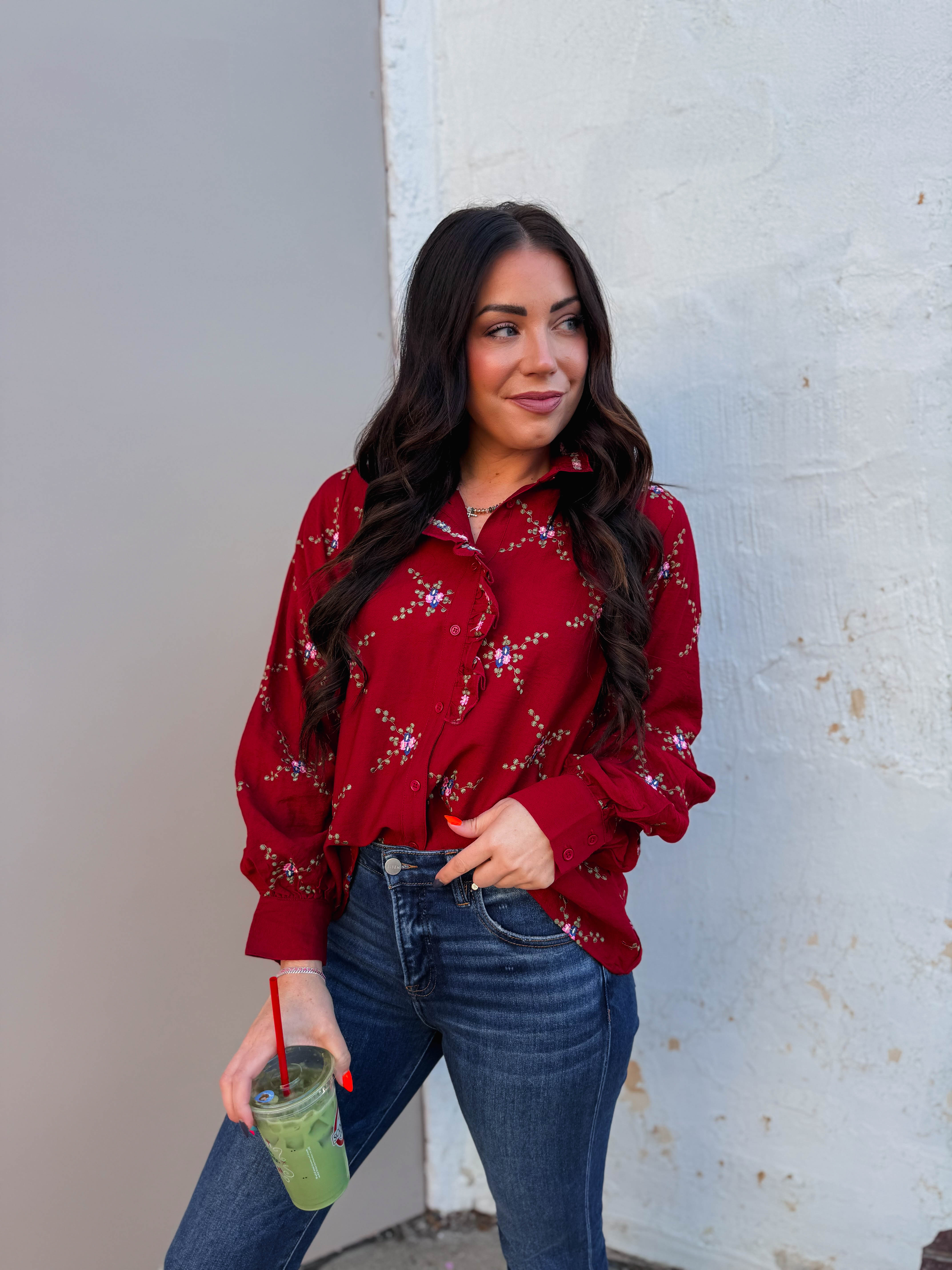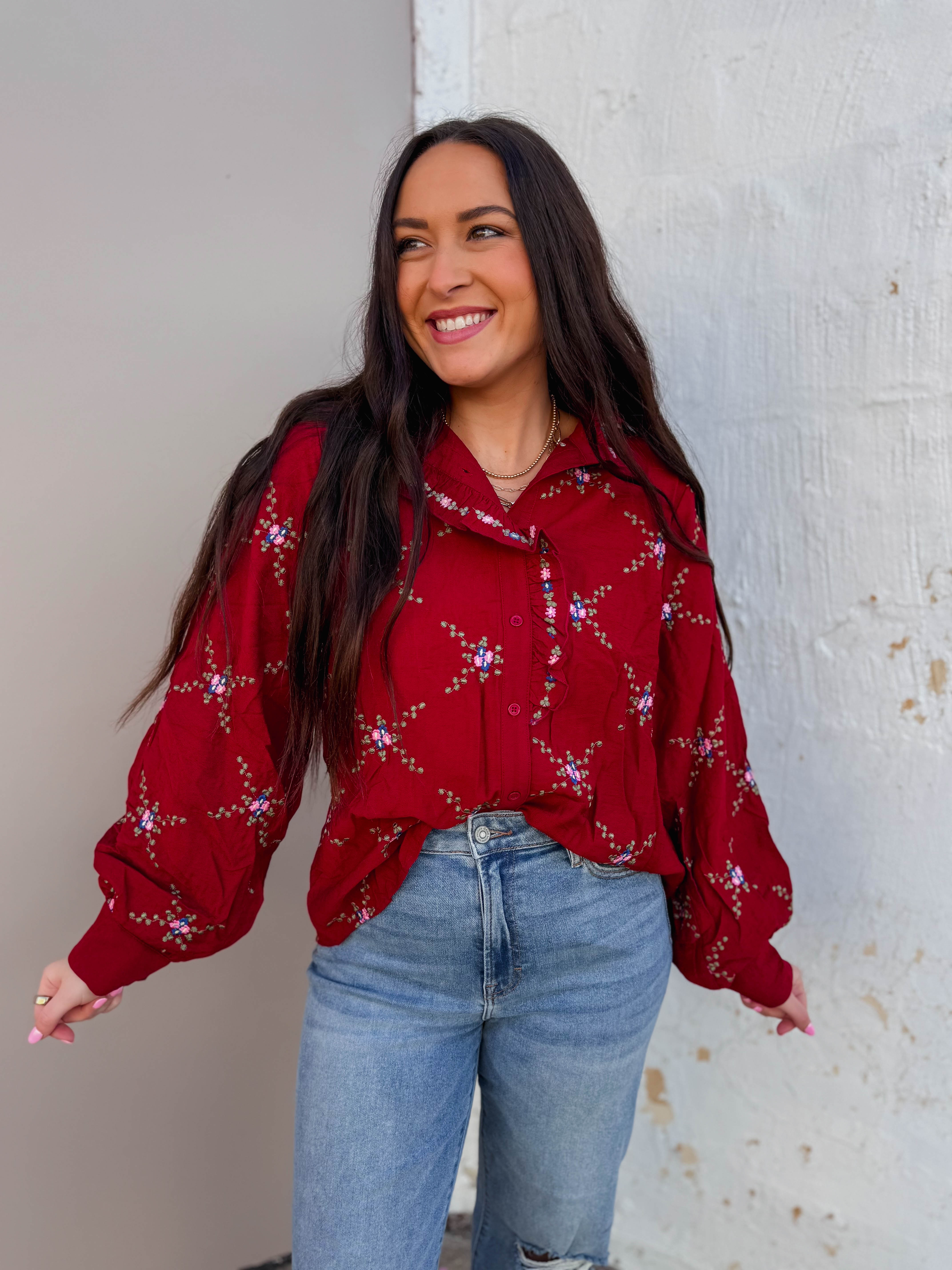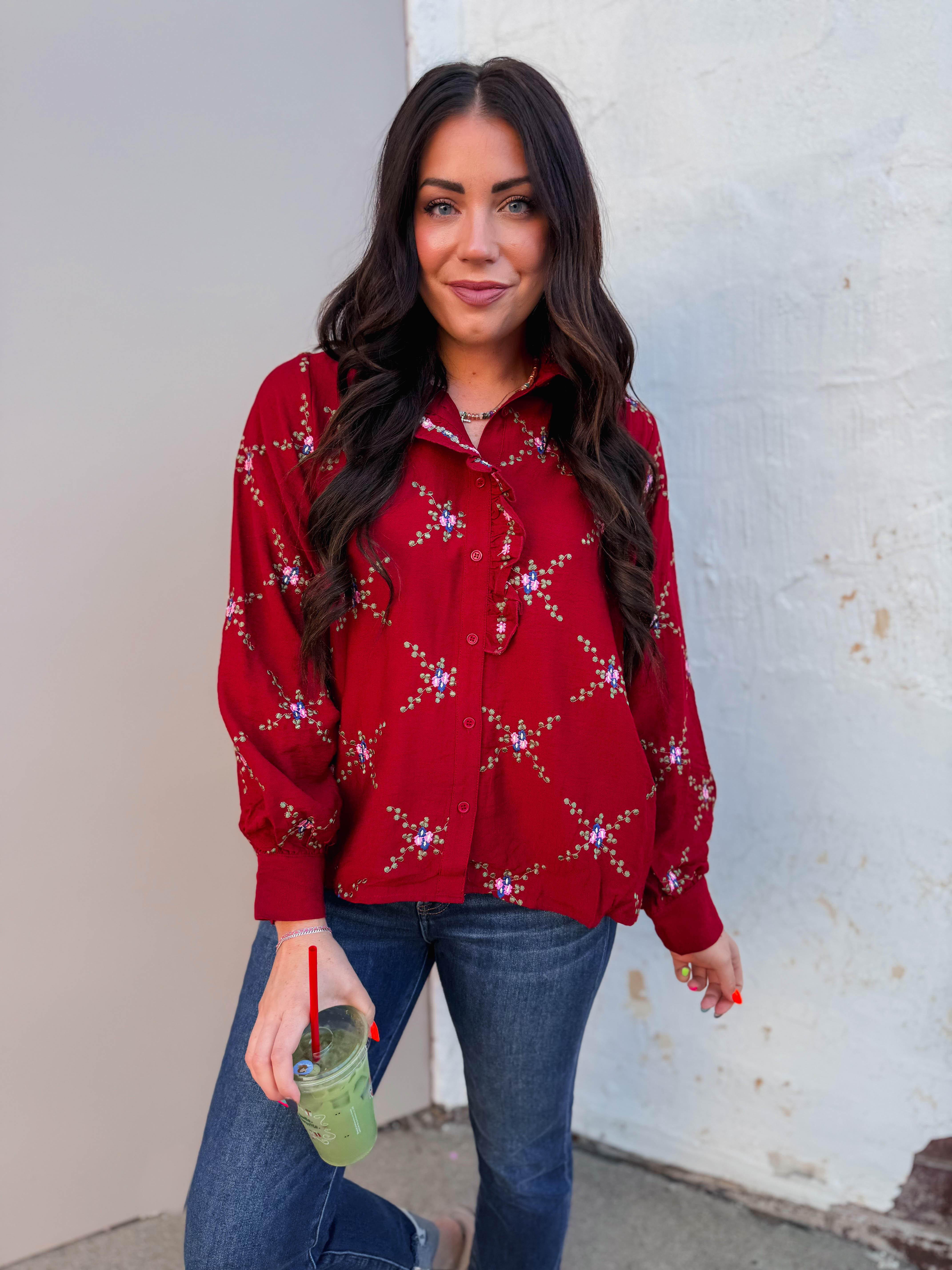 The Ophelia Floral Top features a charming round neckline and delicate floral embroidery that adds a fresh, feminine touch. Its long sleeves and button-front closure offer versatile style, while playful ruffle details bring fun flair. Perfect for transitioning effortlessly from workdays to weekends.