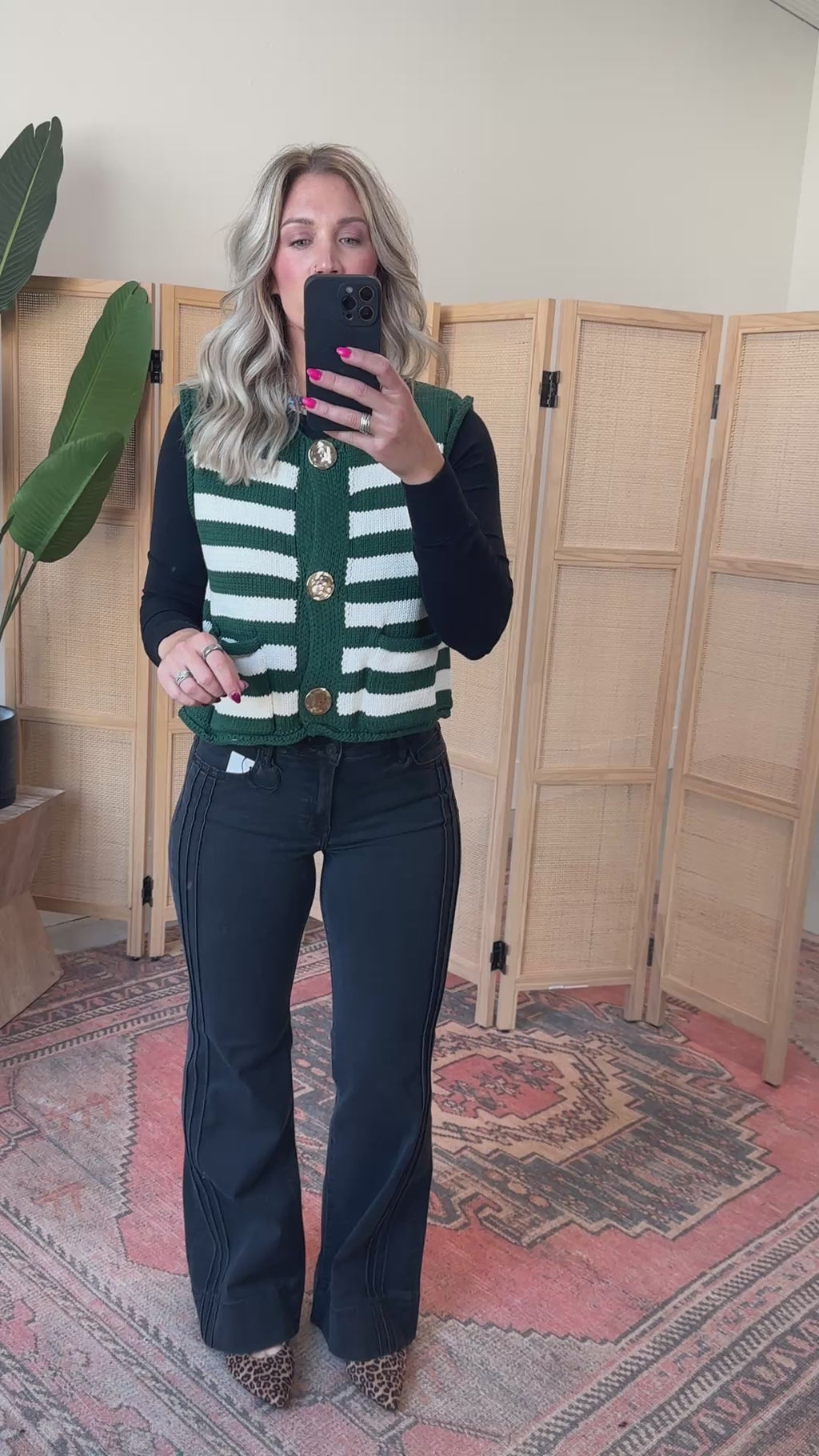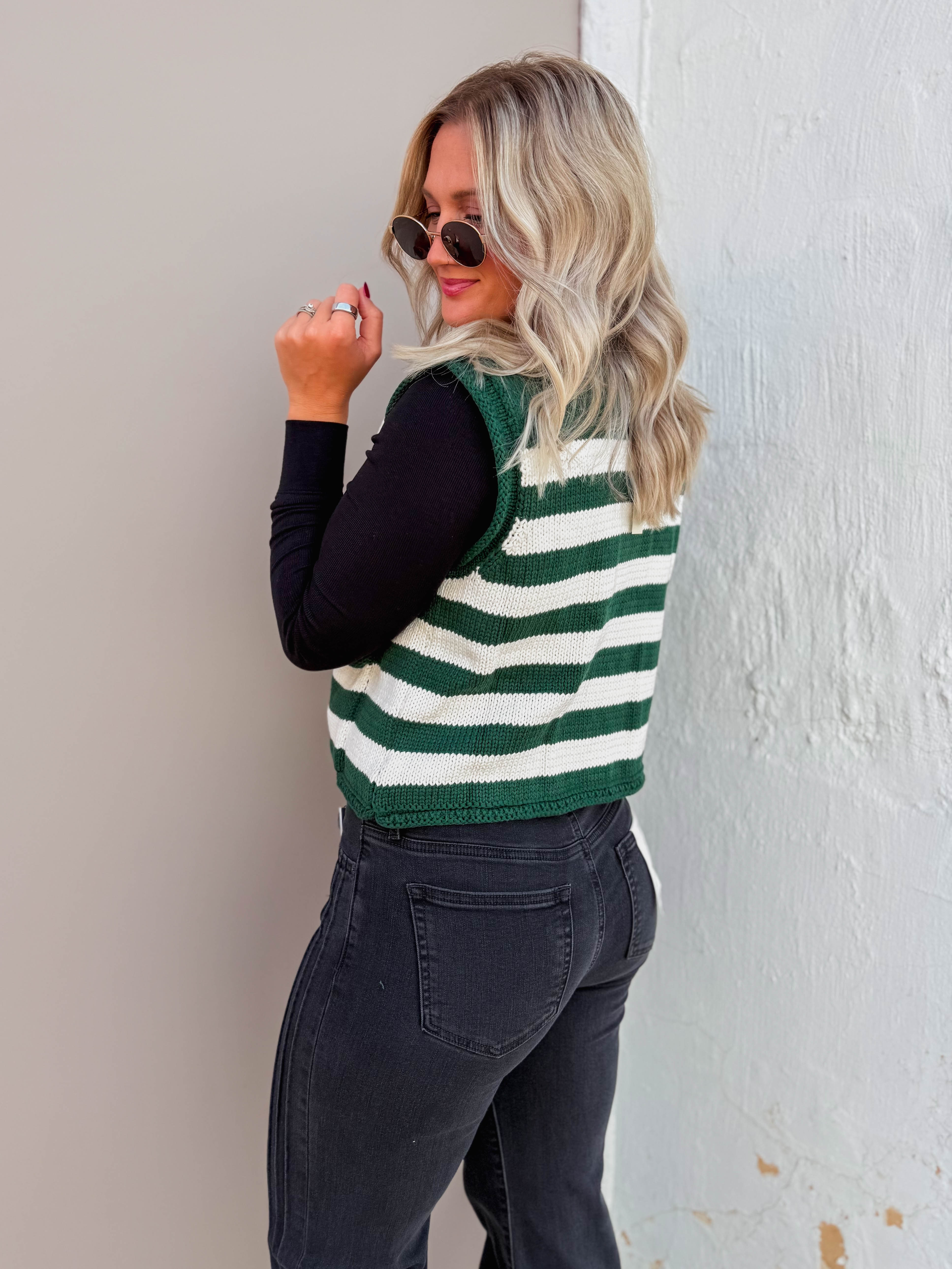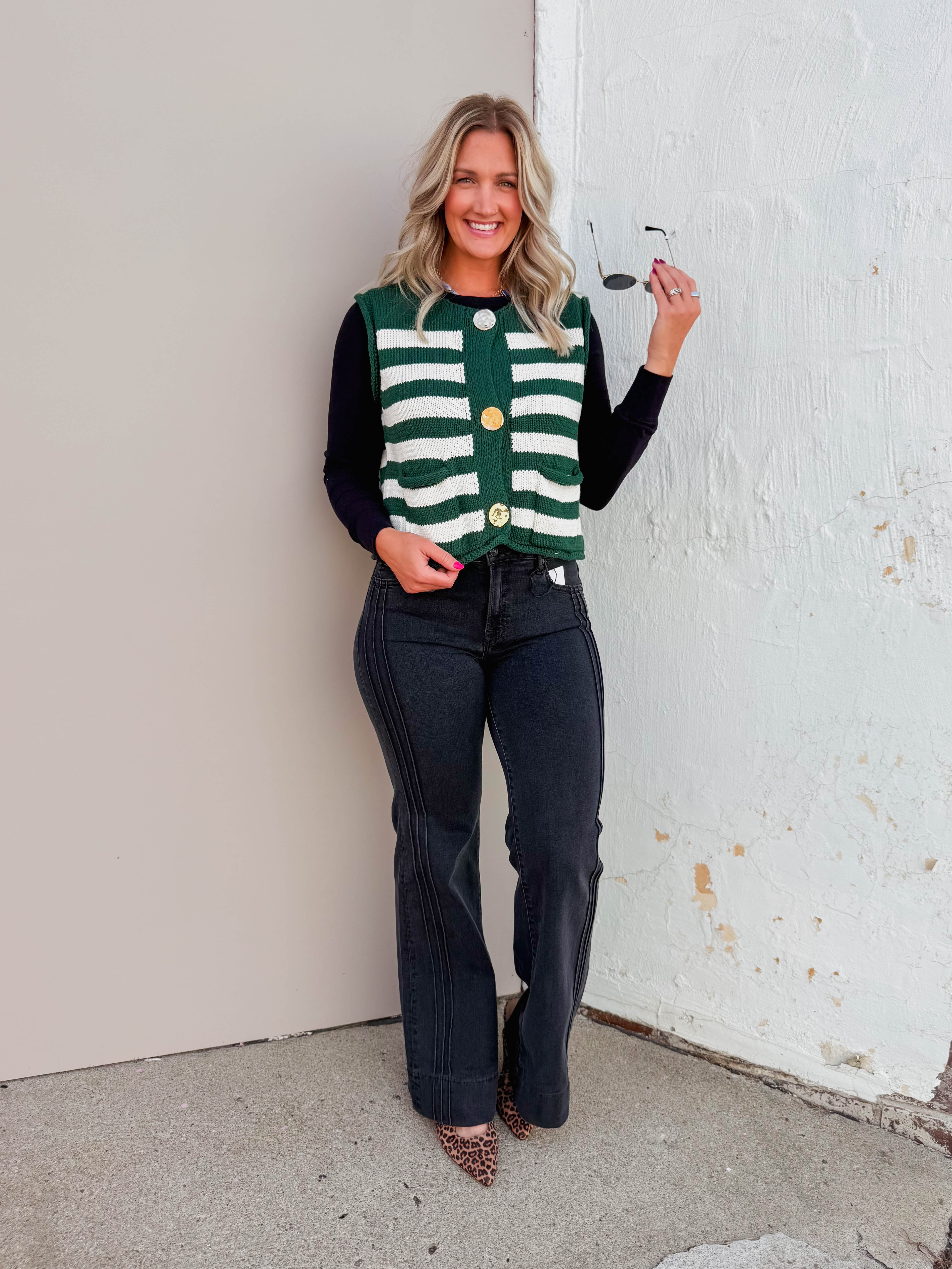 The Piper Striped Sweater Vest adds a fun twist to any outfit with its bold stripe pattern and oversized gold buttons. Featuring a comfy cropped fit, round neck, and handy front pockets, it’s perfect for layering from work to weekend. Slip it on and instantly elevate your style with a playful edge.