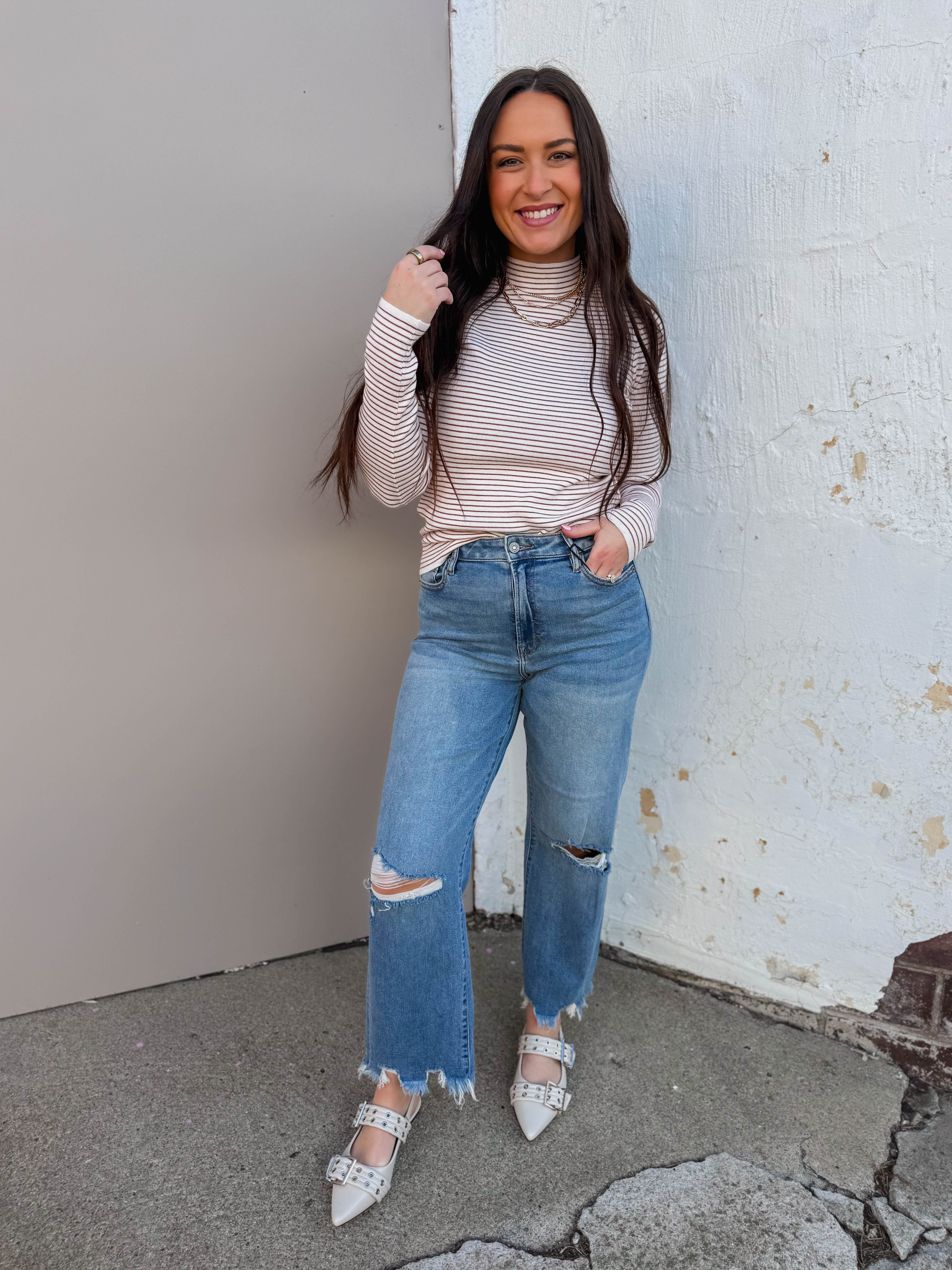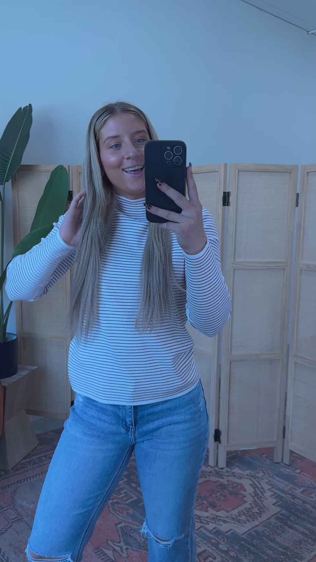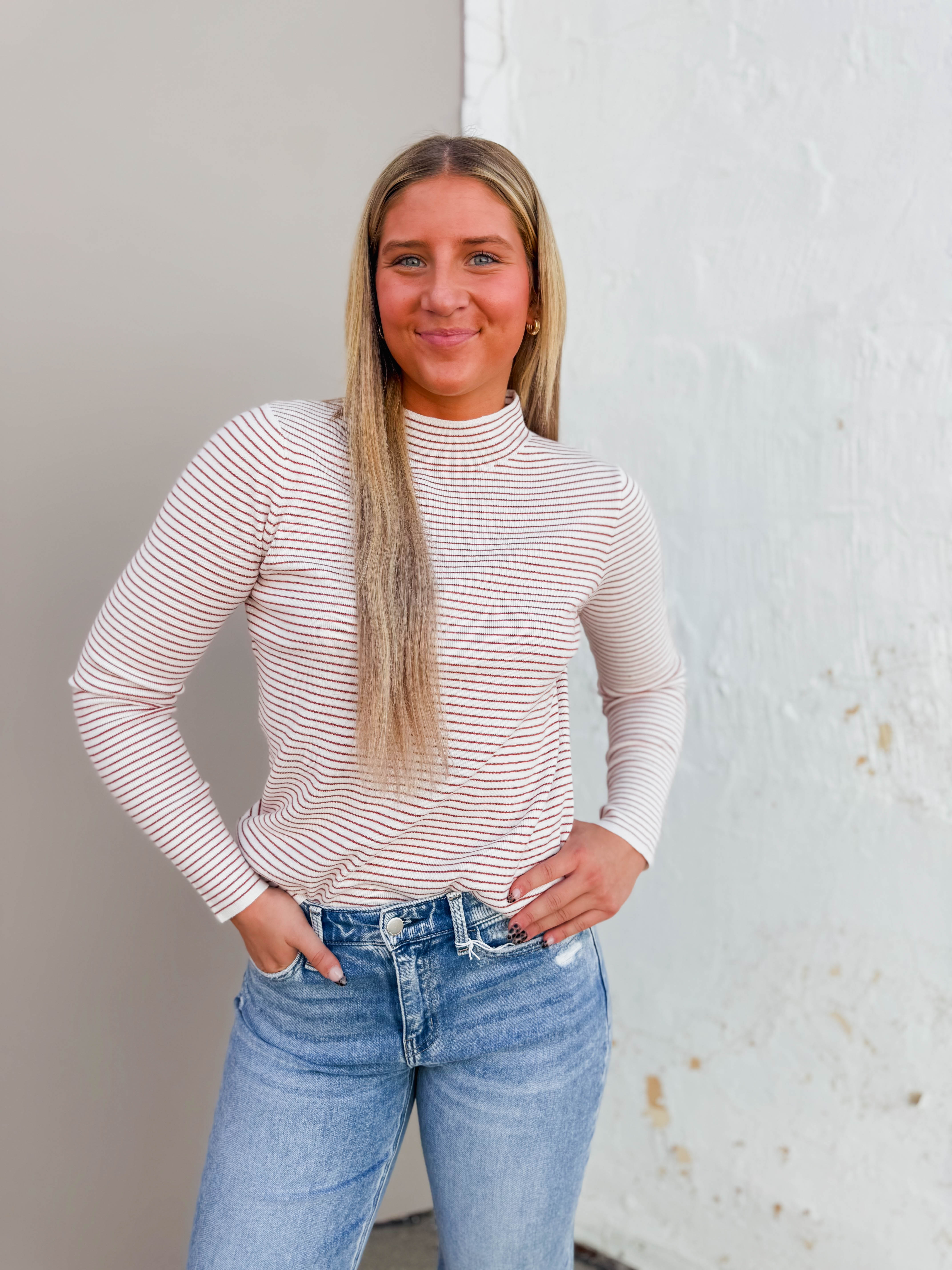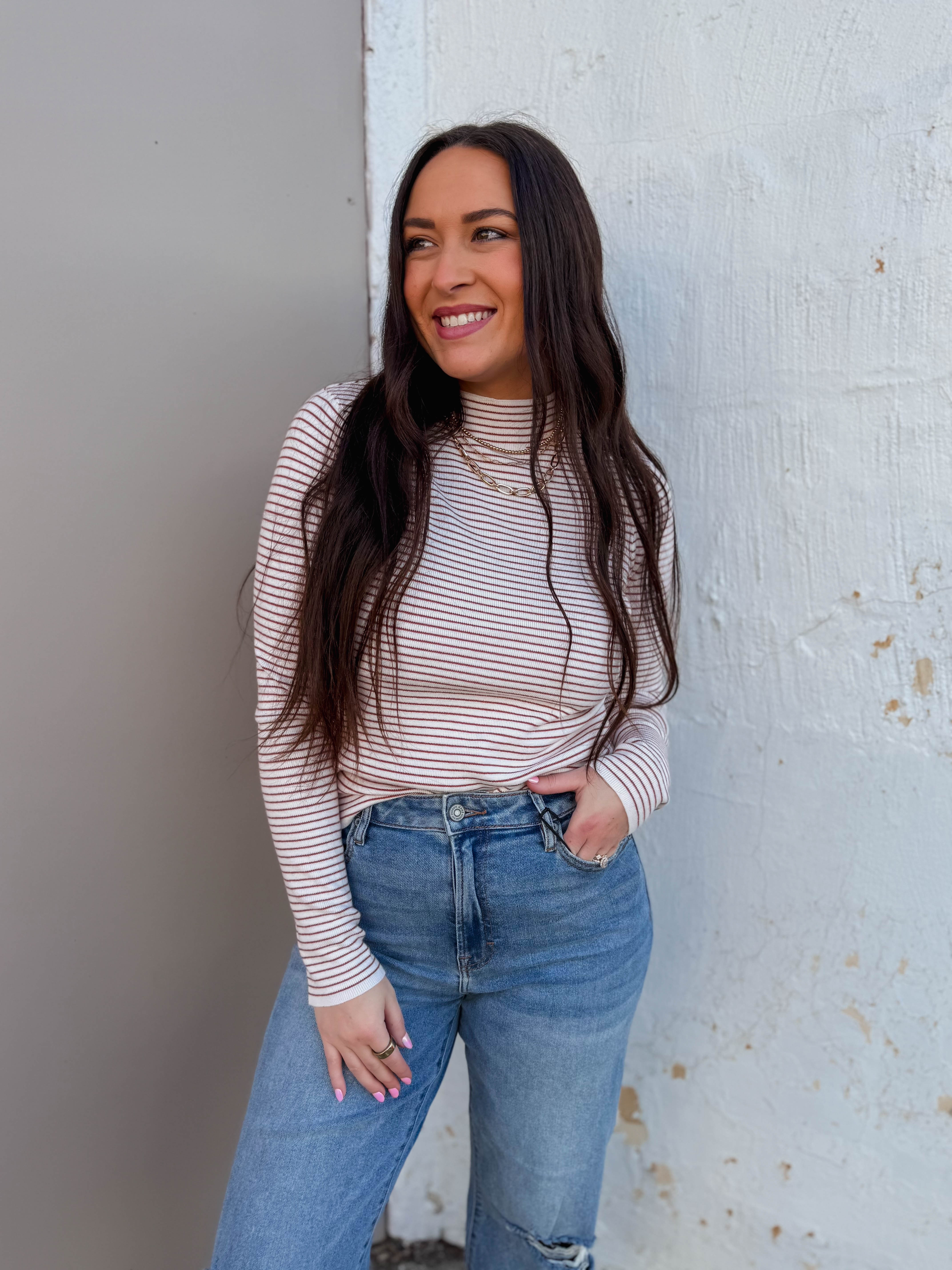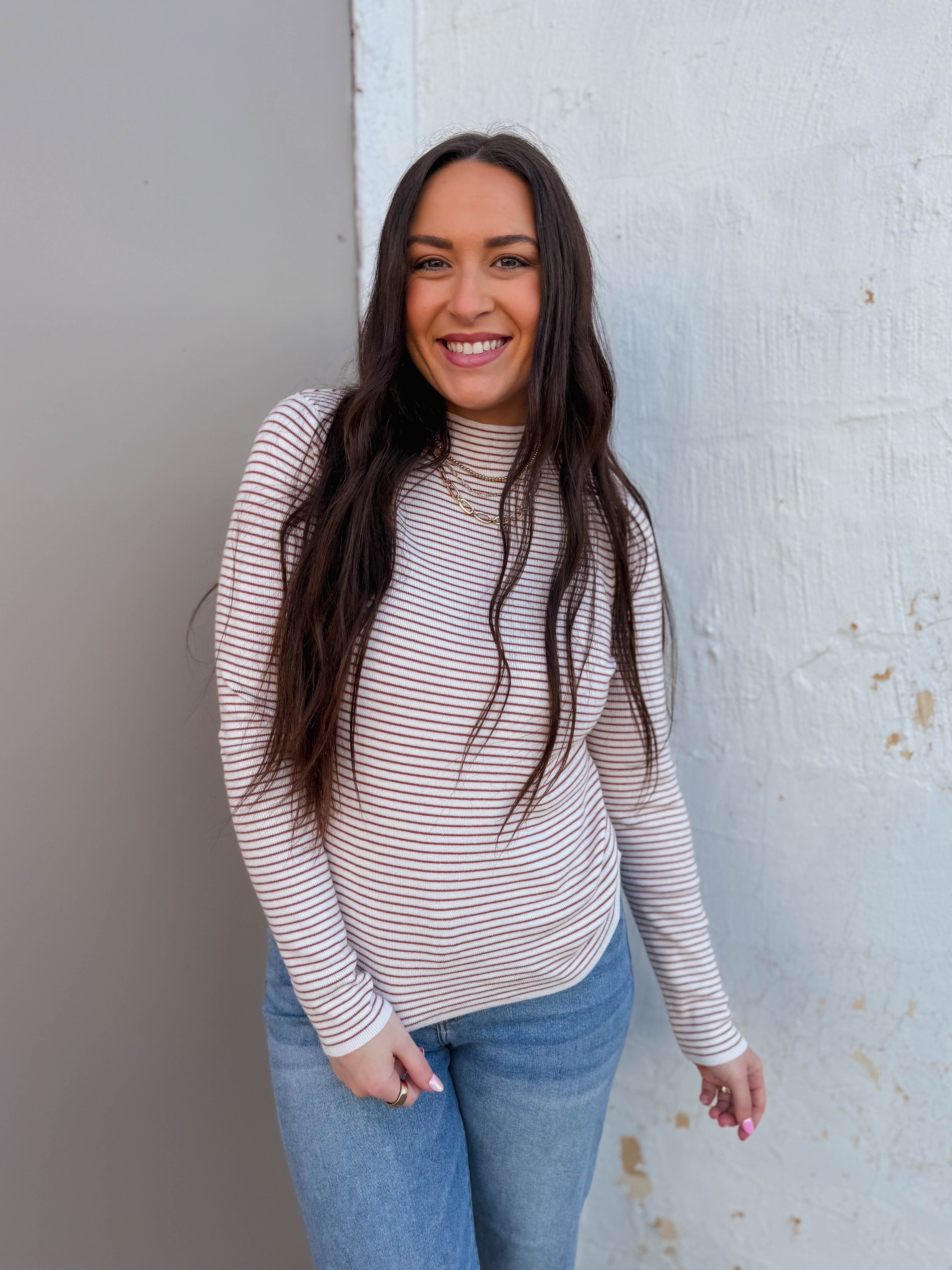 Snuggle into the Talia Striped Sweater—your stylish sidekick for workdays and weekends. Featuring a trendy mock neck, sleek pinstripes, and cozy long sleeves, it’s easy to wear and hard to forget.