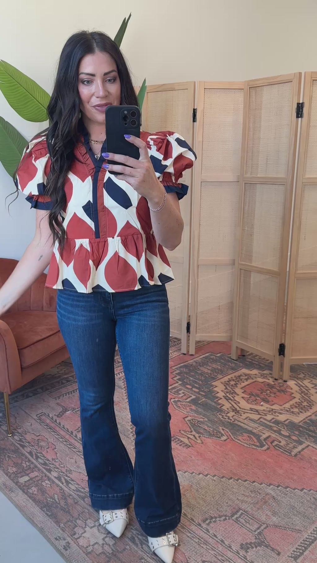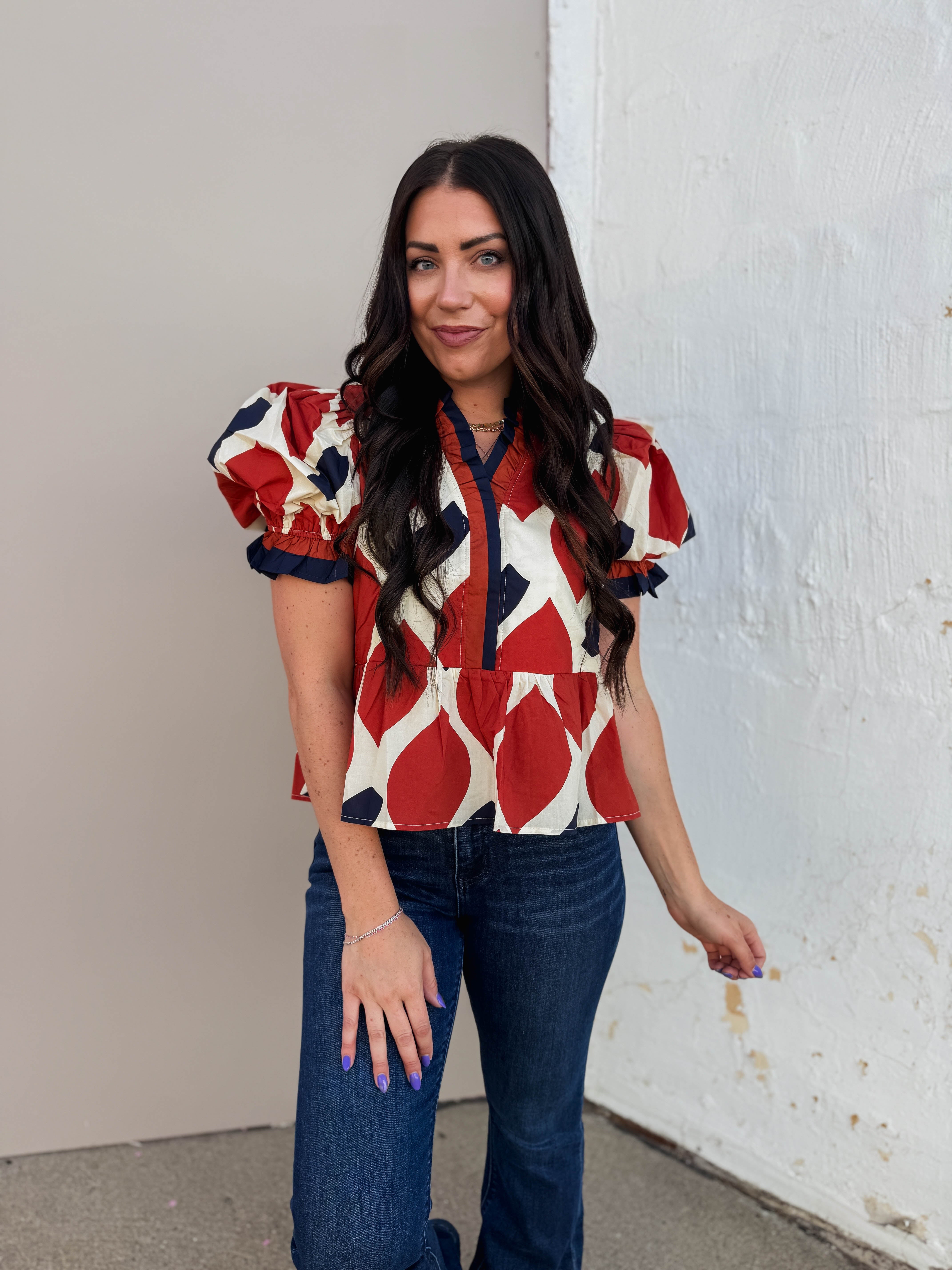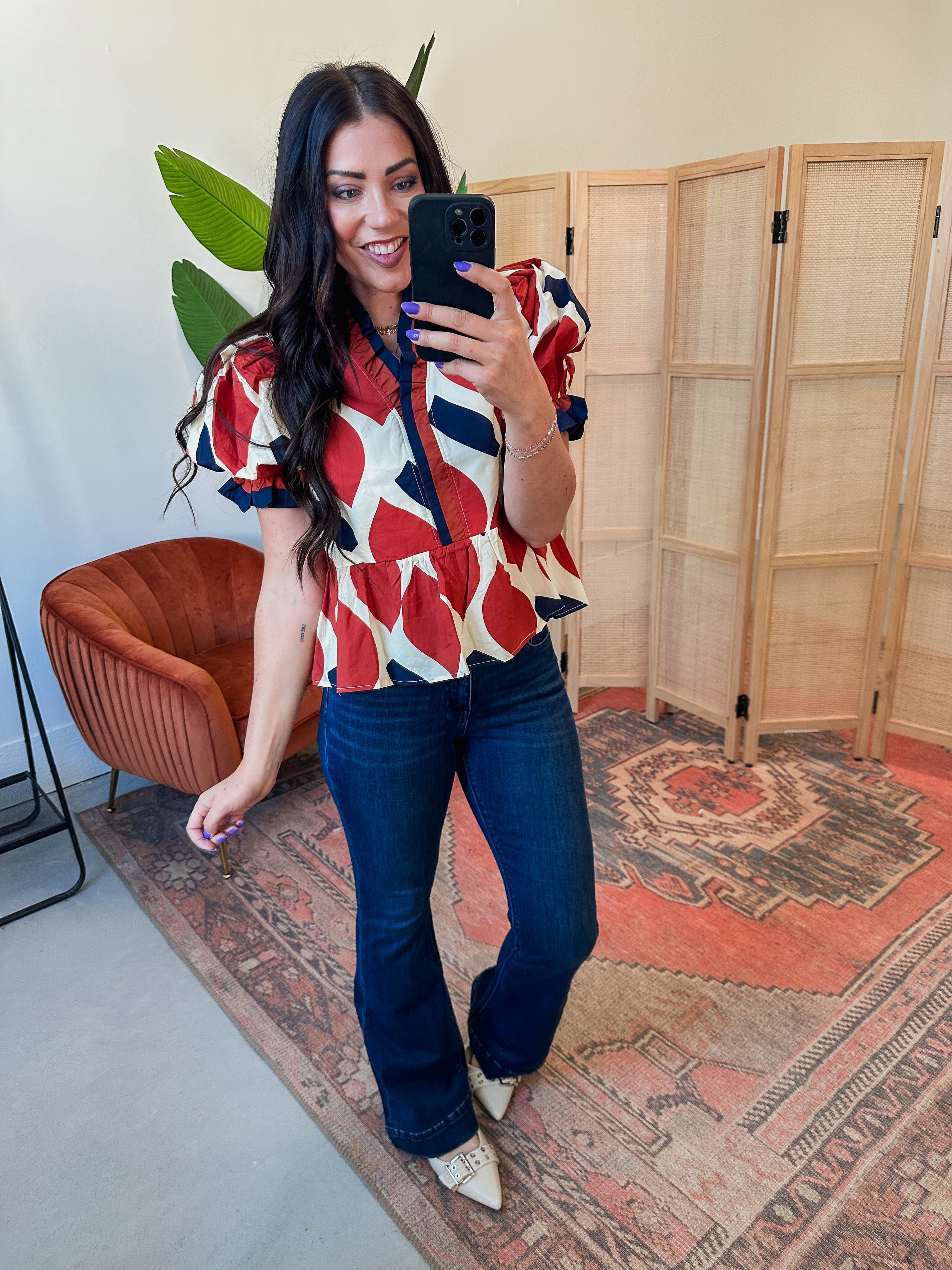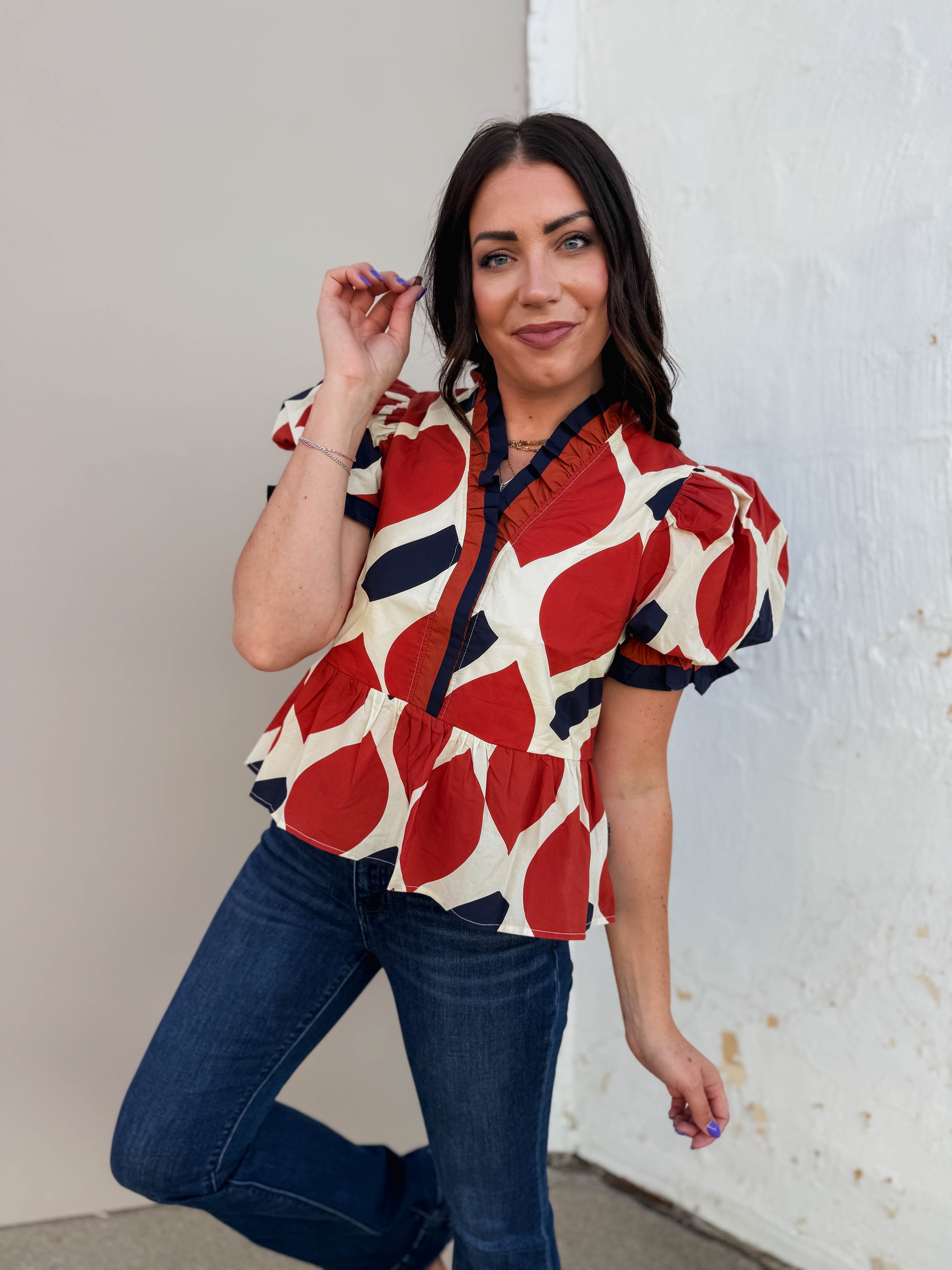 The Theodora Top blends playful style with effortless charm. Featuring a flattering V-neckline and short puff sleeves, its abstract print and peplum silhouette add fun flair. The contrast ruffle trim brings a touch of whimsy, making it perfect to take you from work to weekend with ease.