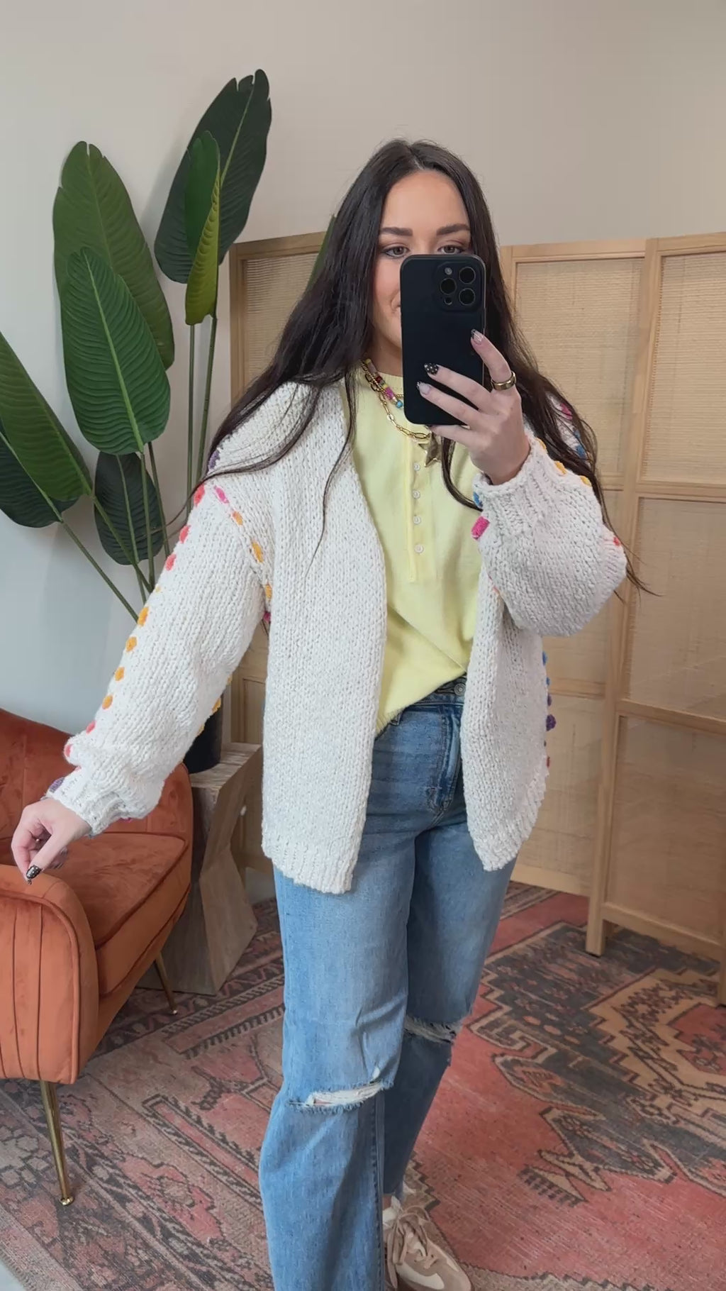 Cozy up in the Liv Cardigan, featuring a chunky knit with fun multi-color stitching. Its open front and long sleeves make it easy to layer from work to weekend, adding a subtle pop of color to any outfit.