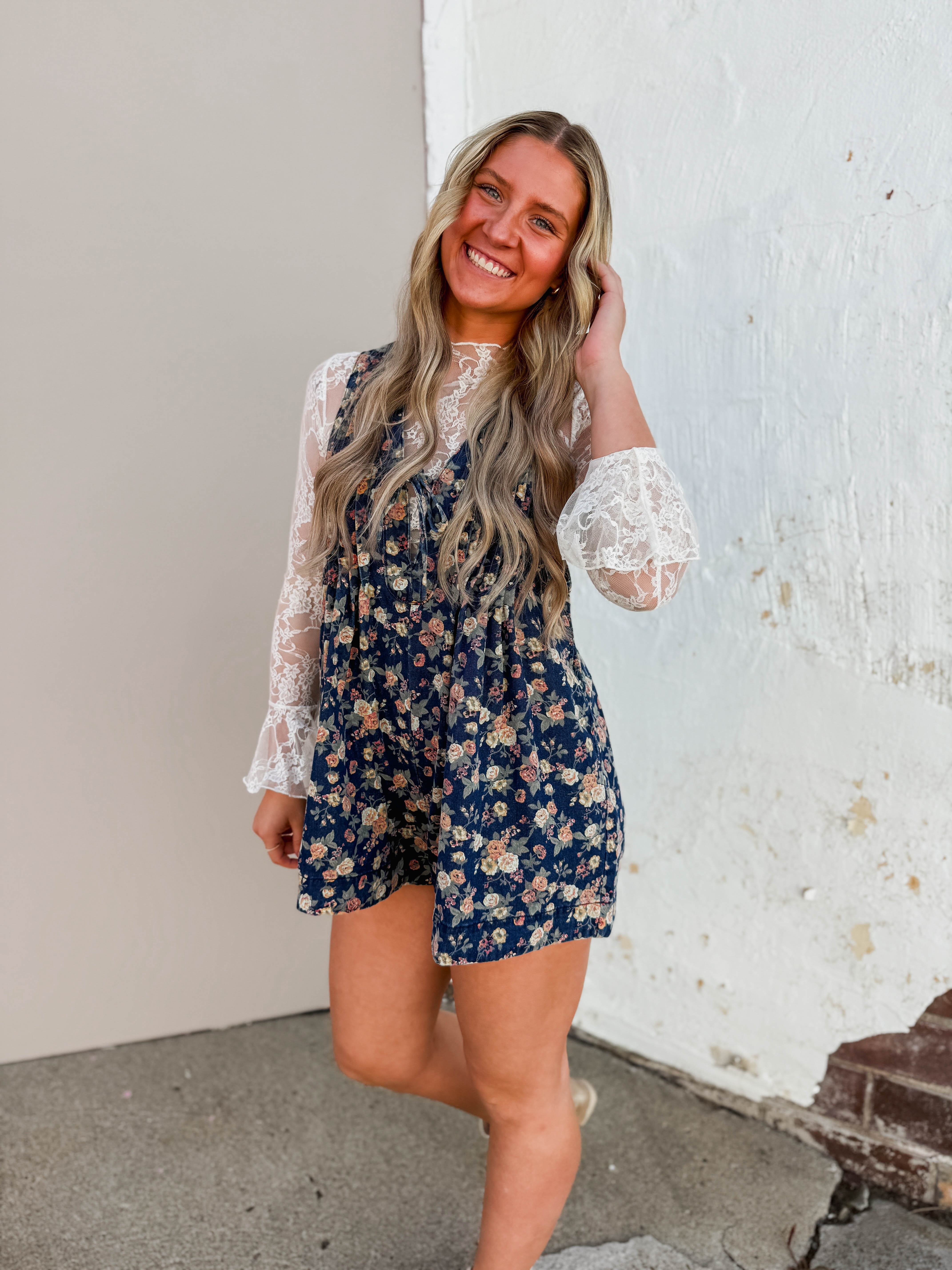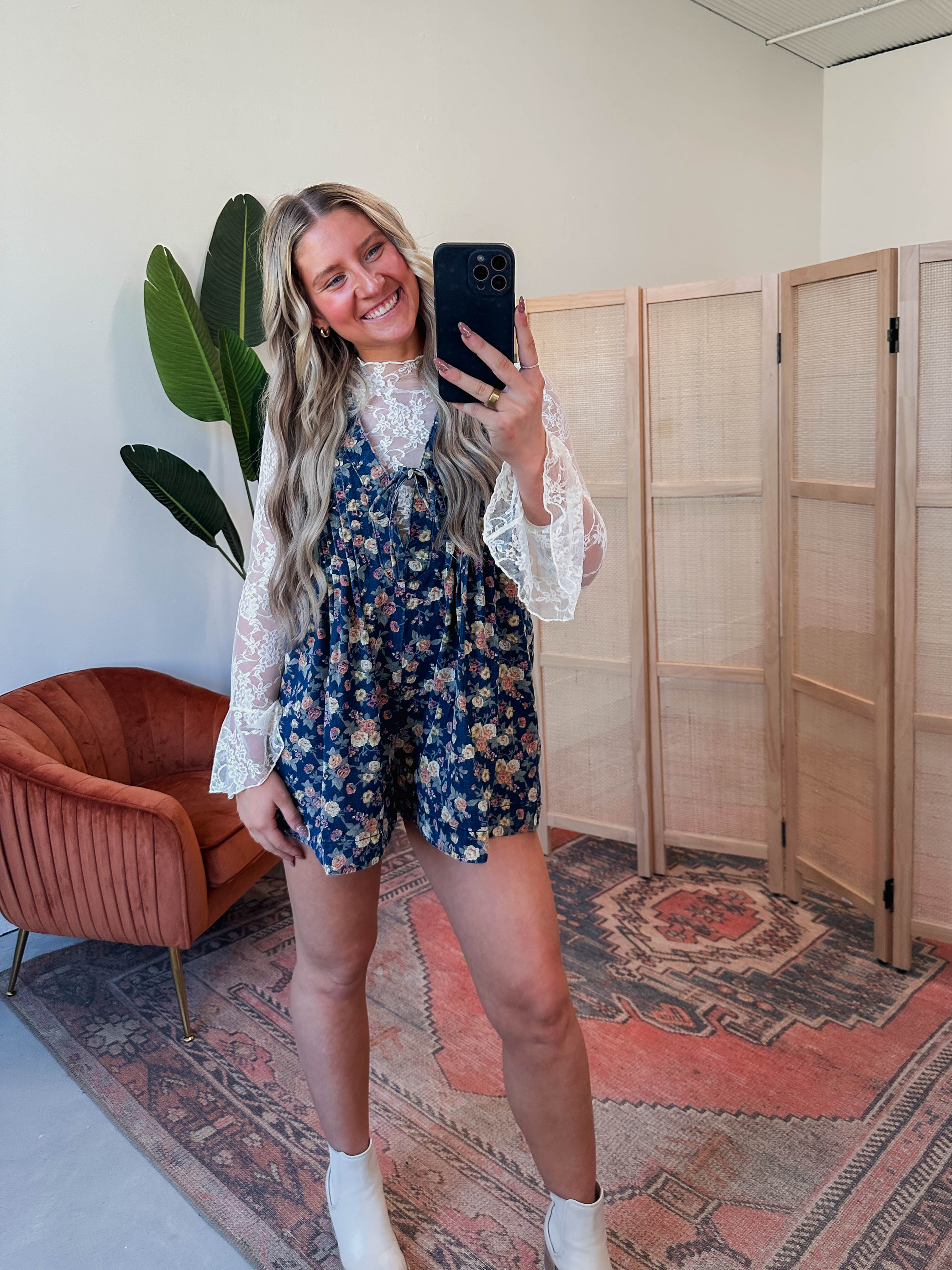 The Celeste Floral Denim Romper blends playful floral prints with comfy denim. Featuring a deep V-neck, string tie detail, and pleated accents, it’s sleeveless with handy side pockets. Perfect for a cute year-round look!