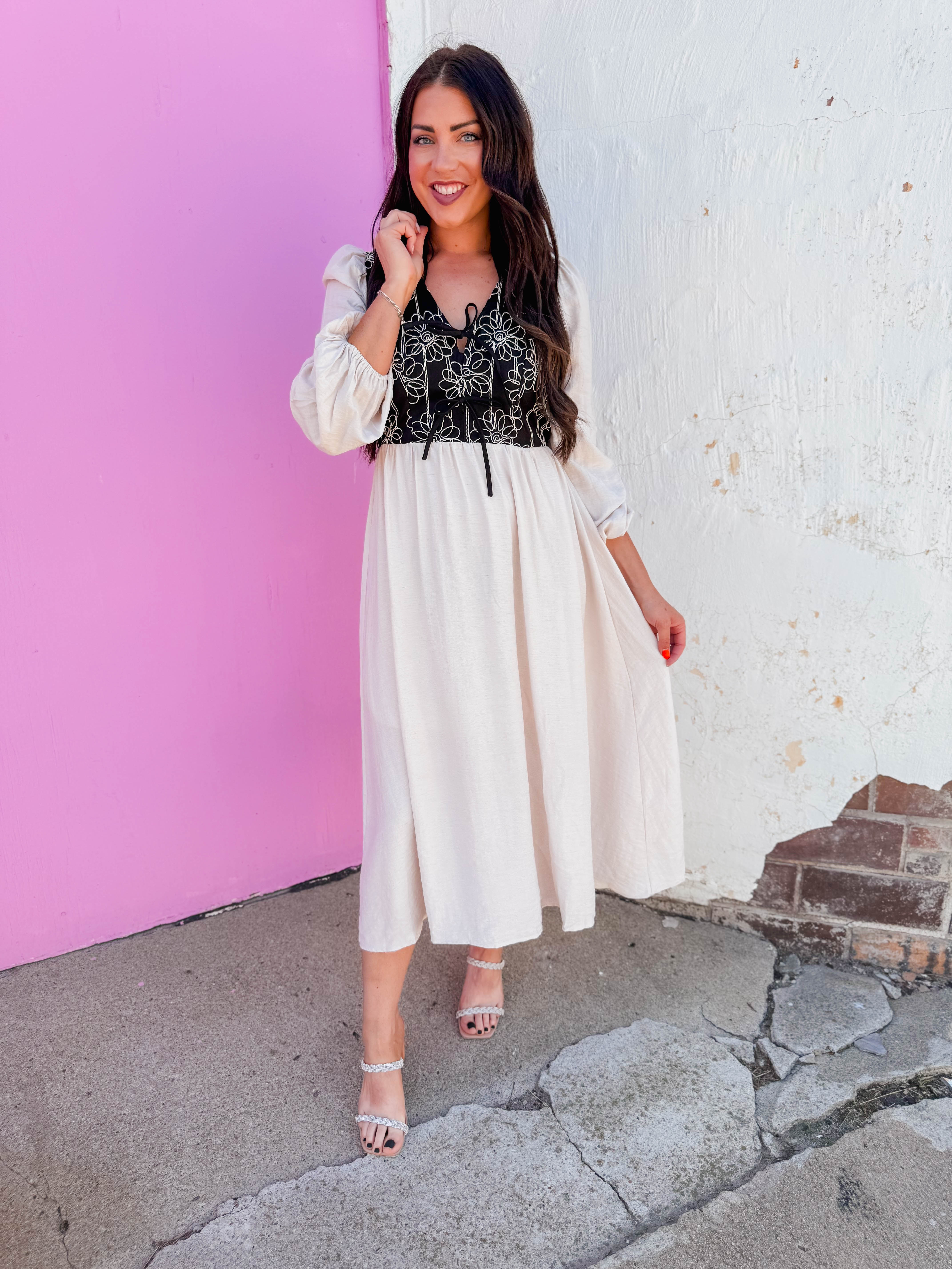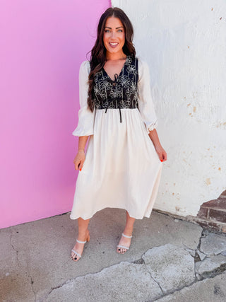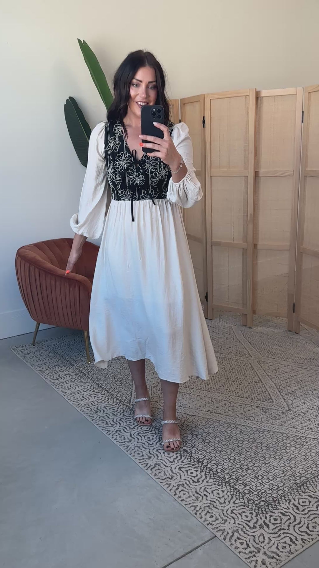 The Colette Midi Dress features a flirty V-neckline and long sleeves perfect for cooler days. Its elastic waistband and front tie detail create a flattering silhouette, while the contrast floral bodice adds a pop of charm. Ideal for fall family photos, this dress blends comfort and style effortlessly.