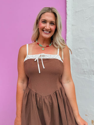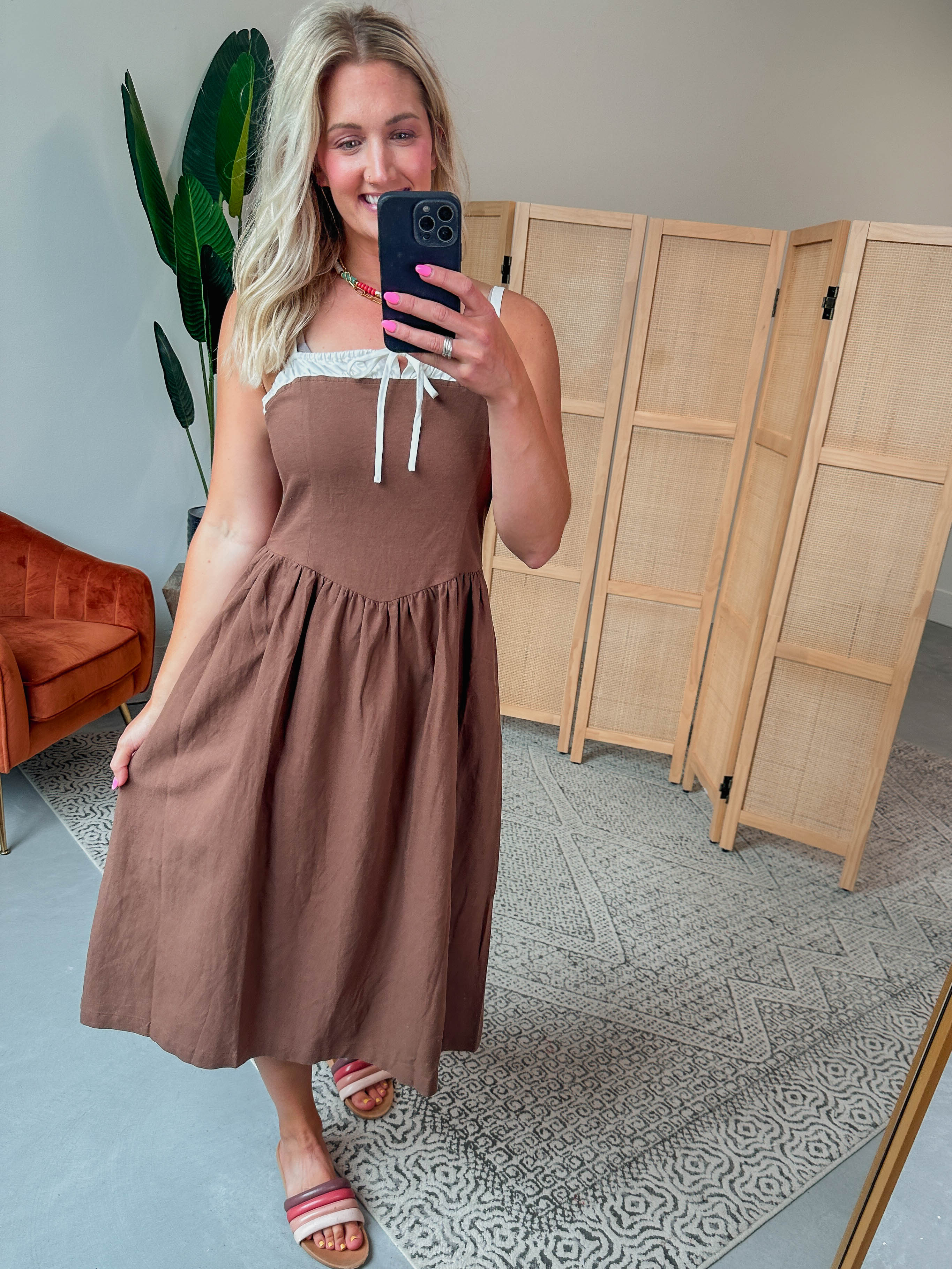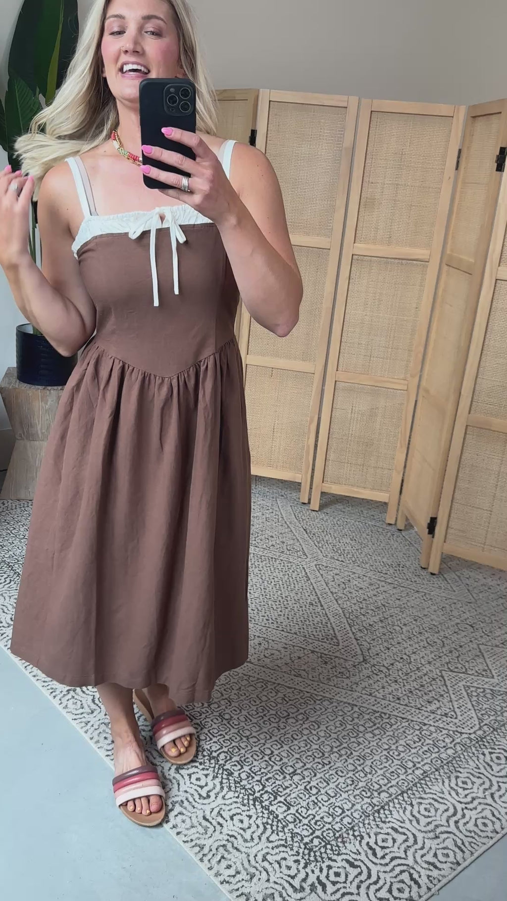 The Ella Midi Dress features a flirty square neckline and sleeveless fit & flare silhouette with adjustable straps for the perfect fit. Its charming contrast detail makes it a playful pick for country concerts, summer outings, or cozy fall family photos.