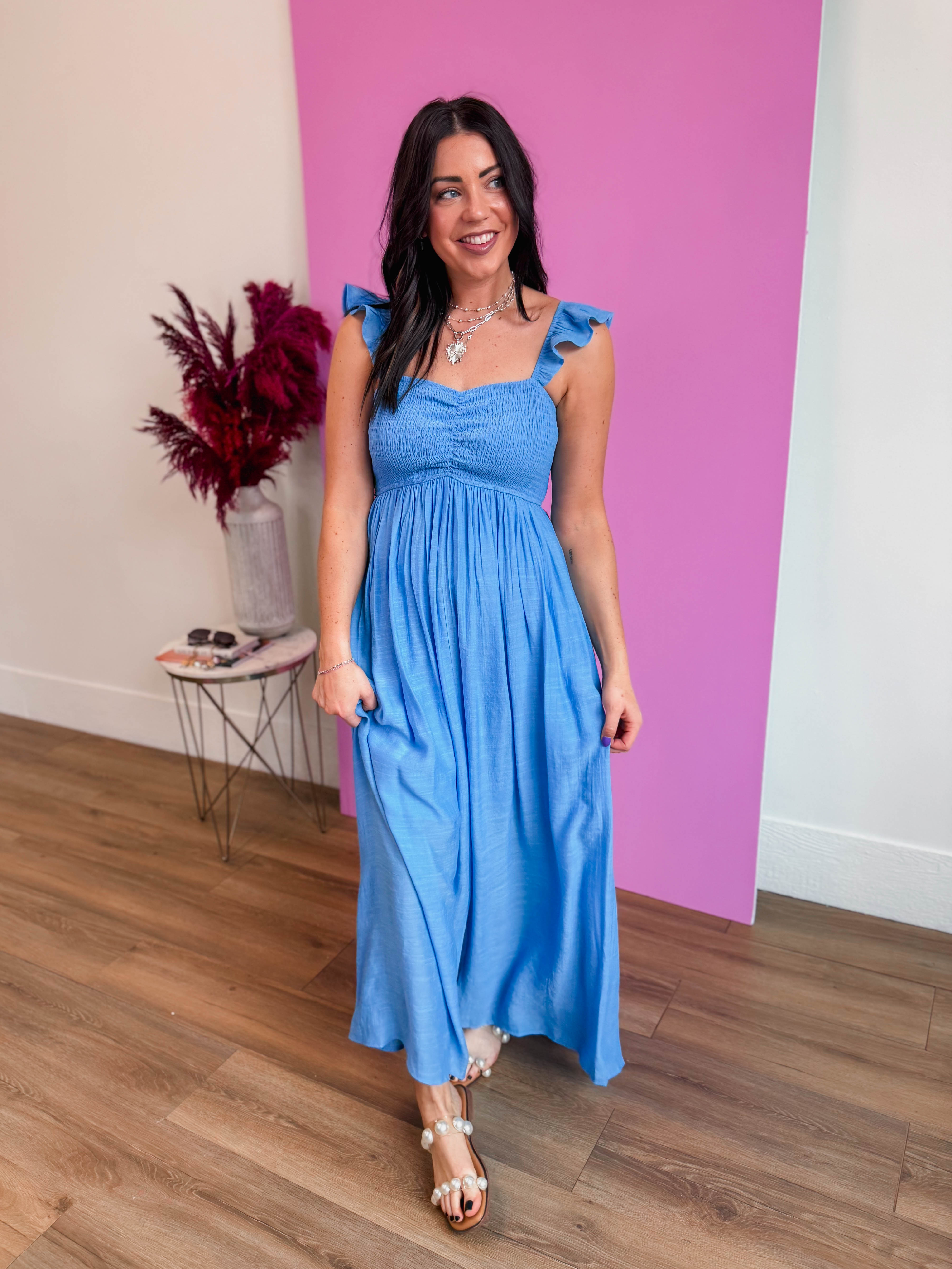 Embrace comfort and style with the Emmie Maxi Dress, designed for all-day wear. The smocked bodice provides gentle support while allowing natural movement, while the flowing skirt creates an effortlessly chic silhouette. Perfect for warm weather adventures, casual gatherings, or laid-back weekends, this dress combines breathable fabric with a flattering fit. Whether you're on vacation, headed to church or attending a wedding, this versatile piece adapts to your lifestyle with ease and grace.