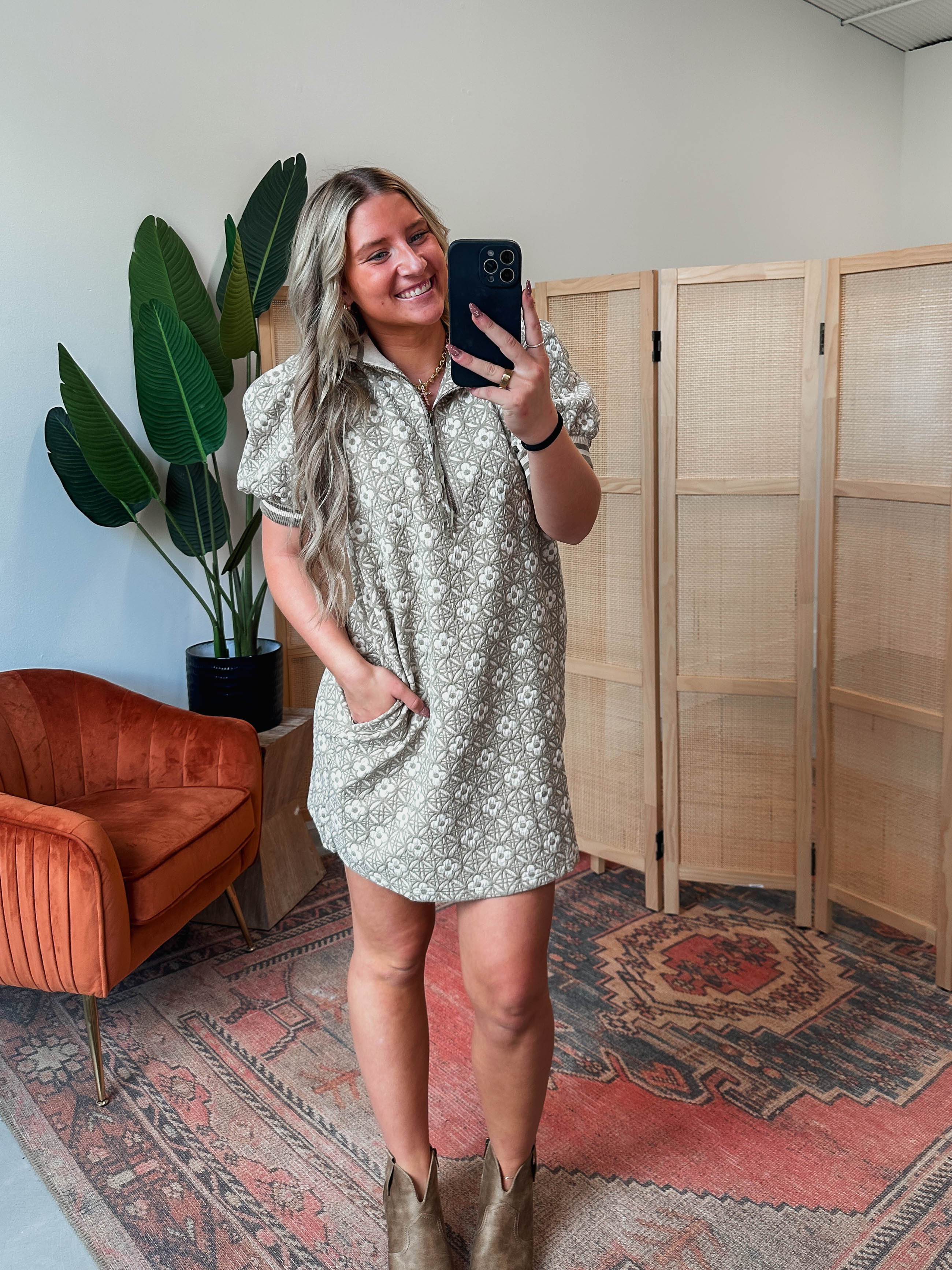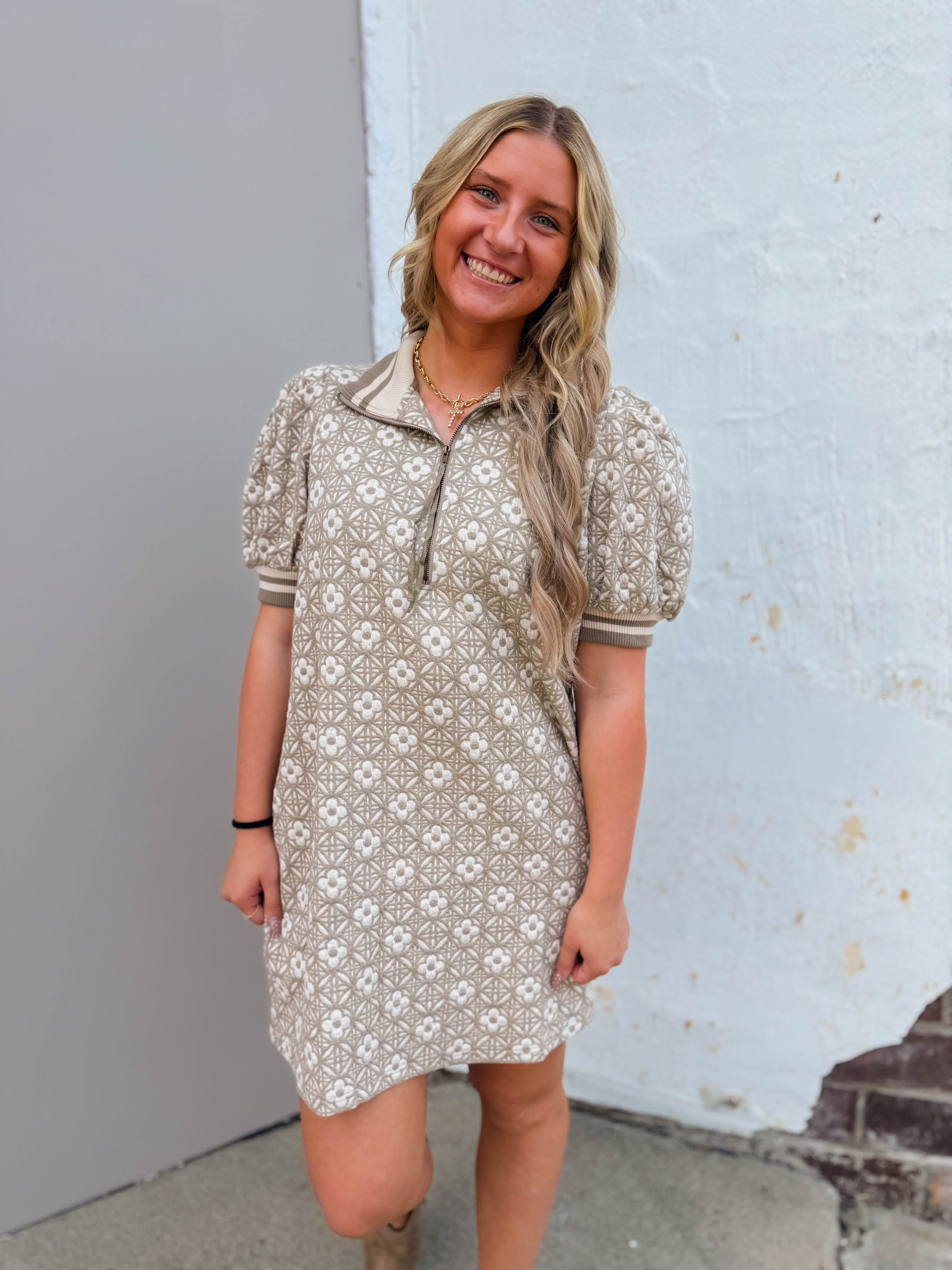 The Madeline Floral Mini Dress brings playful charm with its textured floral pattern and cute short puff sleeves. Featuring a half zip front, ribbed collar and cuffs, plus handy side pockets, it’s the perfect flirty pick for fall adventures.