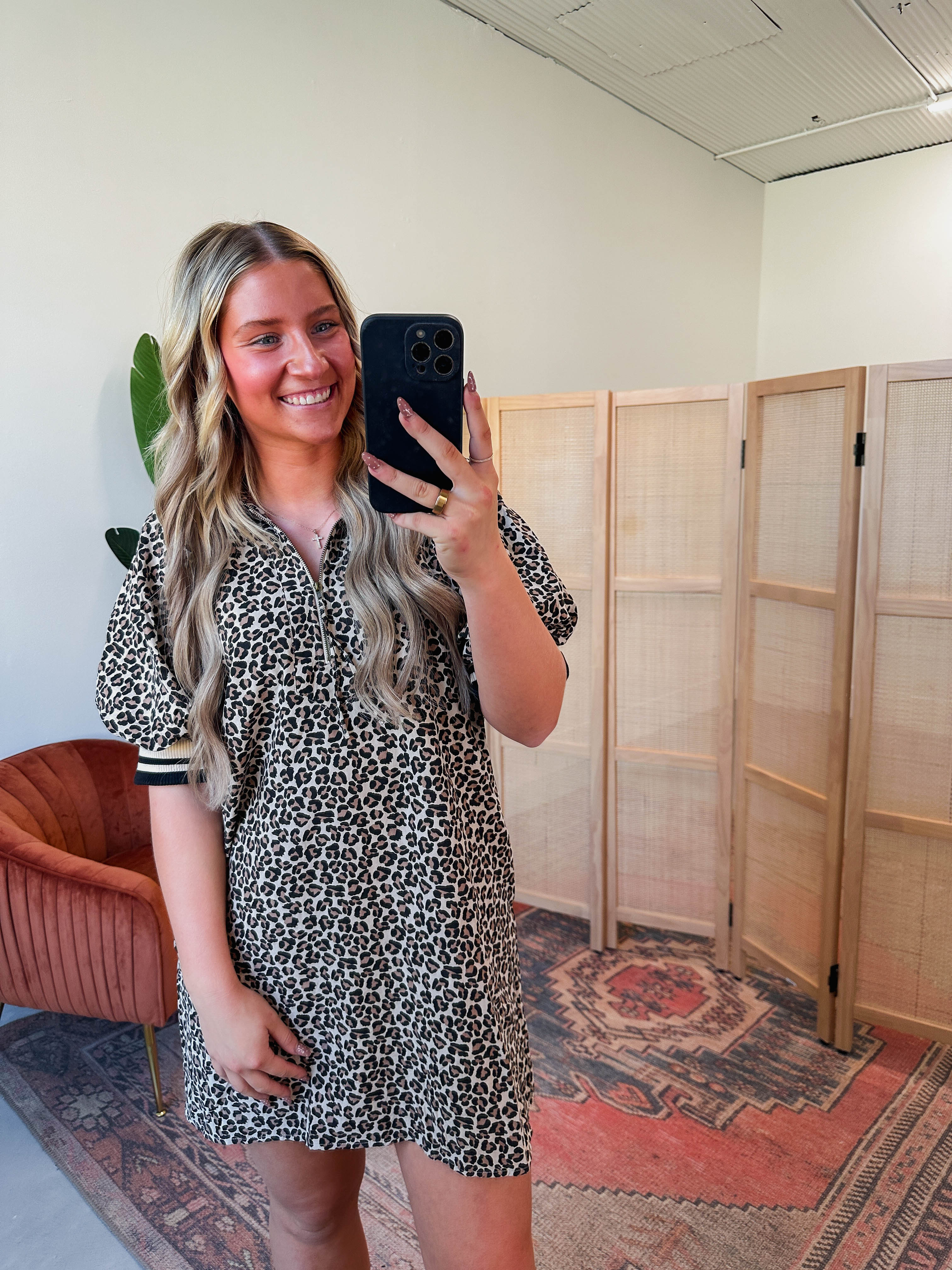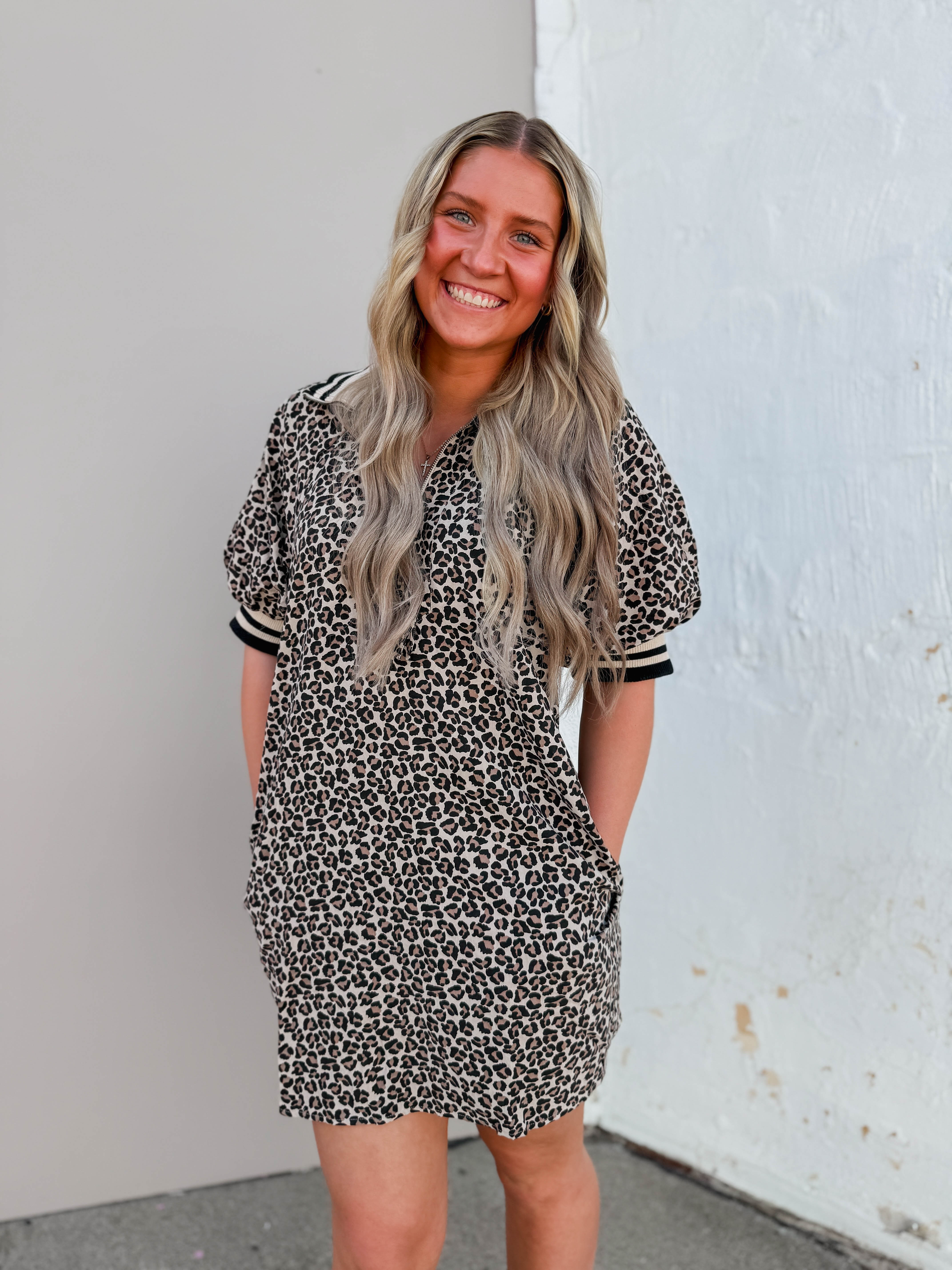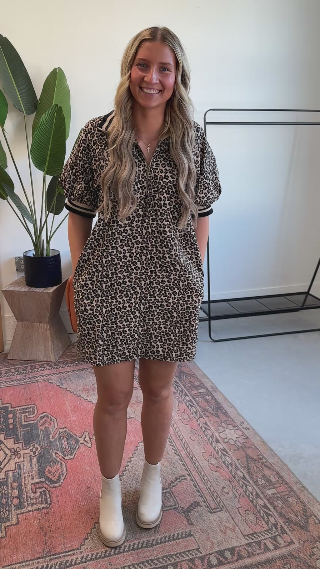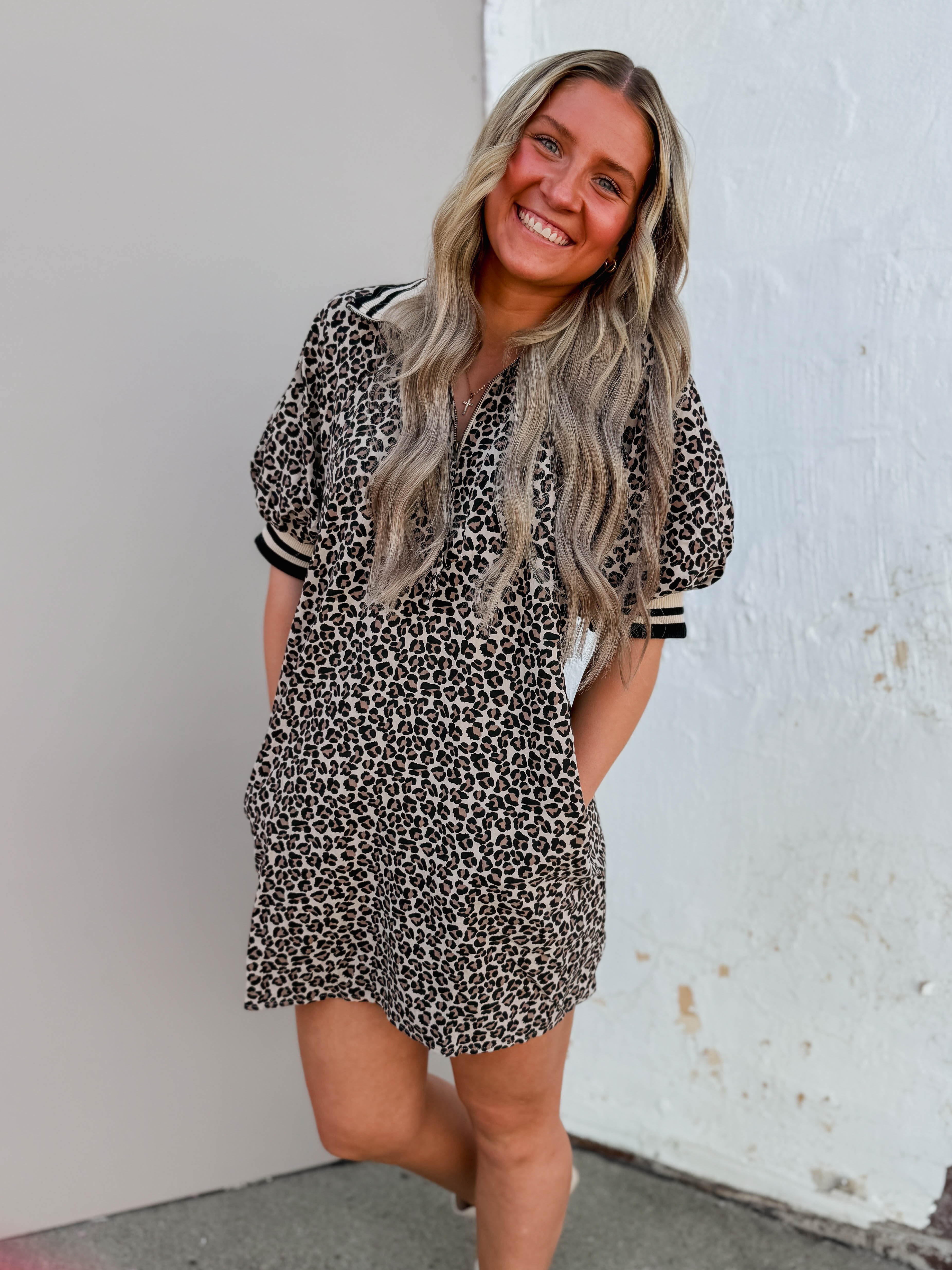 Turn heads in the Masie Leopard Mini Dress! Featuring bold leopard print, playful short raglan puff sleeves, and sporty striped ribbed cuffs and collar, this dress combines fun and flair. The zip-up neckline adds easy style, while side pockets keep essentials close. Perfectly cute for any season!