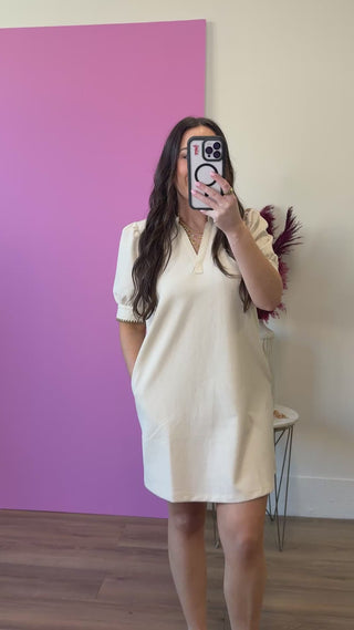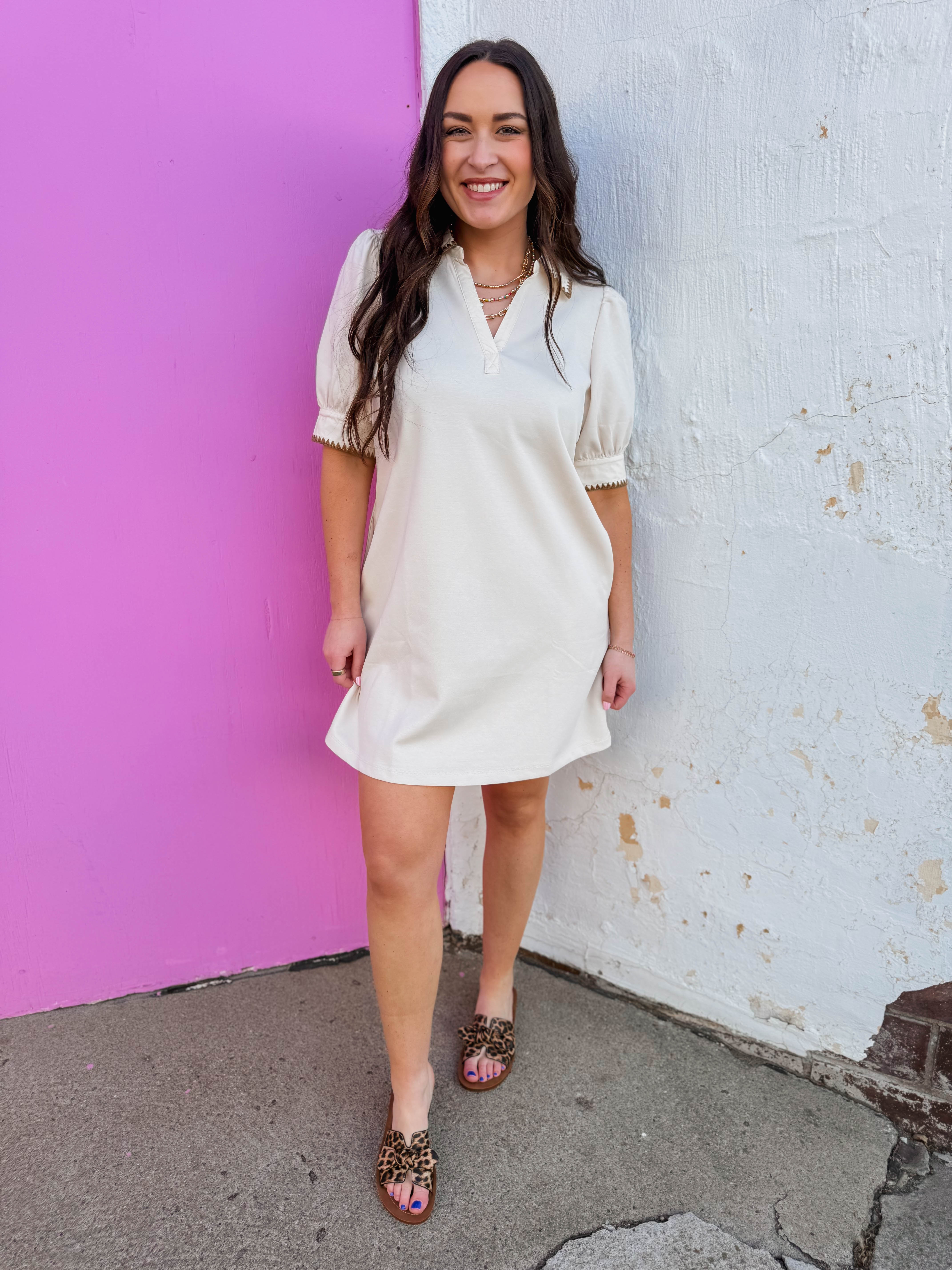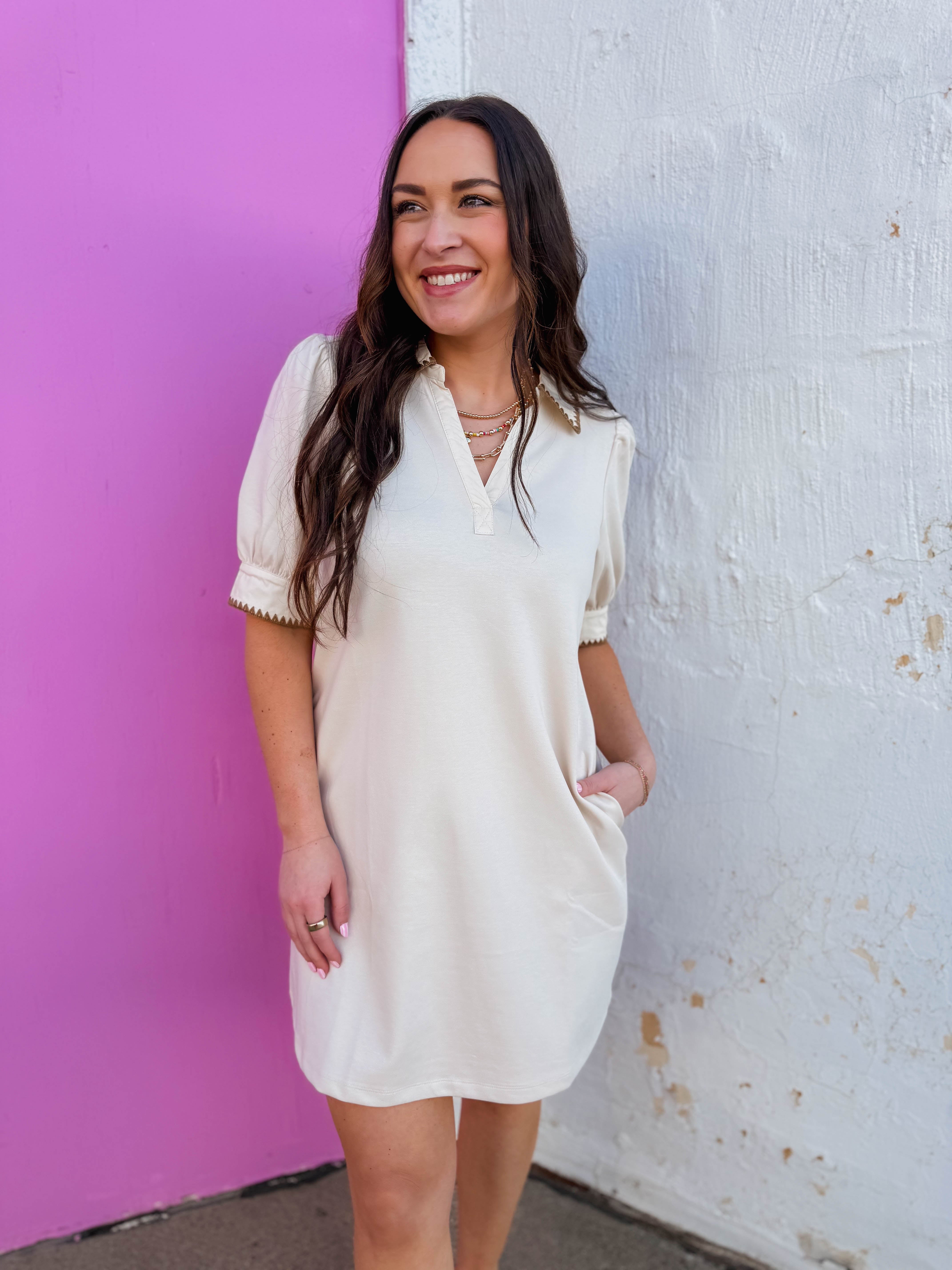 The Meg Mini Dress is your go-to piece for effortless style. Featuring a crisp collared neckline and charming blanket stitched edges, this cute neutral dress works for everything from casual outings to laid-back gatherings. Simple, versatile, and always in season.