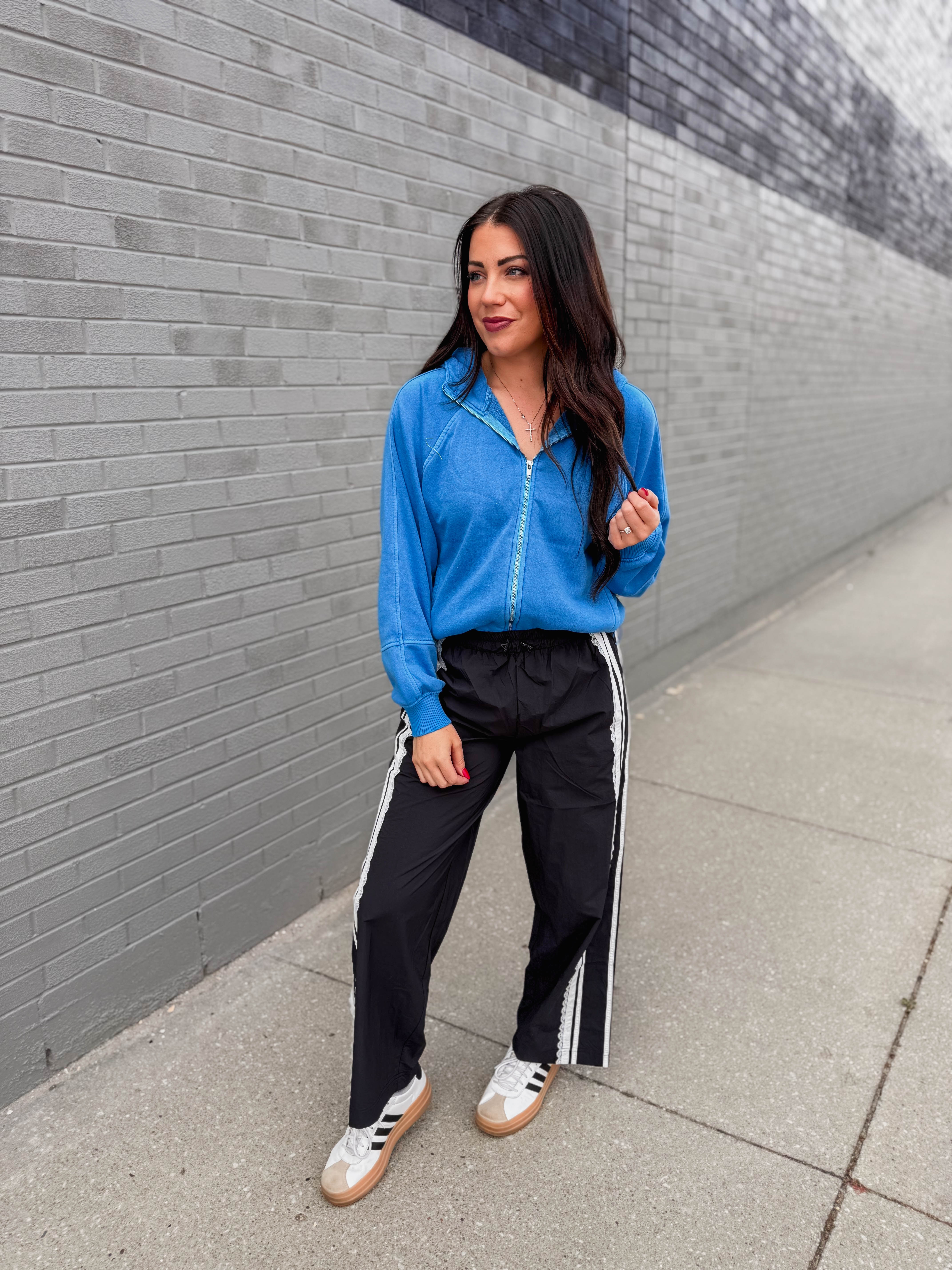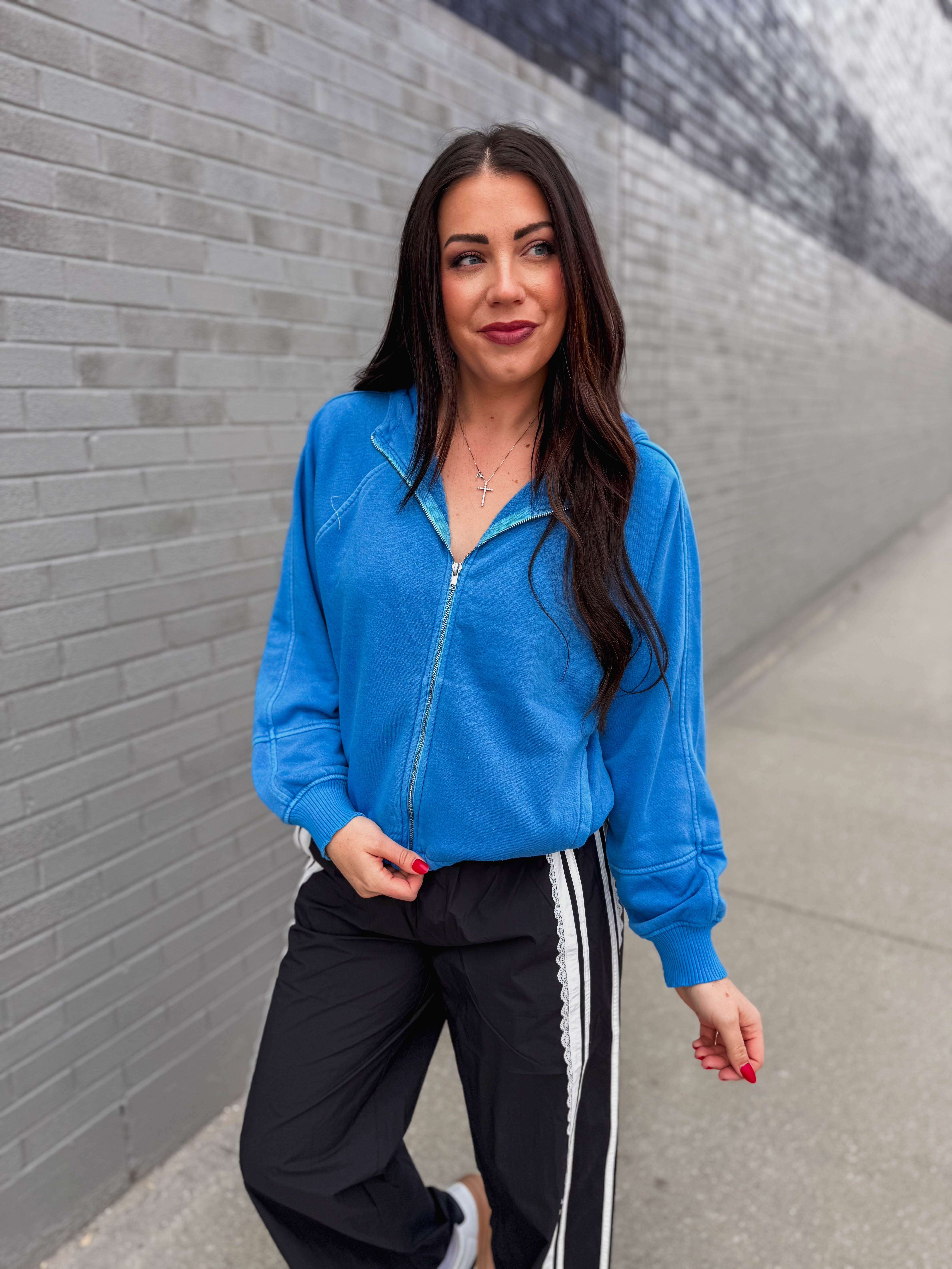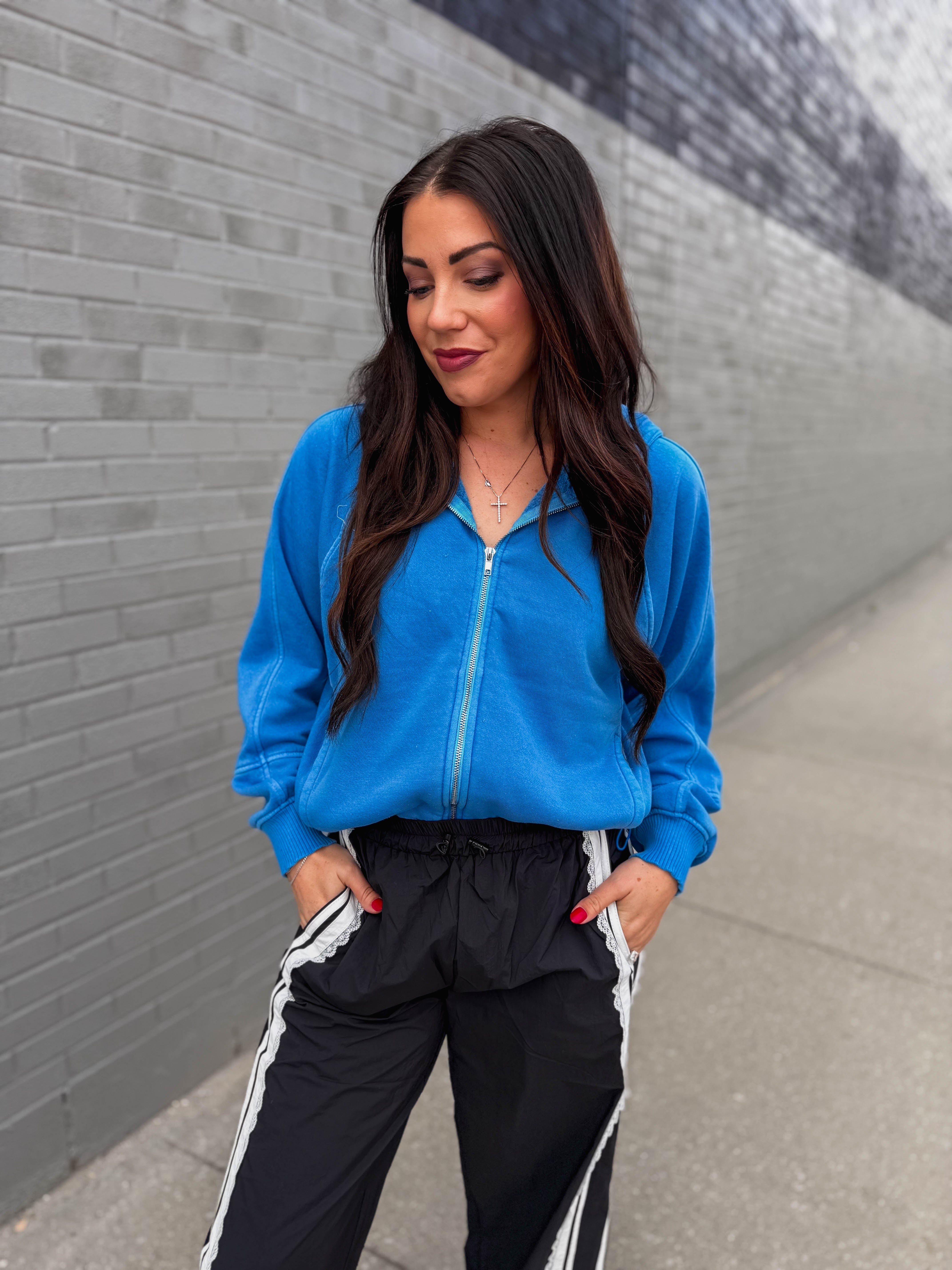 The Reagan Jacket is your new go-to for stylish comfort. With long sleeves, a front zip, and handy side pockets, it’s perfect for busy days. The drawstring waist adds a fun pop of color and a snug fit—great for on the go!