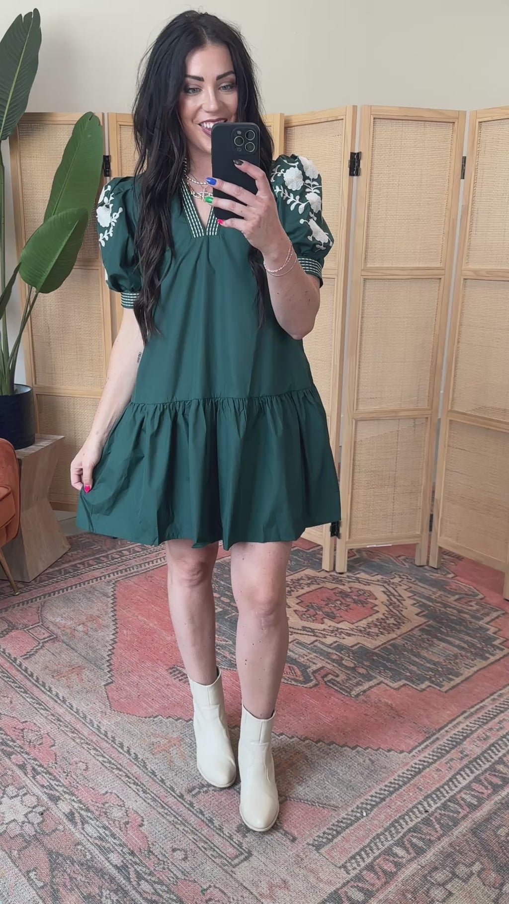 The Waverly Mini Dress is your go-to for fall fun. Featuring a flattering V-neckline, short puff sleeves, and charming floral embroidery, it’s playful and stylish. The striped trim adds a cute contrast, while handy side pockets keep essentials close. Perfect for chilly days when you want to look effortlessly adorable.