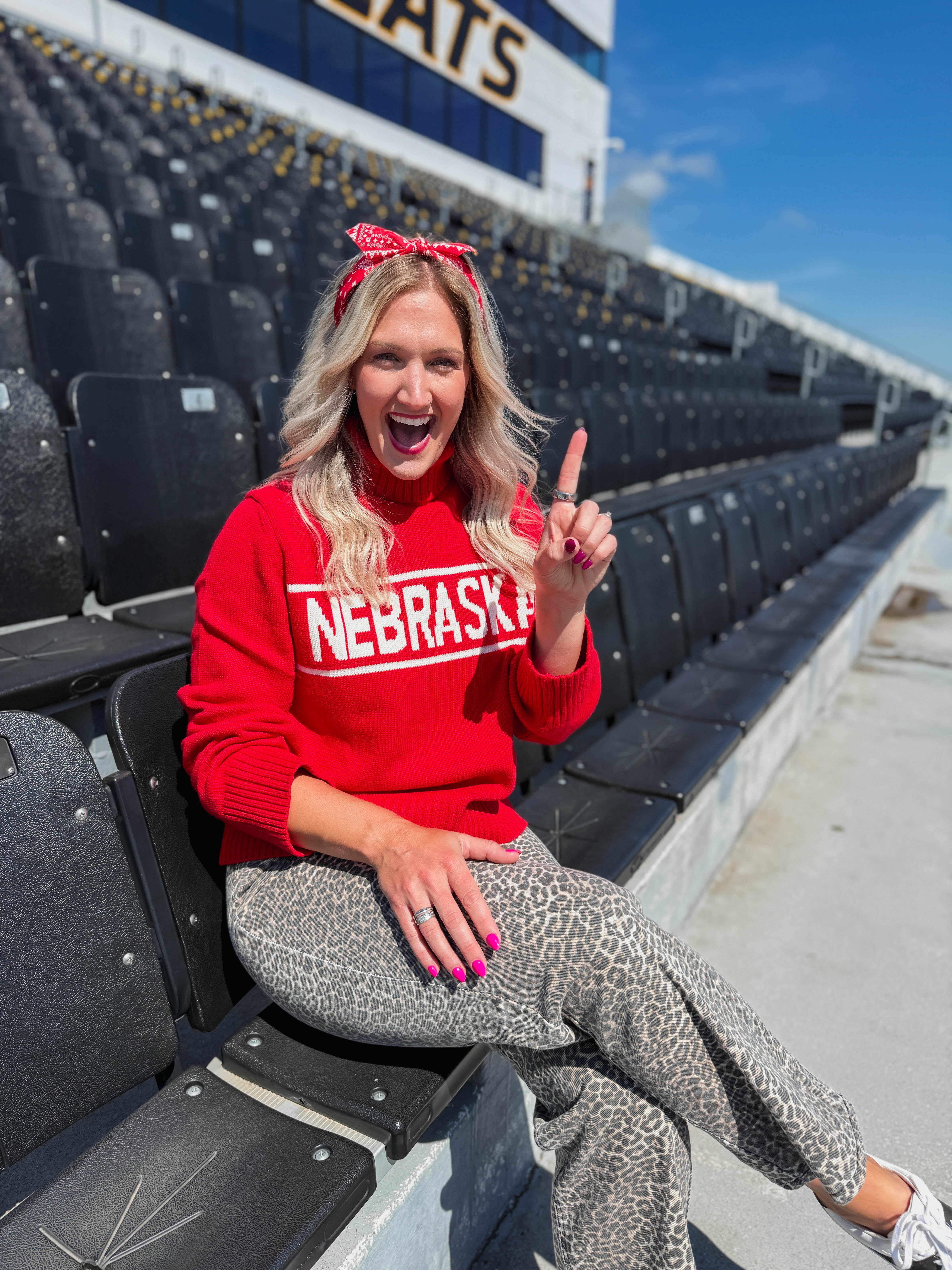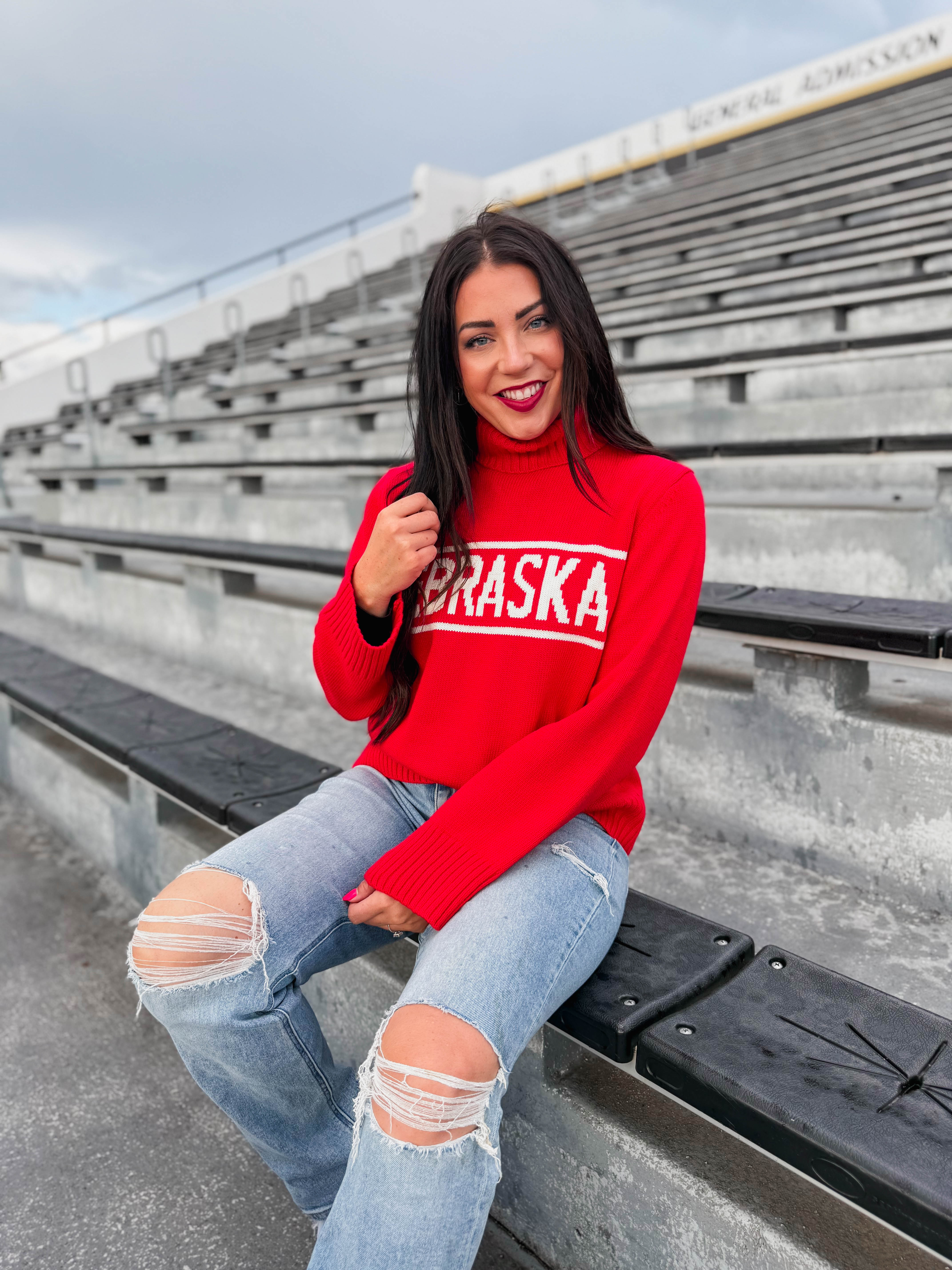 Stay cozy and show your team spirit with the Nebraska Railway Turtleneck Sweater. Featuring a bold Nebraska graphic, long sleeves, and chunky ribbed hems, this turtleneck is perfect for game day vibes. Comfortable and cute, it’s your go-to for cheering in style.