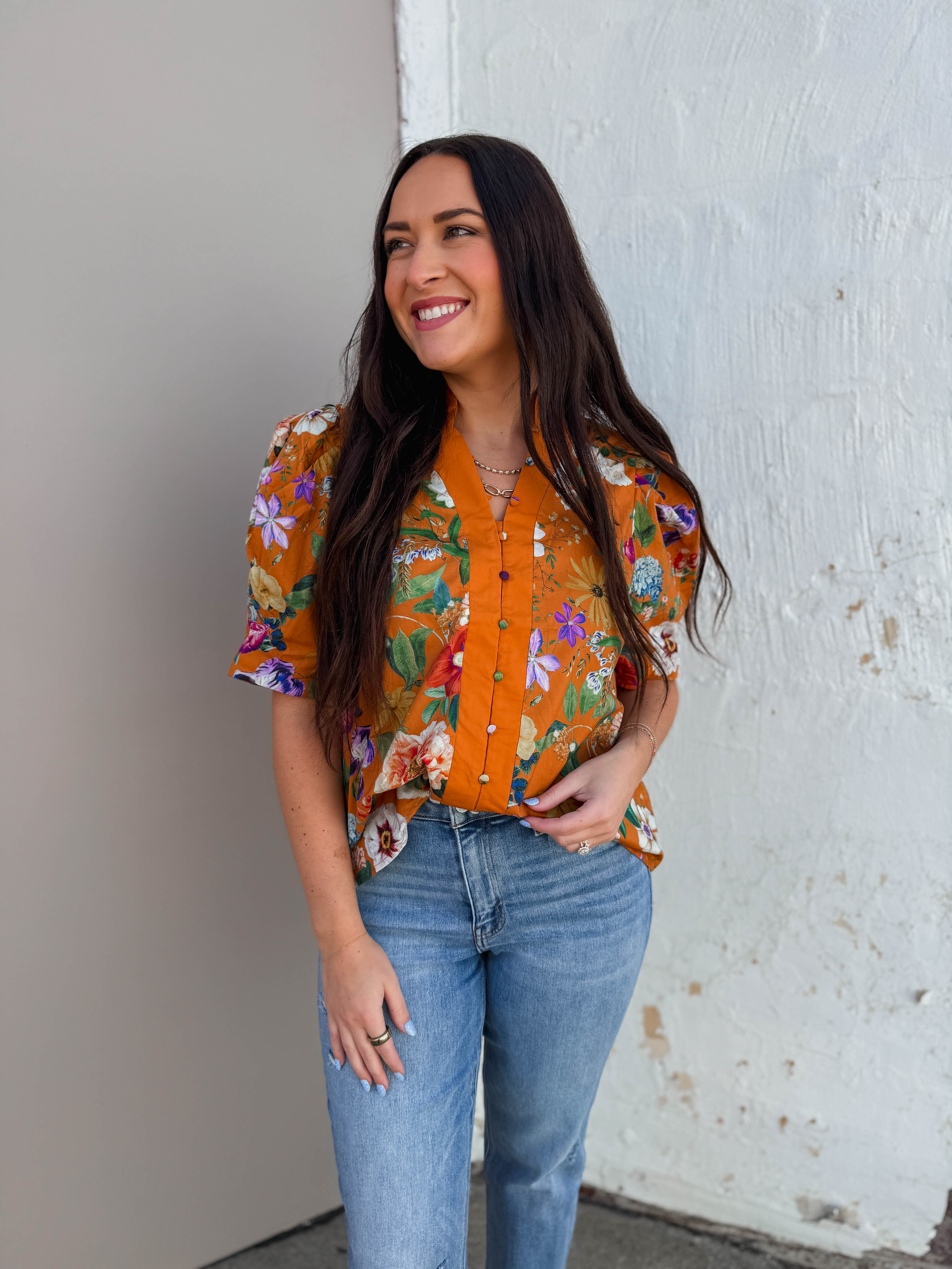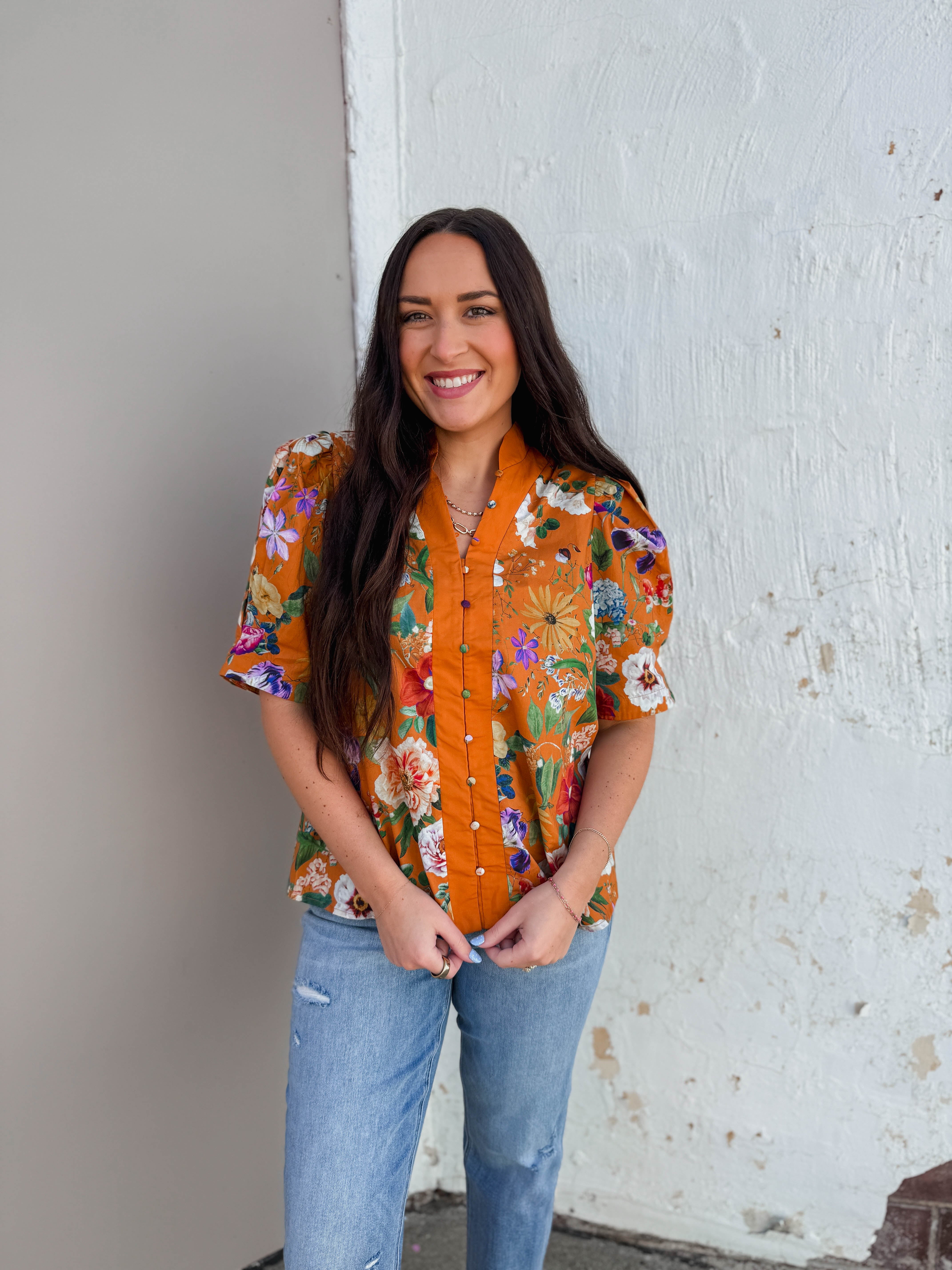 The Amy Floral Top features a charming floral print with short puff sleeves and a contrast button-trimmed band collar. Its front button closure adds a cute touch, making it perfect for effortless style from work to weekend.