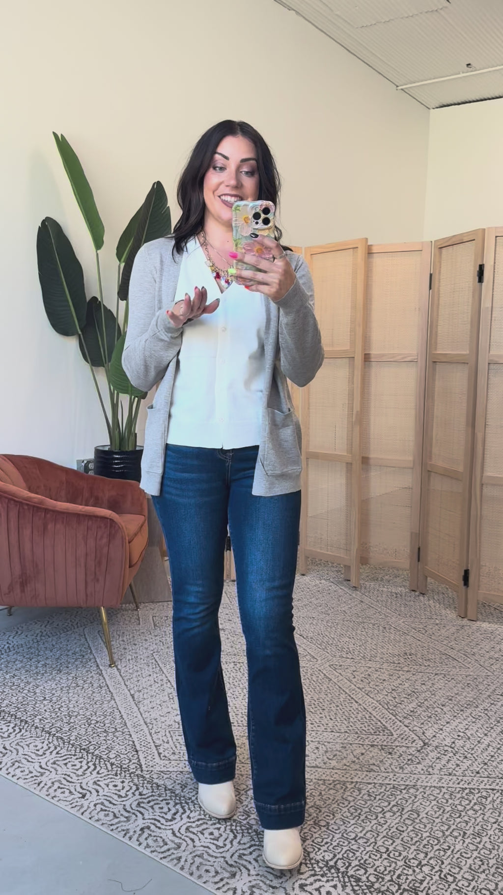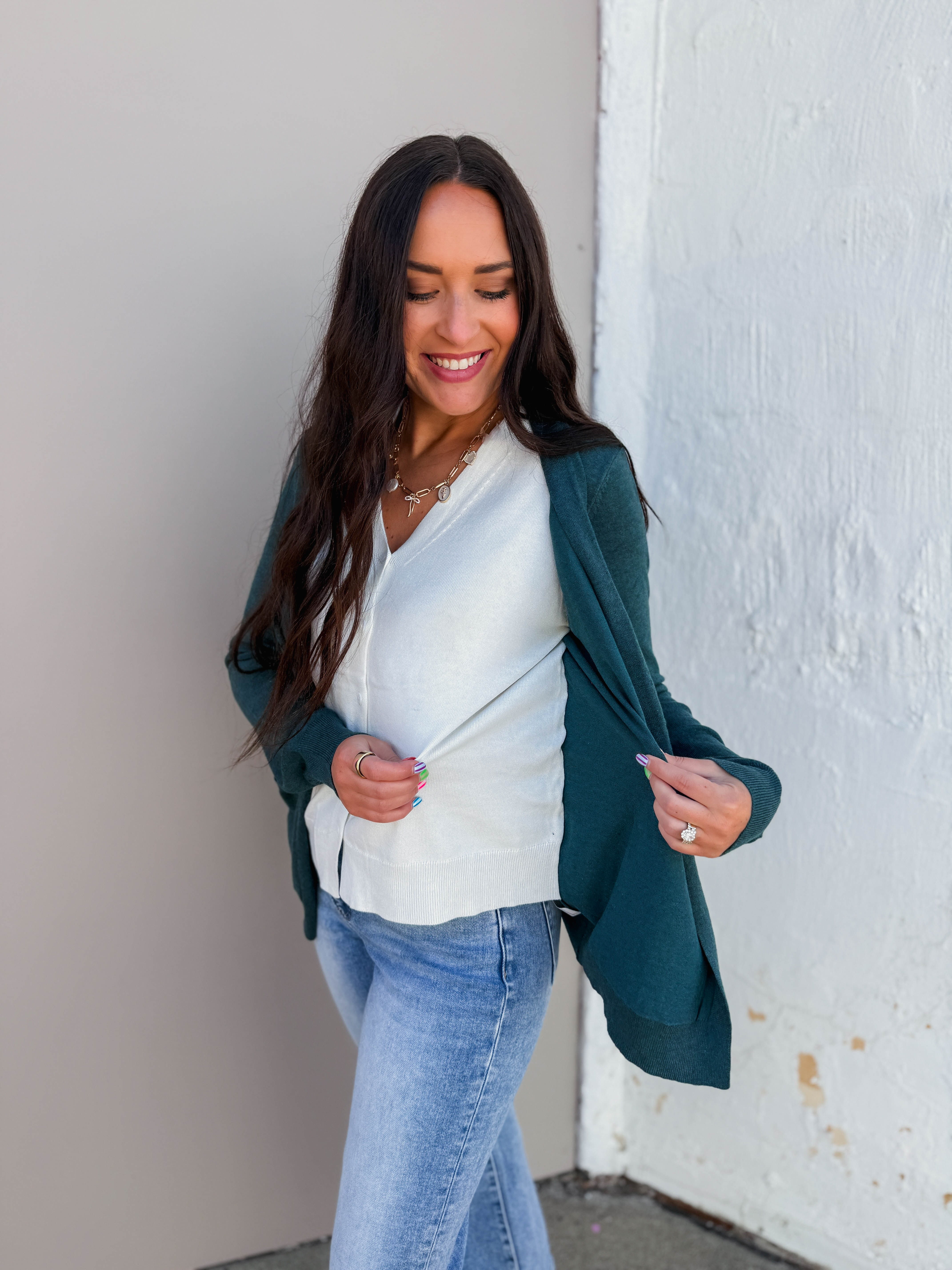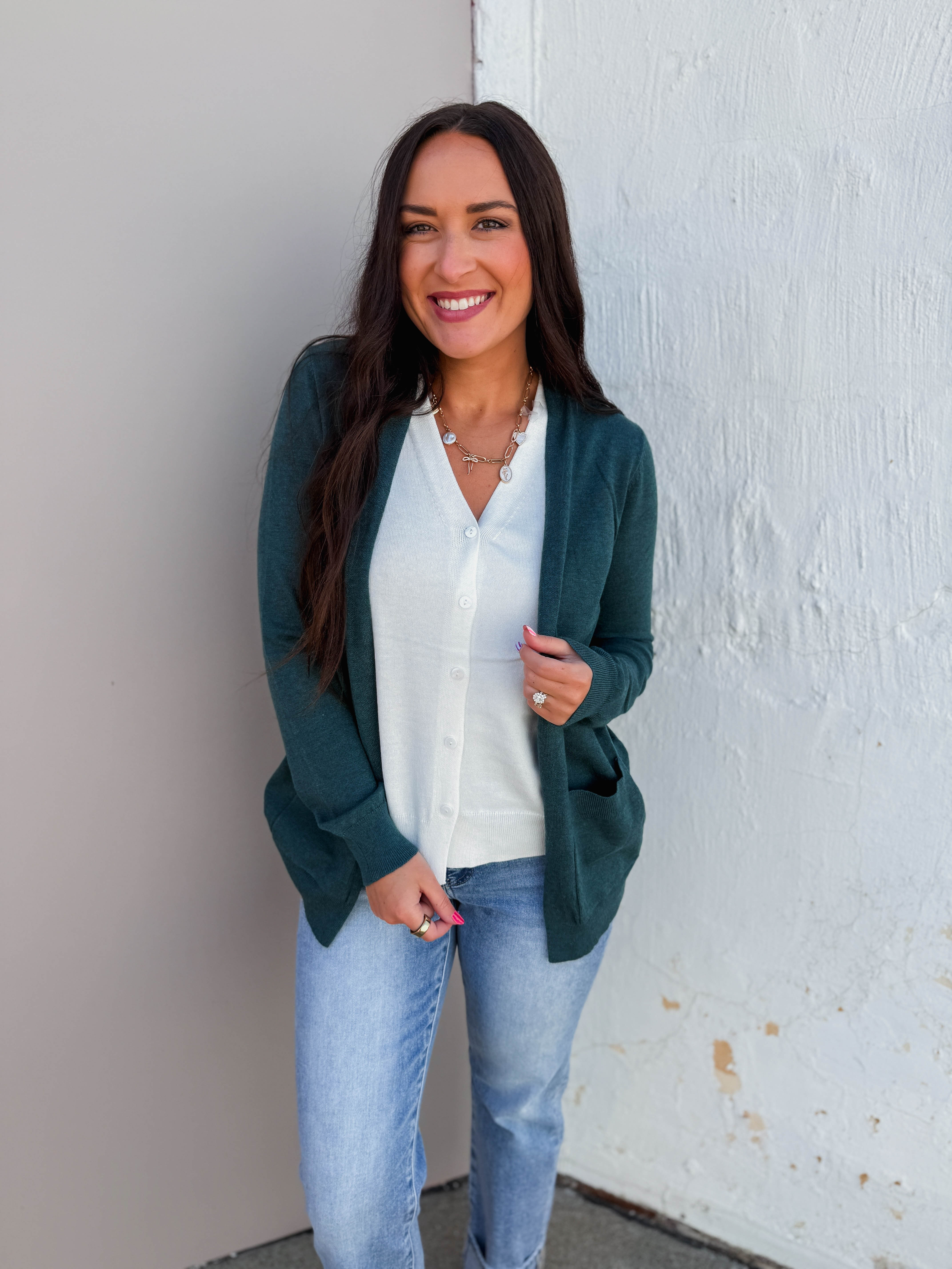 The Brandy Cardigan in Dark Jade is your go-to cozy companion. Featuring a playful V-neck contrast, button-front closure, and handy front pockets, it layers effortlessly from work to weekend. Long sleeves and a soft inner layer make it the perfect easy throw-on top for any day.