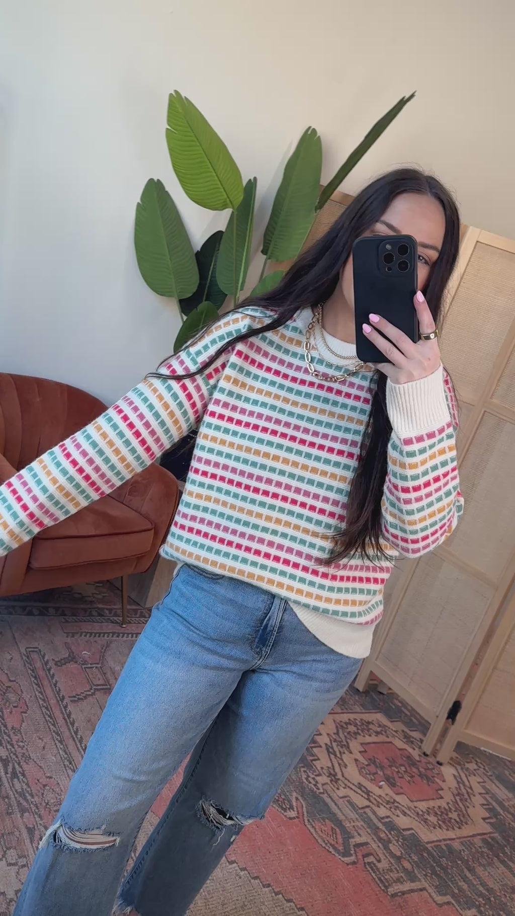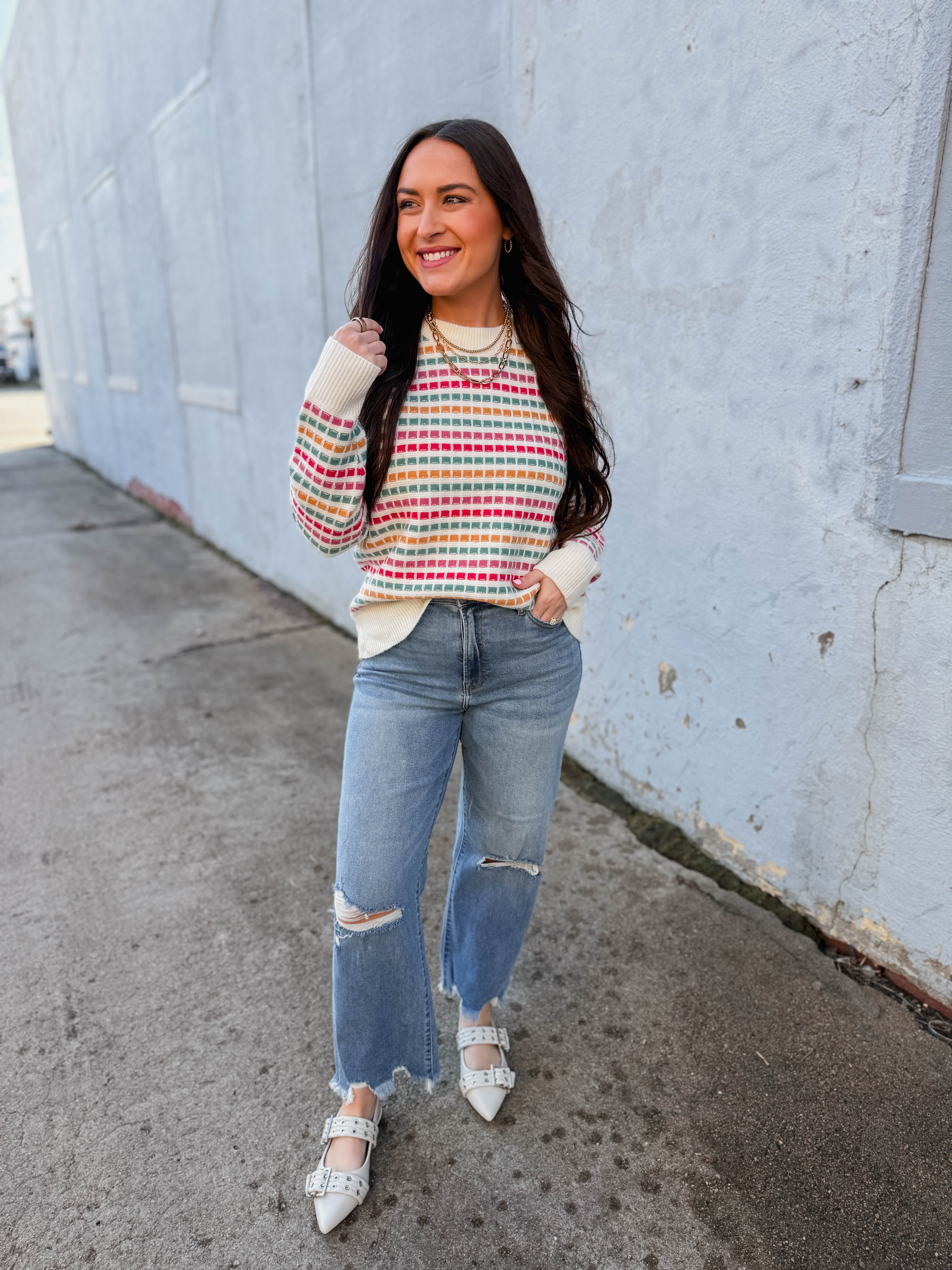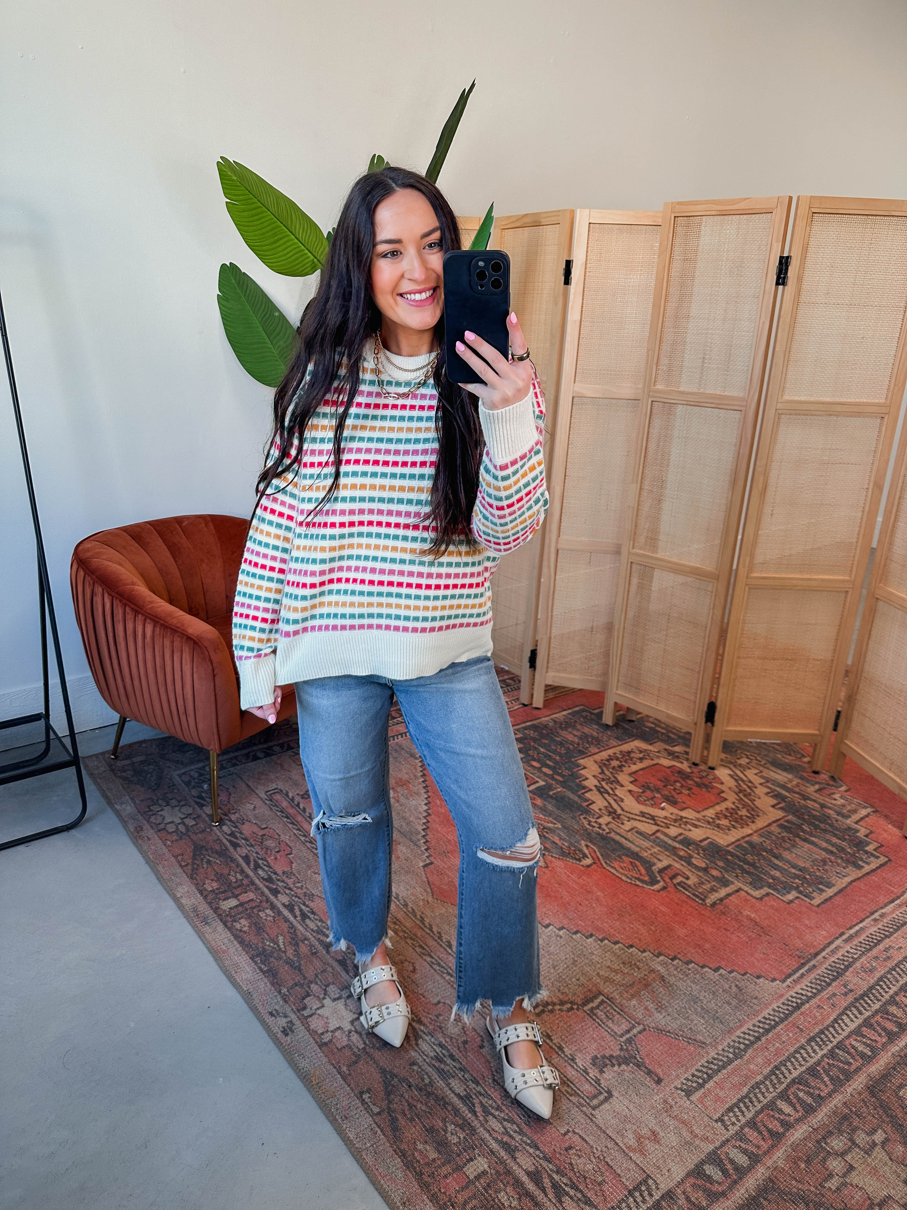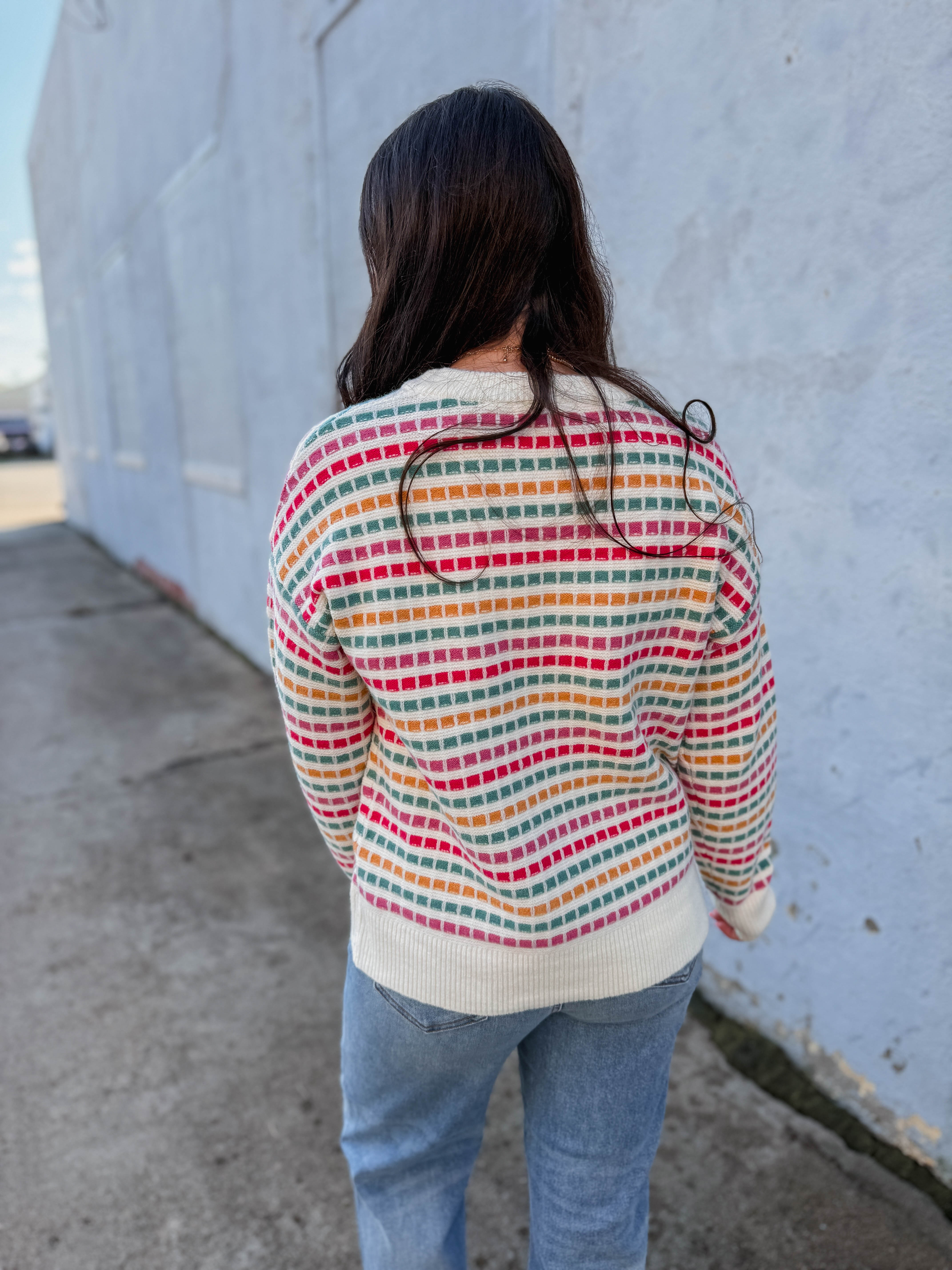 Add a fun pop of color to your look with the Everly Sweater. Featuring multi-color textured stripes, a classic crew neck, and ribbed hems, it's perfect for work to weekend style with cozy long sleeves that keep you comfortable all day.