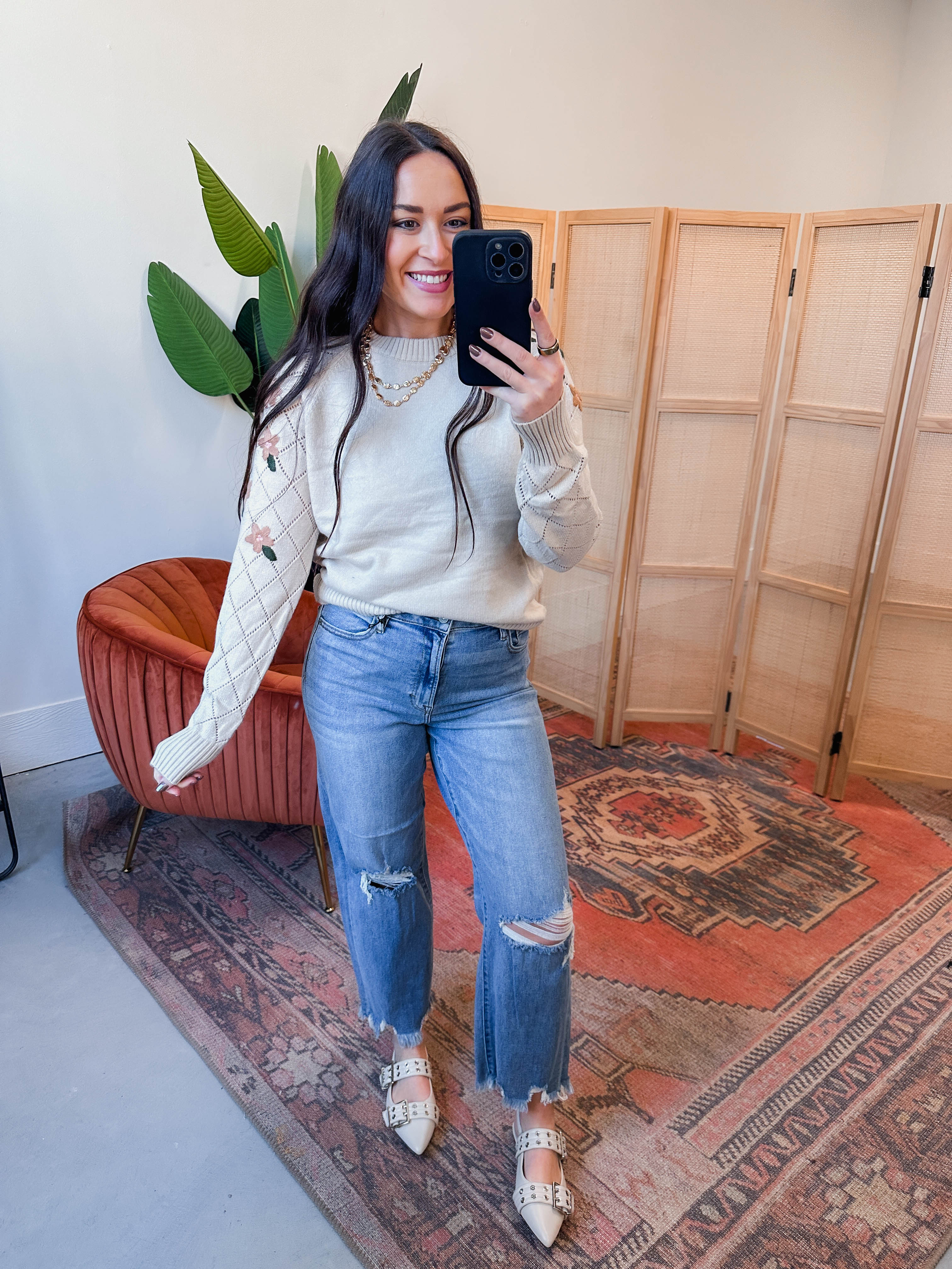 Cozy up in the Hazel Floral Embroidered Sweater, featuring a classic crew neckline and long sleeves. Delicate floral embroidery adds a touch of charm, while ribbed hems keep the fit snug. Perfect for effortlessly stylish looks from work to weekend fun!