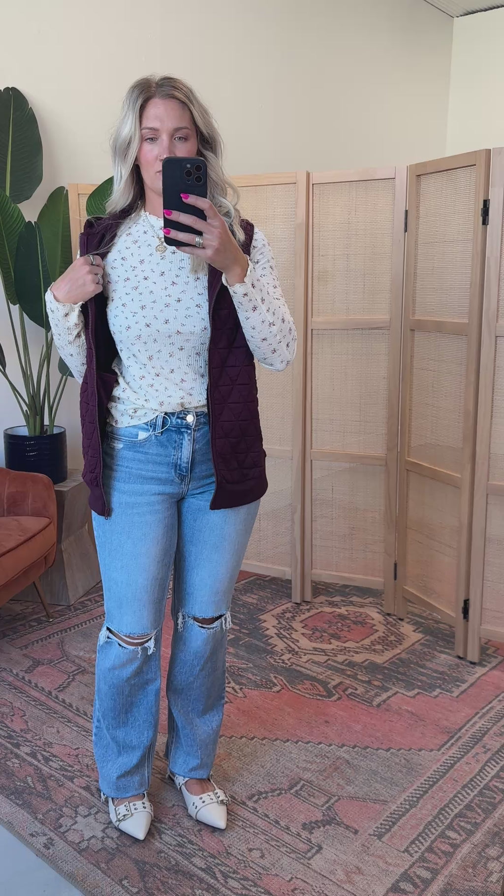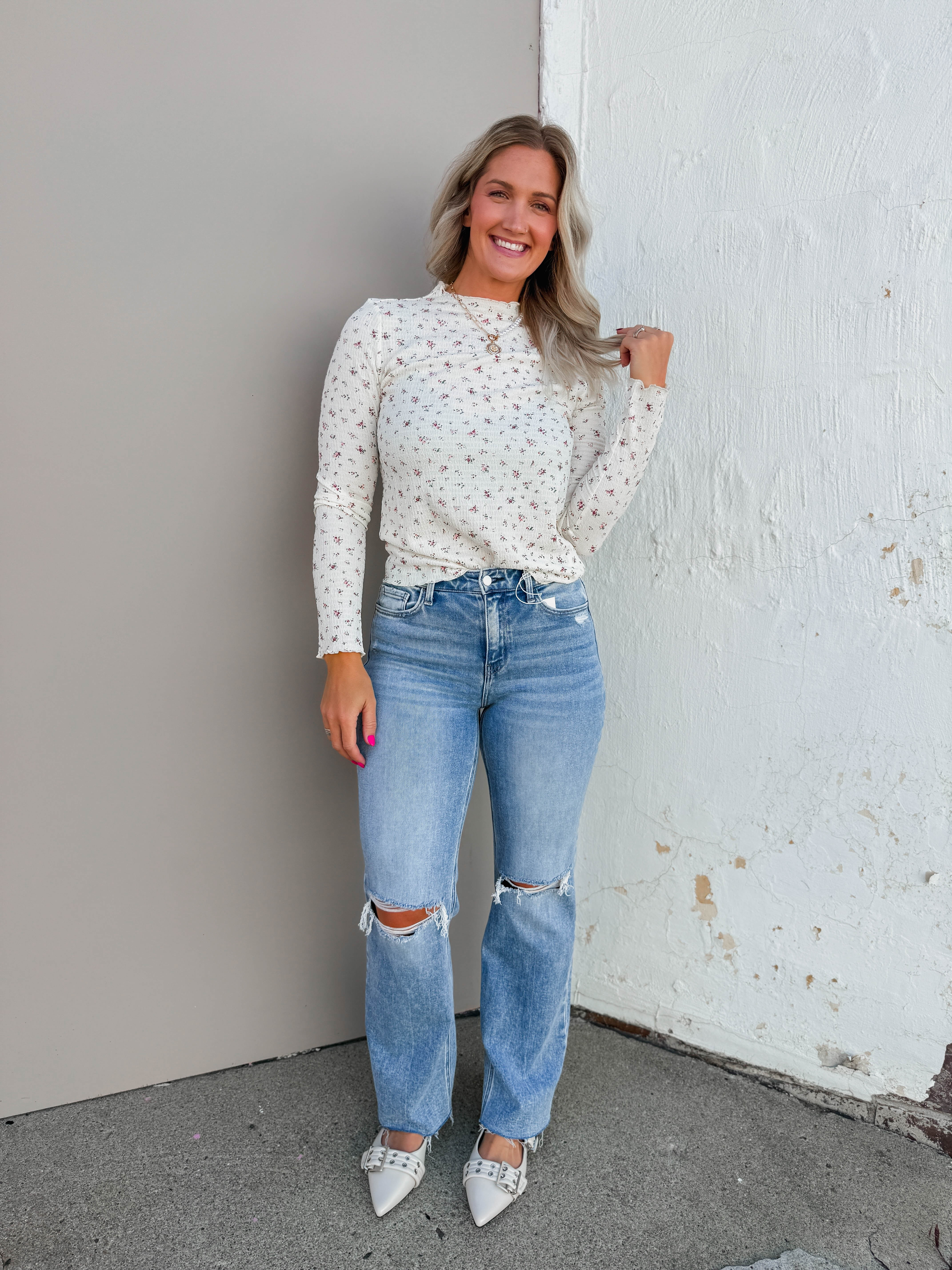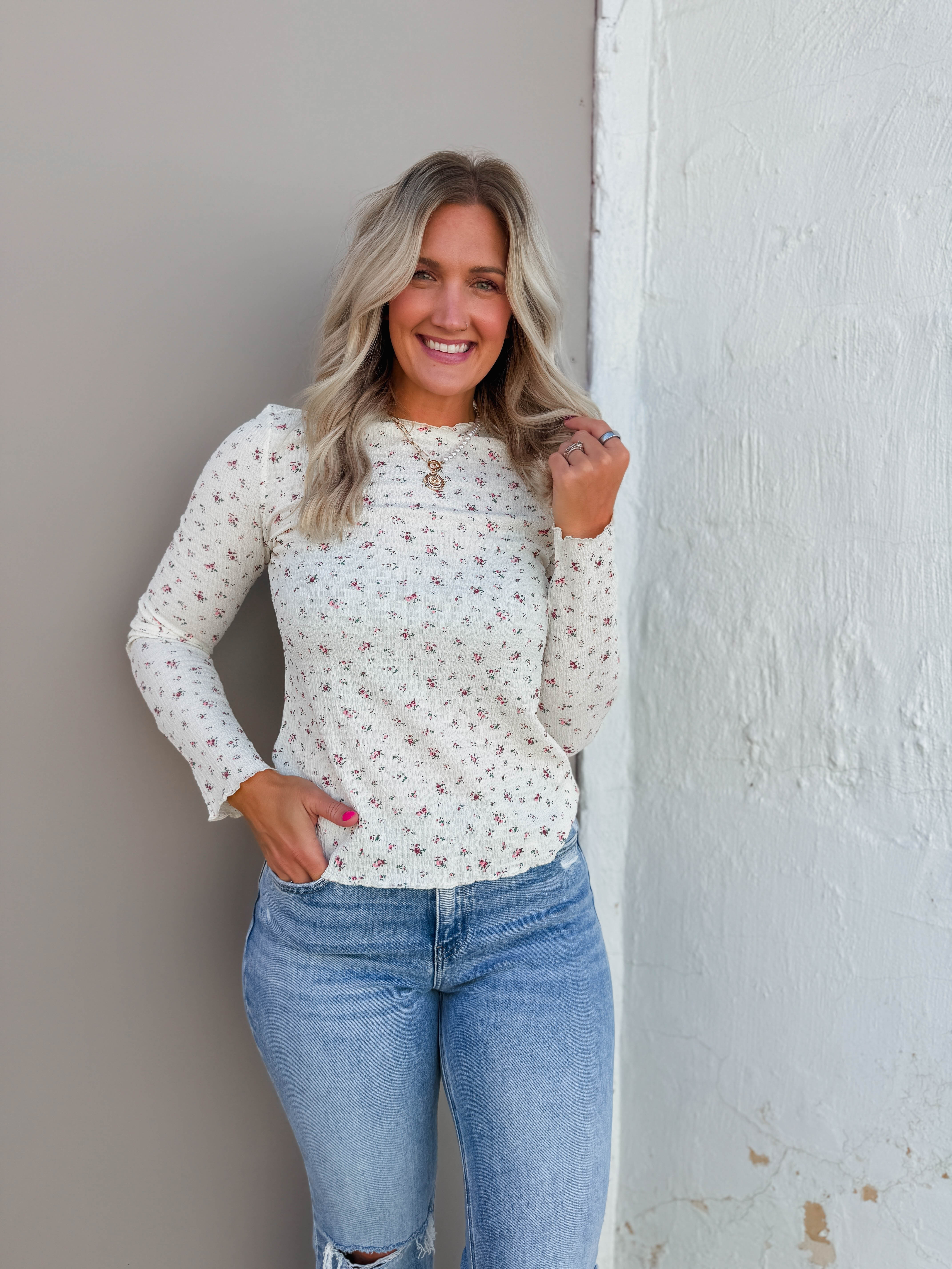 Brighten your fall wardrobe with the Heidi Floral Top. Featuring a playful crinkled knit and charming floral print, this long-sleeve style with a mock neckline effortlessly transitions from work to weekend. Cozy, cute, and ready for cooler days!