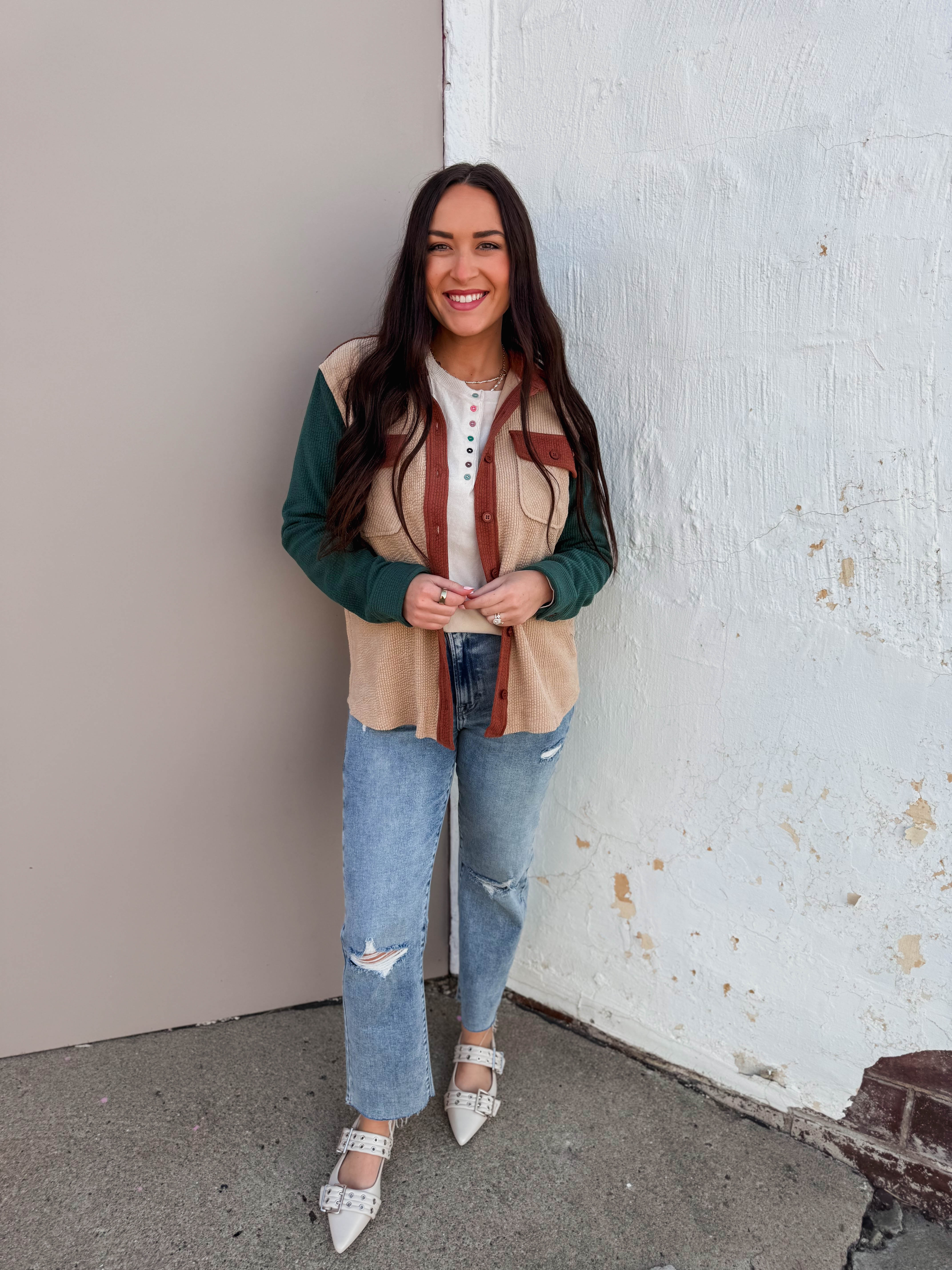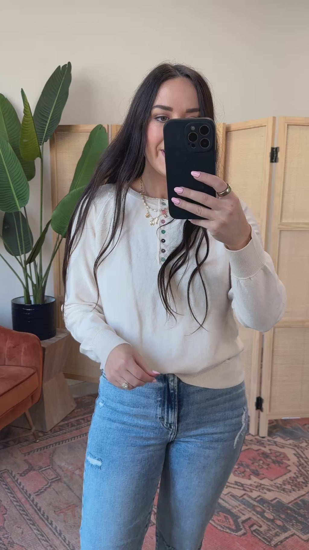 The Ingrid Henley Sweater combines cozy softness with a playful twist. Featuring a classic Henley neck and long sleeves, it’s lightweight enough for all-day comfort. Bright multi-color buttons add a subtle pop of fun, making it perfect for work or weekend vibes.