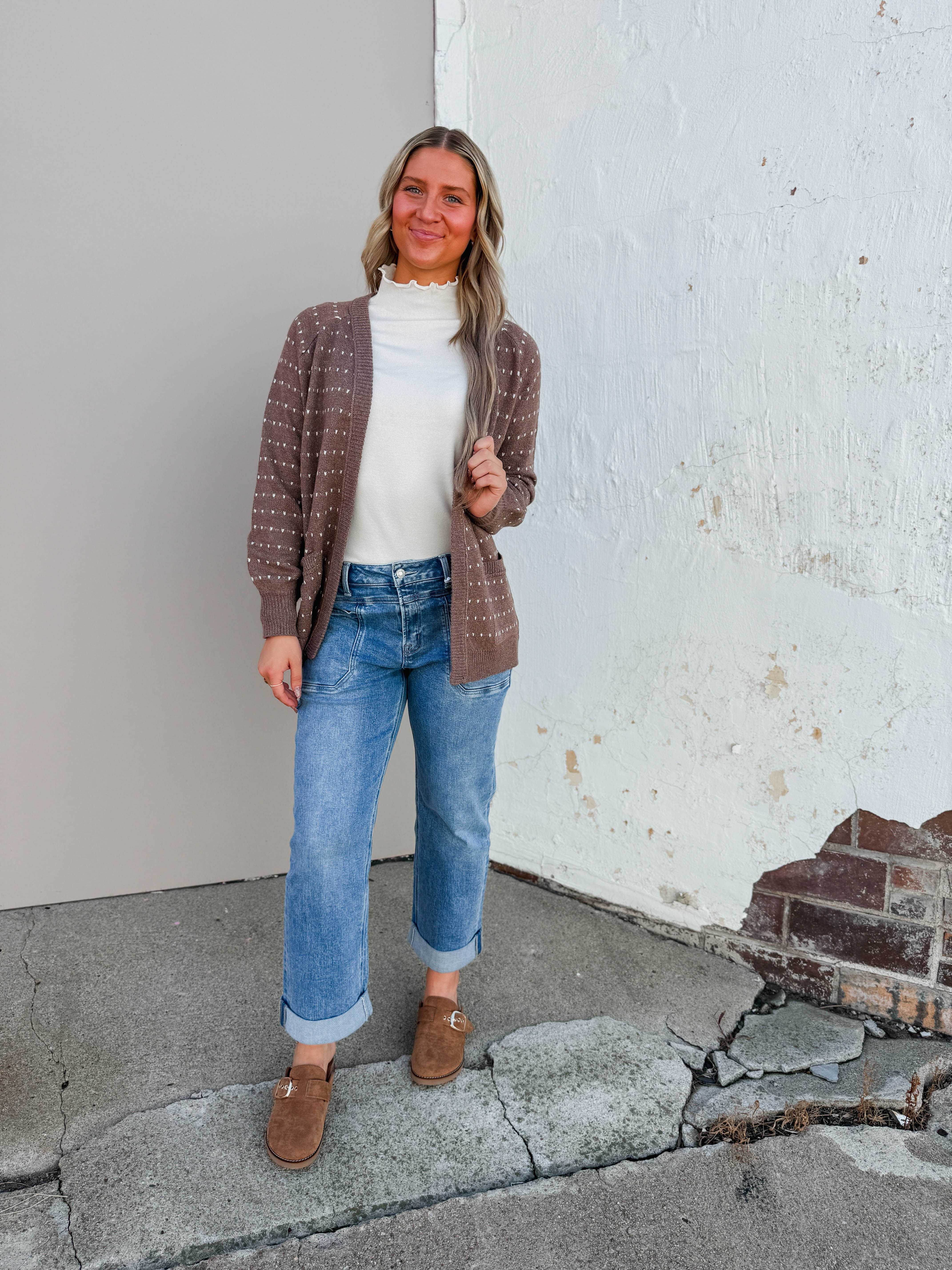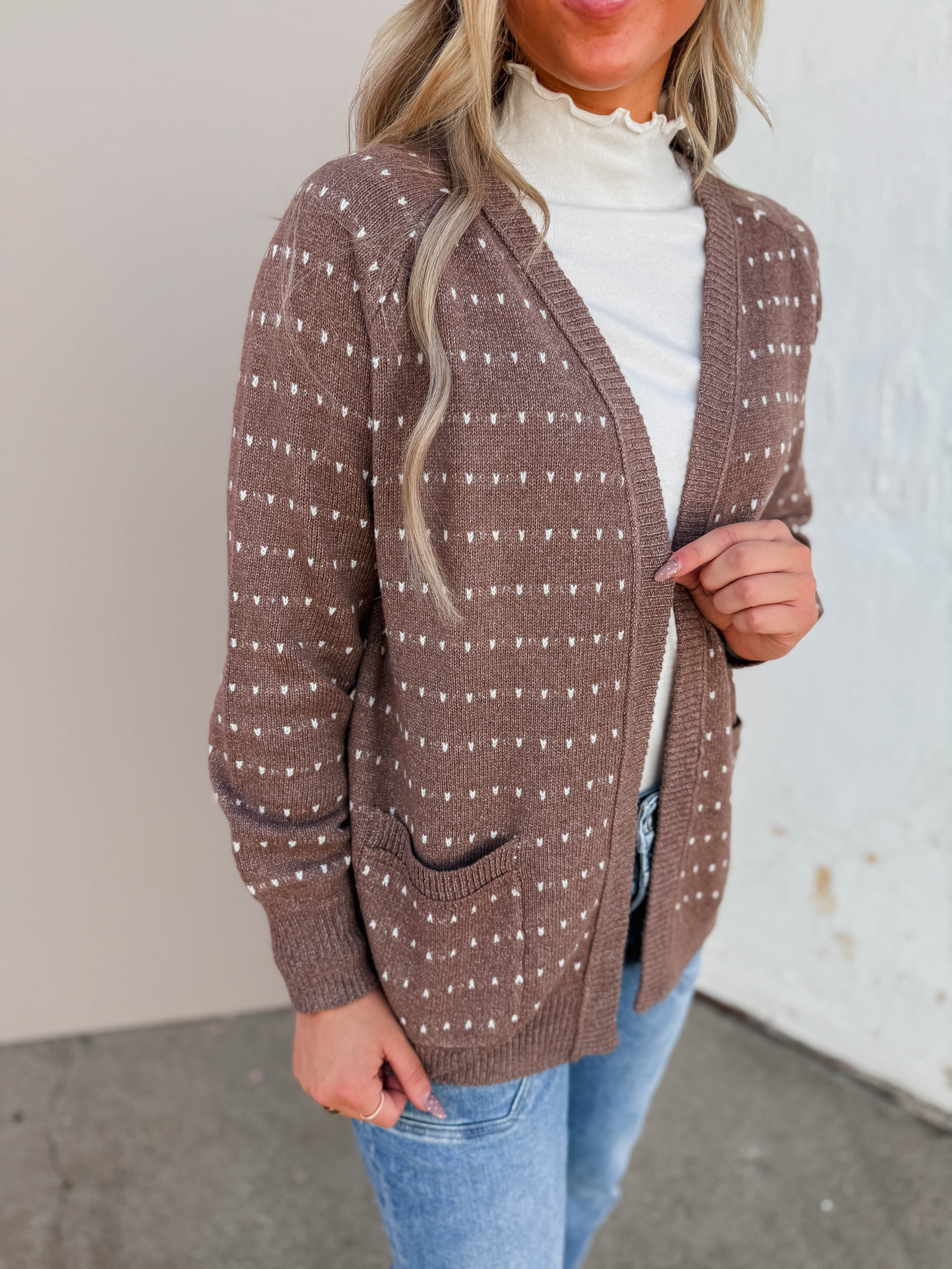 The Jillian Cardigan is your go-to for effortless style from work to weekend. Featuring an open front, cozy long sleeves, playful dotted stripes, and handy patch pockets, it’s comfy and cute all day long.